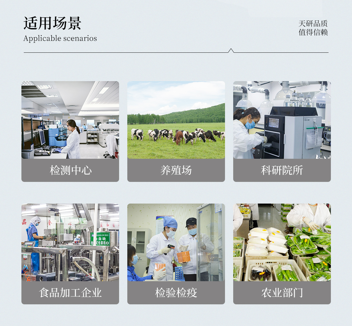 | 食品添加劑:二氧化硫、雙氧水、亞硝酸鹽、硝酸鹽、苯甲酸鈉、山梨酸鉀、糖精鈉、甜蜜素、木耳硫酸鎂等 | 有毒有害物質(zhì):甲醛、吊白塊、硼砂、過氧化苯甲酰、溴酸鉀、羅丹明B、三聚氰胺、蘇丹紅、工業(yè)堿、尿素、明礬等 | 果蔬:農(nóng)藥殘留(酶抑制率法) | 病害肉診斷:組胺、揮發(fā)性鹽基氮; | 重金屬含量:鉛、鎘、鉻、汞、砷、錫、鎳、鋁等; | 食用油脂: 過氧化值、酸價等 | 瘦肉精激素類(獸藥):鹽酸克倫特羅、沙丁胺醇、萊克多巴胺、己烯雌酚等 | 抗生素殘留類(獸藥):四環(huán)素類、硝基呋喃類、磺胺類、β-興奮劑類、沙星類、磺胺類、喹諾酮類,甲砜霉素,氟苯尼考,金剛烷胺、替米考星、慶大霉素、林可霉素、鏈霉素、恩諾沙星、環(huán)丙沙星、頭孢啦啶、青霉素、阿莫西林等 | 真菌毒素類:食用油、糧食及飼料中黃曲霉毒素B1、黃曲霉毒素總量,奶中黃曲霉毒素M1、嘔吐毒素、玉米赤霉烯酮、赭曲霉毒素A、T2毒素、伏馬毒素等; | 水酒飲品分析:酒中甲醇、乙醇、乳品及牛奶中蛋白質(zhì), | 調(diào)味品成分:食醋的總酸、醬油的總酸、芝麻油純度、谷氨酸鈉、醬油氨基酸態(tài)氮、食鹽中亞鐵氰化鉀、食鹽中碘等 | 食用色素類:紅色色素(胭脂紅、莧菜紅、赤蘚紅、誘惑紅)、黃色色素(檸檬黃、日落黃)、藍(lán)色色素(亮藍(lán))等 | 動物疫病類:禽流感、新城疫、牛羊口蹄疫、牛羊結(jié)核病、牛羊包蟲、牛羊布病、小反芻獸、豬藍(lán)耳病毒、豬瘟病毒、豬偽狂犬病毒、豬細(xì)小、豬圓環(huán)、犬細(xì)小病毒、犬瘟熱病毒、犬狂犬病毒等; | 蜂蜜成分:果糖和葡萄糖、蔗糖、淀粉酶、酸度等 | 水產(chǎn)品安全類:孔雀石綠、氯霉素、呋喃妥因、呋喃西林、呋喃它酮、呋喃唑酮等 | 蛋類藥物殘留:氯霉素,四環(huán)素,磺胺類,喹諾酮類,呋喃西林,呋喃它酮,呋喃妥因,呋喃唑酮,氟苯尼考,阿莫西林、頭孢氨芐、紅霉素、鏈霉素等 |