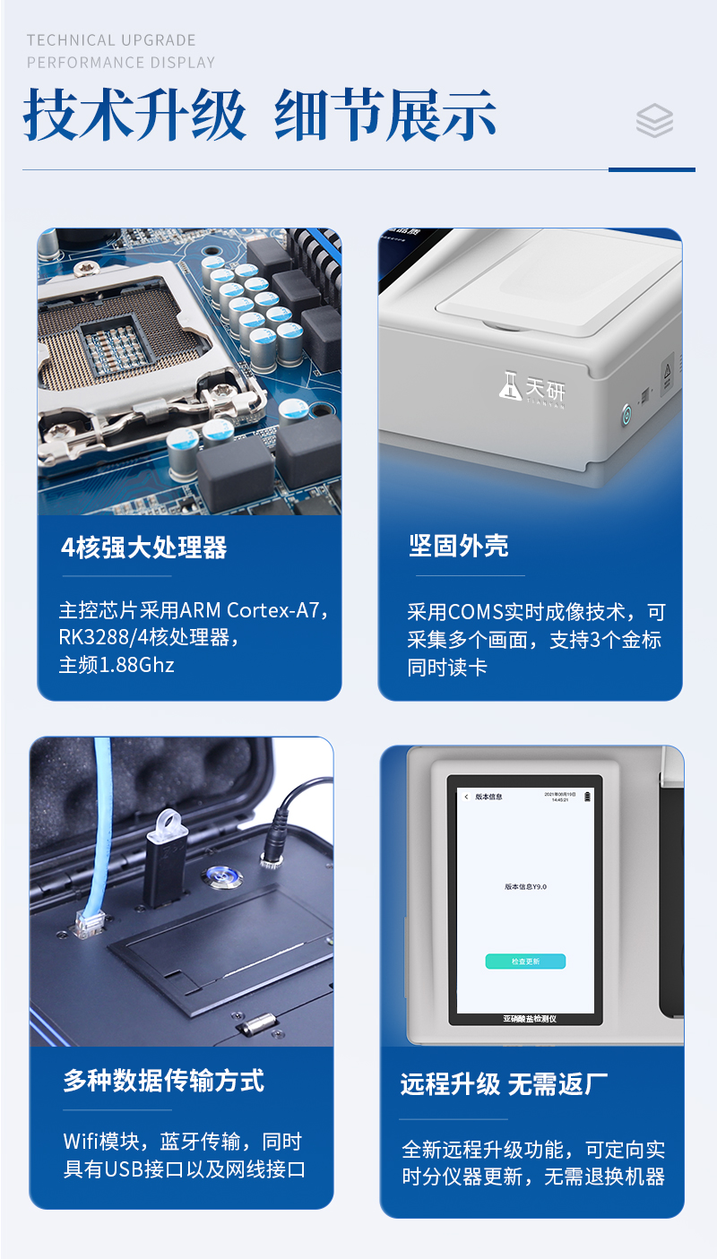 | 儀器采用臺(tái)式一體化系統(tǒng)檢測(cè)技術(shù),將分光光度模塊、數(shù)字化管理模塊、無(wú)線(xiàn)通訊模塊高度集成于一體,可支持檢測(cè)60種食品安全檢測(cè)項(xiàng)目,同時(shí)預(yù)留升級(jí)檢測(cè)方法。 | 儀器檢測(cè)模塊標(biāo)準(zhǔn)化、智能化,檢測(cè)項(xiàng)目可隨意自由組合。檢測(cè)箱體內(nèi)置多個(gè)標(biāo)準(zhǔn)檢測(cè)單元,檢測(cè)模塊可以調(diào)整配置。 | 顯示屏幕:儀器采用10.1英寸豎向液晶觸摸屏顯,搭配運(yùn)行安卓智能操作系統(tǒng),主控芯片采用ARM Cortex-A7,RK3288/4核處理器,主頻1.88Ghz,操作方便,性能更強(qiáng)。 | 檢測(cè)通道:≥12通道;采用精密旋轉(zhuǎn)比色池設(shè)計(jì),使用同芯片同光源校準(zhǔn)精度,解決不同光源之間的誤差值,更加準(zhǔn)確**。(1-12通道間誤差0.1%,**號(hào):ZL202022821055.2) | 儀器光源:高精度進(jìn)口四波長(zhǎng)冷光源,每個(gè)通道均配置 410、520、590、630nm 波長(zhǎng)光源,標(biāo)配**的光路切換裝置,**光路切換功能可實(shí)現(xiàn)64波長(zhǎng),并且所有檢測(cè)項(xiàng)目可實(shí)現(xiàn)所有通道同時(shí)檢測(cè)。 | 設(shè)備可一鍵校準(zhǔn),自動(dòng)保存校準(zhǔn)數(shù)據(jù),自動(dòng)對(duì)比校驗(yàn),得到精準(zhǔn)光源,采用Android SP存儲(chǔ)數(shù)據(jù),光源數(shù)據(jù)永不丟失,方便每一次使用。 | 通訊接口:配備無(wú)線(xiàn)通信模塊、4G(APN)通訊模塊、藍(lán)牙傳輸,同時(shí)具有雙USB接口以及RJ45網(wǎng)線(xiàn)接口,可以多方式實(shí)現(xiàn)數(shù)據(jù)保存及數(shù)據(jù)傳輸。 | 存儲(chǔ)方式:支持U盤(pán)存儲(chǔ),標(biāo)準(zhǔn)USB接口,免驅(qū)動(dòng)安裝。檢測(cè)結(jié)果存儲(chǔ)容量20萬(wàn)條以上,可生成Excel表格進(jìn)行拷貝,并具有登錄保護(hù)功能。 | 智能化操作系統(tǒng): | 1、操作系統(tǒng):儀器可在同一檢測(cè)界面自動(dòng)對(duì)應(yīng)相關(guān)檢測(cè)通道,一次性選擇1-12個(gè)樣品名稱(chēng),無(wú)需退出界面,節(jié)省操作時(shí)間。并可以對(duì)每個(gè)通道屬性和樣品信息單獨(dú)進(jìn)行編輯,例如送檢單位、人員,檢測(cè)人員等,打印時(shí)勾選打印顯示。 | 2、數(shù)據(jù)集成系統(tǒng):設(shè)備首頁(yè)自動(dòng)匯總分析檢測(cè)數(shù)據(jù),包含:周檢測(cè)數(shù)據(jù)、月檢測(cè)數(shù)據(jù),全部檢測(cè)總數(shù)量,均包含檢測(cè)總數(shù),合格數(shù),不合格數(shù),以及相關(guān)柱形分析圖,各項(xiàng)檢測(cè)數(shù)據(jù)一目了然,無(wú)需電腦查詢(xún),更加快捷直觀(guān)。 | 3、數(shù)據(jù)庫(kù)系統(tǒng):十幾項(xiàng)數(shù)據(jù)庫(kù)分類(lèi)管理儀器:包含項(xiàng)目類(lèi)型、項(xiàng)目數(shù)據(jù)、檢測(cè)數(shù)據(jù)、歷史記錄、國(guó)標(biāo)信息、曲線(xiàn)信息、采樣信息、檢測(cè)信息、受檢信息、復(fù)核信息、圖表信息、光源校準(zhǔn)信息、打印樣式信息、樣品庫(kù)信息等等,數(shù)據(jù)庫(kù)之間互相協(xié)調(diào)聯(lián)動(dòng)保證數(shù)據(jù)的真實(shí)完整性。同時(shí)產(chǎn)品數(shù)據(jù)庫(kù)以及歷史檢測(cè)記錄支持一鍵檢索功能。 | 4、限量規(guī)判系統(tǒng):具有限量查詢(xún)、添加物質(zhì)合規(guī)判定系統(tǒng)。檢測(cè)出結(jié)果后,系統(tǒng)自動(dòng)調(diào)用系統(tǒng)數(shù)據(jù)庫(kù)中相關(guān)國(guó)標(biāo)進(jìn)行比對(duì)判定,客觀(guān)顯示判定結(jié)果是否合格。 | 5、項(xiàng)目預(yù)設(shè)系統(tǒng):儀器具有任務(wù)預(yù)設(shè)模塊,一鍵提前預(yù)設(shè),給出方便快捷的新檢測(cè)方案,每一個(gè)任務(wù)分別可以設(shè)置不同的樣品、批次、編號(hào)、來(lái)源、備注、抽樣信息、檢測(cè)信息、受檢信息、復(fù)核信息等更多信息。樣品送檢時(shí)一鍵調(diào)取保存信息,并可多次調(diào)取,大大提高檢測(cè)效率。 | 6、數(shù)據(jù)監(jiān)管系統(tǒng):同步對(duì)接監(jiān)管平臺(tái),數(shù)據(jù)可局域網(wǎng)和互聯(lián)網(wǎng)數(shù)據(jù)上傳,檢測(cè)結(jié)果可選擇直接傳至食品安全監(jiān)管平臺(tái)。進(jìn)行區(qū)域食品安全監(jiān)管及大數(shù)據(jù)分析處理與數(shù)據(jù)統(tǒng)計(jì),檢測(cè)區(qū)域食品安全長(zhǎng)短期動(dòng)態(tài),達(dá)到食品安全問(wèn)題預(yù)估、預(yù)警。 | 7.1、全新打印系統(tǒng):內(nèi)置全新打印機(jī),新創(chuàng)自定義打印方式,可按需靈活勾選控制:二維碼,抽樣信息、檢測(cè)信息,受檢信息、復(fù)核信息、抽樣日期、檢測(cè)日期等信息的打印。 | 7.2、A4紙版本報(bào)告打印功能(可選配):設(shè)備擁有兩種結(jié)果展示方式,可以自動(dòng)生成A4打印模板和小票打印模板兩種樣式,可通過(guò)WiFi及網(wǎng)線(xiàn)等方式鏈接外置打印機(jī)可進(jìn)行打印。 | 8.供電模式:儀器交直流兩用,直流12V供電,可連接車(chē)載電源,可配6ah大容量充電鋰電池,電量可實(shí)時(shí)顯示,方便戶(hù)外流動(dòng)測(cè)試。 | 9.儀器具備遠(yuǎn)程升級(jí)功能,可定向分客戶(hù)分儀器更新,開(kāi)機(jī)后自動(dòng)更新,并可持續(xù)性免費(fèi)更新系統(tǒng)版本,無(wú)需像傳統(tǒng)產(chǎn)品返廠(chǎng)更新,節(jié)省時(shí)間及人力成本并避免