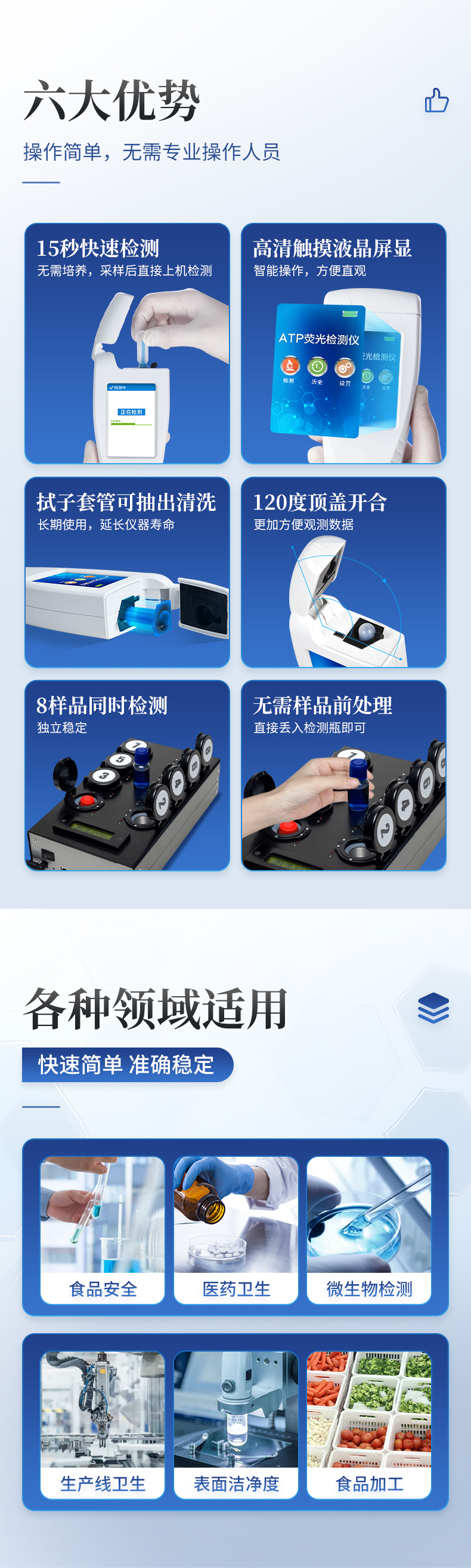 | 實用性 —— 可根據(jù)環(huán)境檢測需求設定上下限值,做到數(shù)據(jù)快速評估預警,表面潔凈度快速篩查。 | 速度快 —— 常規(guī)培養(yǎng)法18-24h以上,而ATP只需要十幾秒鐘 . | 可行性 —— 微生物數(shù)量與微生物體內(nèi)所含ATP有明確的相關性。 通過檢測ATP含量,可間接得出反應中微生物數(shù)量 | 可操作性 —— 傳統(tǒng)培養(yǎng)方法需要在實驗室由經(jīng)過培訓的技術人員進行操作;而ATP快速潔凈度檢測操作非常簡便,只需簡單的培訓即可由一般工作人員進行現(xiàn)場操作。 | 體驗更好 —— 試子套管采用插拔式靈活設計,可定期清洗長期使用,延長儀器壽命。 |