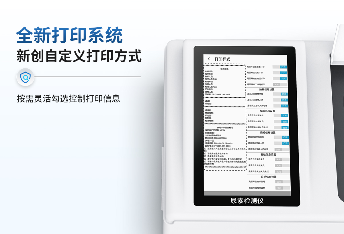 | 儀器采用臺(tái)式一體化系統(tǒng)檢測(cè)技術(shù),將分光光度模塊、數(shù)字化管理模塊、無(wú)線通訊模塊高度集成于一體,可支持檢測(cè)60種食品安全檢測(cè)項(xiàng)目,同時(shí)預(yù)留升級(jí)檢測(cè)方法。 | 儀器檢測(cè)模塊標(biāo)準(zhǔn)化、智能化,檢測(cè)項(xiàng)目可隨意自由組合。檢測(cè)箱體內(nèi)置多個(gè)標(biāo)準(zhǔn)檢測(cè)單元,檢測(cè)模塊可以調(diào)整配置。 | 顯示屏幕:儀器采用10.1英寸豎向液晶觸摸屏顯,搭配運(yùn)行安卓智能操作系統(tǒng),主控芯片采用ARM Cortex-A7,RK3288/4核處理器,主頻1.88Ghz,操作方便,性能更強(qiáng)。 | 檢測(cè)通道:≥12通道;采用精密旋轉(zhuǎn)比色池設(shè)計(jì),使用同芯片同光源校準(zhǔn)精度,解決不同光源之間的誤差值,更加準(zhǔn)確**。(1-12通道間誤差0.1%,**號(hào):ZL202022821055.2) | 儀器光源:高精度進(jìn)口四波長(zhǎng)冷光源,每個(gè)通道均配置 410、520、590、630nm 波長(zhǎng)光源,標(biāo)配**的光路切換裝置,**光路切換功能可實(shí)現(xiàn)64波長(zhǎng),并且所有檢測(cè)項(xiàng)目可實(shí)現(xiàn)所有通道同時(shí)檢測(cè)。 | 設(shè)備可一鍵校準(zhǔn),自動(dòng)保存校準(zhǔn)數(shù)據(jù),自動(dòng)對(duì)比校驗(yàn),得到精準(zhǔn)光源,采用Android SP存儲(chǔ)數(shù)據(jù),光源數(shù)據(jù)永不丟失,方便每一次使用。 | 通訊接口:配備無(wú)線通信模塊、4G(APN)通訊模塊、藍(lán)牙傳輸,同時(shí)具有雙USB接口以及RJ45網(wǎng)線接口,可以多方式實(shí)現(xiàn)數(shù)據(jù)保存及數(shù)據(jù)傳輸。 | 存儲(chǔ)方式:支持U盤(pán)存儲(chǔ),標(biāo)準(zhǔn)USB接口,免驅(qū)動(dòng)安裝。檢測(cè)結(jié)果存儲(chǔ)容量20萬(wàn)條以上,可生成Excel表格進(jìn)行拷貝,并具有登錄保護(hù)功能。 | 智能化操作系統(tǒng): | 便捷操作系統(tǒng):設(shè)備檢測(cè)時(shí)可在同一檢測(cè)界面自動(dòng)對(duì)應(yīng)相關(guān)檢測(cè)通道一次性選擇1-12個(gè)樣品名稱,無(wú)須退出界面,節(jié)省操作時(shí)間。 | 數(shù)據(jù)集成系統(tǒng):設(shè)備首頁(yè)自動(dòng)統(tǒng)計(jì)檢測(cè)數(shù)據(jù)包含:周檢測(cè)數(shù)據(jù)、月檢測(cè)數(shù)據(jù),全部檢測(cè)總數(shù)量,均包含檢測(cè)總數(shù),合格數(shù),不合格數(shù),以及相關(guān)柱形分析圖,對(duì)各項(xiàng)檢測(cè)數(shù)據(jù)清晰掌握,無(wú)需電腦查詢,更加快捷直觀。 | 數(shù)據(jù)庫(kù)系統(tǒng):十幾項(xiàng)數(shù)據(jù)庫(kù)分類管理儀器:包含項(xiàng)目類型、項(xiàng)目數(shù)據(jù)、檢測(cè)數(shù)據(jù)、歷史記錄、國(guó)標(biāo)信息、曲線信息、采樣信息、檢測(cè)信息、受檢信息、復(fù)核信息、圖表信息、光源校準(zhǔn)信息、打印樣式信息、樣品庫(kù)信息等等,數(shù)據(jù)庫(kù)之間互相協(xié)調(diào)聯(lián)動(dòng)保證數(shù)據(jù)的真實(shí)完整性。同時(shí)產(chǎn)品數(shù)據(jù)庫(kù)以及歷史檢測(cè)記錄支持一鍵檢索功能。 | 限量規(guī)判系統(tǒng):具有限量查詢、添加物質(zhì)合規(guī)判定系統(tǒng)。檢測(cè)出結(jié)果后,系統(tǒng)自動(dòng)調(diào)用系統(tǒng)數(shù)據(jù)庫(kù)中相關(guān)國(guó)標(biāo)進(jìn)行比對(duì)判定,客觀顯示判定結(jié)果是否合格。 | 項(xiàng)目預(yù)設(shè)系統(tǒng):儀器具有任務(wù)預(yù)設(shè)模塊,一鍵提前預(yù)設(shè),給出方便快捷的新檢測(cè)方案,每一個(gè)任務(wù)分別可以設(shè)置不同的樣品、批次、編號(hào)、來(lái)源、備注、抽樣信息、檢測(cè)信息、受檢信息、復(fù)核信息等更多信息。樣品送檢時(shí)一鍵調(diào)取保存信息,并可多次調(diào)取,大大提高檢測(cè)效率。 | 數(shù)據(jù)監(jiān)管系統(tǒng):同步對(duì)接監(jiān)管平臺(tái),數(shù)據(jù)可局域網(wǎng)和互聯(lián)網(wǎng)數(shù)據(jù)上傳,檢測(cè)結(jié)果可選擇直接傳至食品安全監(jiān)管平臺(tái)。進(jìn)行區(qū)域食品安全監(jiān)管及大數(shù)據(jù)分析處理與數(shù)據(jù)統(tǒng)計(jì),檢測(cè)區(qū)域食品安全長(zhǎng)短期動(dòng)態(tài),達(dá)到食品安全問(wèn)題預(yù)估、預(yù)警。 | 全新打印系統(tǒng):內(nèi)置全新打印機(jī),新創(chuàng)自定義打印方式,可按需靈活勾選控制:二維碼,抽樣信息、檢測(cè)信息,受檢信息、復(fù)核信息、抽樣日期、檢測(cè)日期等信息的打印。 | A4紙版本報(bào)告打印功能(可選配):設(shè)備擁有兩種結(jié)果展示方式,可以自動(dòng)生成A4打印模板和小票打印模板兩種樣式,可通過(guò)WiFi及網(wǎng)線等方式鏈接外置打印機(jī)可進(jìn)行打印。 | 供電模式:儀器交直流兩用,直流12V供電,可連接車載電源,可配6ah大容量充電鋰電池,電量可實(shí)時(shí)顯示,方便戶外流動(dòng)測(cè)試。 | 儀器具備遠(yuǎn)程升級(jí)功能,可定向分客戶分儀器更新,開(kāi)機(jī)后自動(dòng)更新,并可持續(xù)性免費(fèi)更新系統(tǒng)版本,無(wú)需像傳統(tǒng)產(chǎn)品返廠更新,節(jié)省時(shí)間及人力成本并避免了物流運(yùn)輸返廠升級(jí)導(dǎo)致設(shè)備損壞的潛在風(fēng)險(xiǎn)。 |