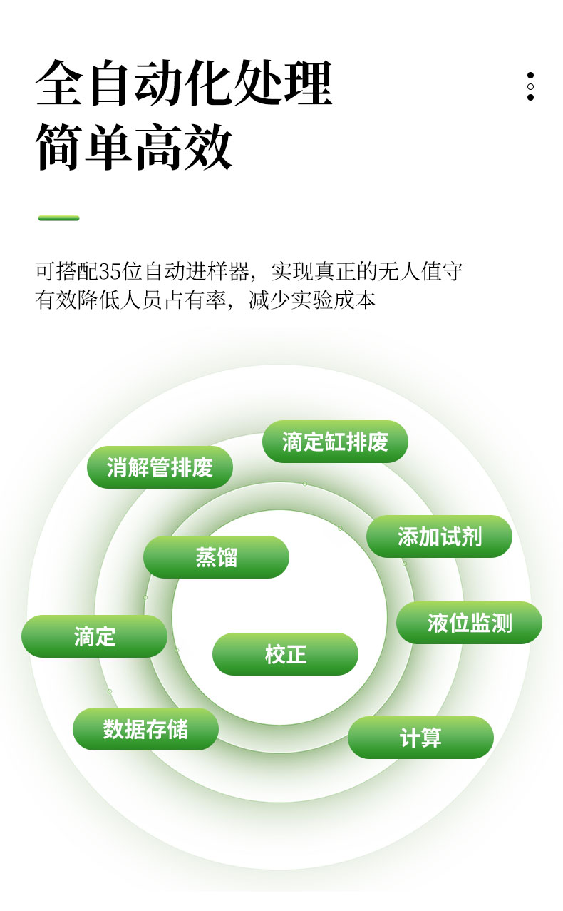 | 1.采用國家標(biāo)準(zhǔn)的凱氏定氮方法:濃硫酸環(huán)境消解樣品、堿性環(huán)境蒸汽蒸餾、硼酸吸收、指示劑滴定終點(diǎn)顏色判斷法。參與國家標(biāo)準(zhǔn)GB/T22923-2008、官方JJF109-2012《定氮儀校準(zhǔn)規(guī)范》的起草; | 2.☆全自動(dòng)添加試劑、蒸餾、滴定、消解管排廢、滴定缸排廢、校正、液位監(jiān)測、計(jì)算、數(shù)據(jù)存儲(chǔ)、生成測試報(bào)告并上傳,整個(gè)實(shí)驗(yàn)過程全自動(dòng)化處理簡單**; | 3.全自動(dòng)安全監(jiān)測:安全門、消化管到位監(jiān)測;蒸餾發(fā)生器具有壓力傳感器、蒸汽過壓保護(hù)、溫度傳感器、溫度保護(hù)開關(guān)、水位浮球與電位雙重檢測等多重保護(hù);蒸餾餾出液溫度和體積監(jiān)測,避免溫度過高或蒸餾體積波動(dòng)影響測試結(jié)果;冷卻水流量實(shí)時(shí)監(jiān)測,低水壓報(bào)警,停水自動(dòng)終止運(yùn)行;冷凝流出液溫度監(jiān)測,保障樣品完全冷凝,確保實(shí)驗(yàn)結(jié)果準(zhǔn)確可靠; | 4.☆可搭配35位自動(dòng)進(jìn)樣器,實(shí)現(xiàn)真正的無人值守,有效降低人員占有率,減少實(shí)驗(yàn)成本; | 5.全新的多核ARM操作系統(tǒng),中英文操作界面可選,10英寸LED高清彩色液晶觸摸屏實(shí)時(shí)監(jiān)測和顯示實(shí)驗(yàn)過程; | 6.☆四級權(quán)限分級功能,從程序管理員-主管理員-輔助管理員-操作員使用不同權(quán)限,內(nèi)置時(shí)間鎖數(shù)據(jù)鎖符合“GLP和GMP”規(guī)定; | 7.☆上位機(jī)采用windows操作軟件,具有測試數(shù)據(jù)、回收率計(jì)算及統(tǒng)計(jì)、測試報(bào)告自動(dòng)生成等功能,可方便用戶通過PC機(jī)對數(shù)據(jù)進(jìn)行分析、處理;數(shù)據(jù)處理軟件包具有數(shù)據(jù)跟蹤、審核、輸出功能,具有操作、審核、批準(zhǔn)、管理、維護(hù)五級管理功能,測試信息可靠、可溯源; | 8.☆可通過USB2.0接口使用U盤輸出數(shù)據(jù);儀器內(nèi)置WIFI模塊,網(wǎng)絡(luò)自動(dòng)識別,可通過無線通訊,將詳細(xì)的測試信息同步上傳至PC端處理; | 9.雙蒸餾模式,蒸汽流量0~100%任意可調(diào); | 10.外置滴定杯,實(shí)驗(yàn)過程實(shí)時(shí)可見,滴定系統(tǒng)照明配置與成熟的顏色終點(diǎn)判定軟件配合,使外界光源的影響降至**; | 11.高精度滴定系統(tǒng),專業(yè)一體式精工柱塞,確保測試精度和使用的可靠性; | 12.☆滴定系統(tǒng)采用動(dòng)態(tài)滴定技術(shù),可實(shí)現(xiàn)邊蒸餾邊滴定和滴定系統(tǒng)自動(dòng)判斷和切換滴定速度,真正達(dá)到蒸餾、滴定、計(jì)算過程同步完成,減少實(shí)驗(yàn)時(shí)間40%; | 13.滴定顏色可自動(dòng)與手動(dòng)校準(zhǔn)。滴定終點(diǎn)判定采用高精度的十六位三基色數(shù)字信號顏色傳感器采集顏色信號; | 14.☆儀器內(nèi)部可儲(chǔ)存100萬組數(shù)據(jù),云端可無限量儲(chǔ)存數(shù)據(jù)。測試結(jié)果可選擇包含Word、Excel等12種表示方式; | 15.耐強(qiáng)酸耐強(qiáng)堿液腐蝕隔膜試劑泵,超強(qiáng)的耐顆粒堵塞結(jié)構(gòu),加液穩(wěn)定,負(fù)壓抽吸無危險(xiǎn); | 16.☆防濺瓶采用高分子材質(zhì),耐高溫、強(qiáng)堿,同時(shí)保證氨氣不泄露,回收率不偏低; | 17.試劑桶液位監(jiān)測,保證實(shí)驗(yàn)過程不出現(xiàn)缺液問題。 | 18.儀器具備自檢功能、具備一鍵重置。 | 19.標(biāo)配2種工作模式根據(jù)需求可增配硝態(tài)氮、高氮自動(dòng)測試模塊。 | 20.☆304不銹鋼蒸餾反應(yīng)室,特氟龍?zhí)幚砜梢暟踩T。 | 21.貼合氨逸出規(guī)律特殊設(shè)計(jì)的蒸餾系統(tǒng),確保高可靠的測試回收率 | 22.儀器內(nèi)置操作助手儀器更智能化。 |