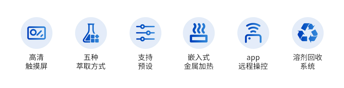| ?全部有機(jī)溶劑均可使用,包括苯類(lèi)、微類(lèi)、酮類(lèi) 等,滿(mǎn)足各種有機(jī)溶劑的使用條件 | ?采用全自動(dòng)標(biāo)準(zhǔn)索氏萃取,全通道為玻璃與四氟材質(zhì),有效避免雜質(zhì)的引入,準(zhǔn)確性高 | ?可以app遠(yuǎn)程操作控制,實(shí)現(xiàn)遠(yuǎn)程通訊功能,方便客戶(hù)實(shí)時(shí)查看實(shí)驗(yàn)允許情況 | ?采用一鍵開(kāi)始與暫停操作,實(shí)驗(yàn)過(guò)程掌控靈活 | ?外置壁掛型控制器,方便靈活,簡(jiǎn)單快捷 | ?采用七寸大液晶觸摸屏控制,顯示屏具有折疊功能,不用時(shí)可以收起不占用空間 | ?五種萃取方式,滿(mǎn)足不同客戶(hù)萃取需求 | ?預(yù)設(shè)常用試劑選項(xiàng),高頻次實(shí)驗(yàn)一鍵輕松搞定 | ?整體嵌入式金屬加熱,升溫更快,效率更高 | ?進(jìn)出水路溫度監(jiān)控與流量控制,配合冷凝水有無(wú)實(shí)時(shí)監(jiān)測(cè),保證有機(jī)蒸氣冷凝回流無(wú)泄漏的效果下,節(jié)約水資源 | ?具有高-效的溶劑回收系統(tǒng),有效減少試劑的浪費(fèi) |