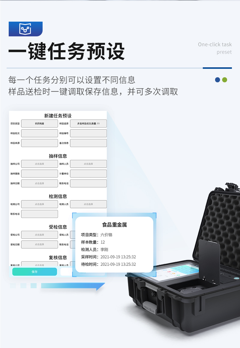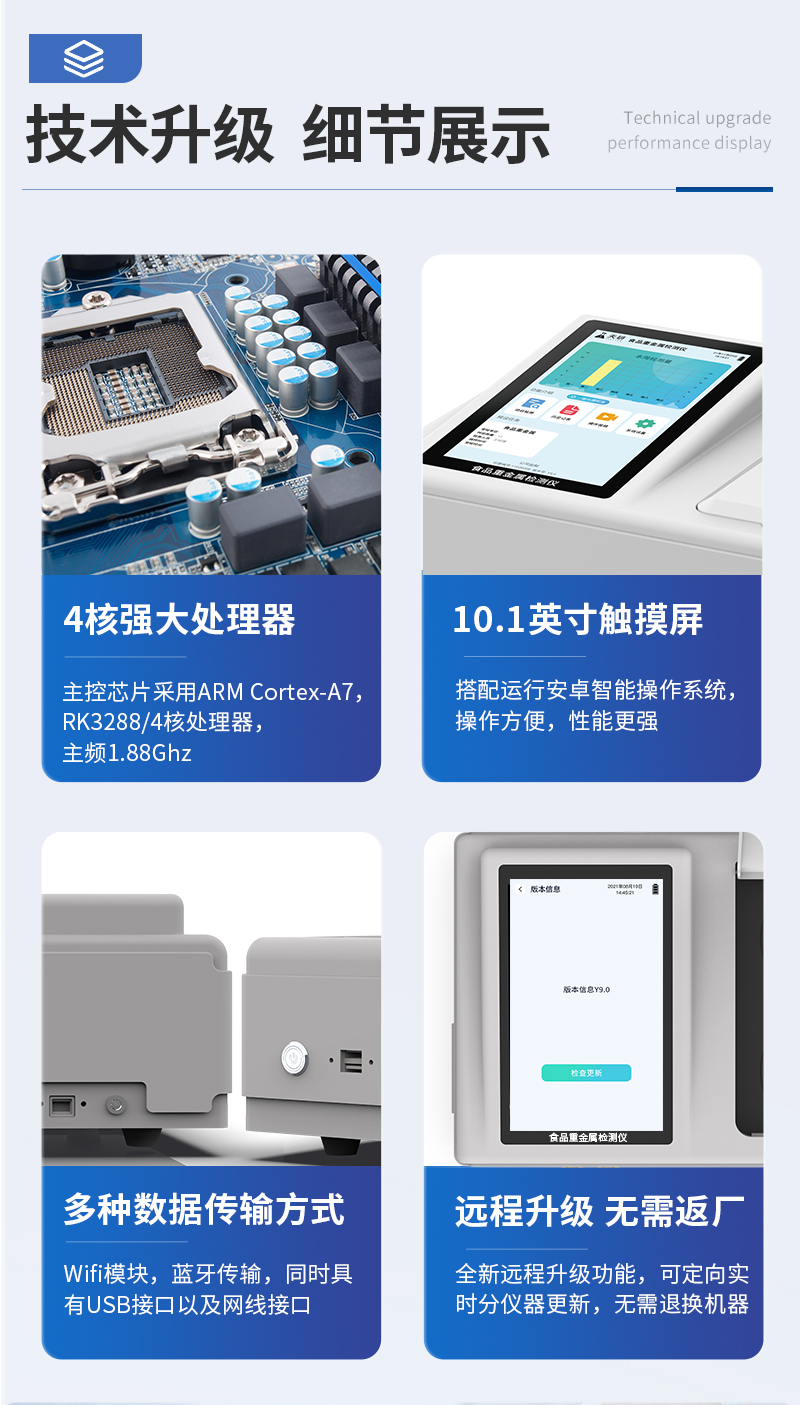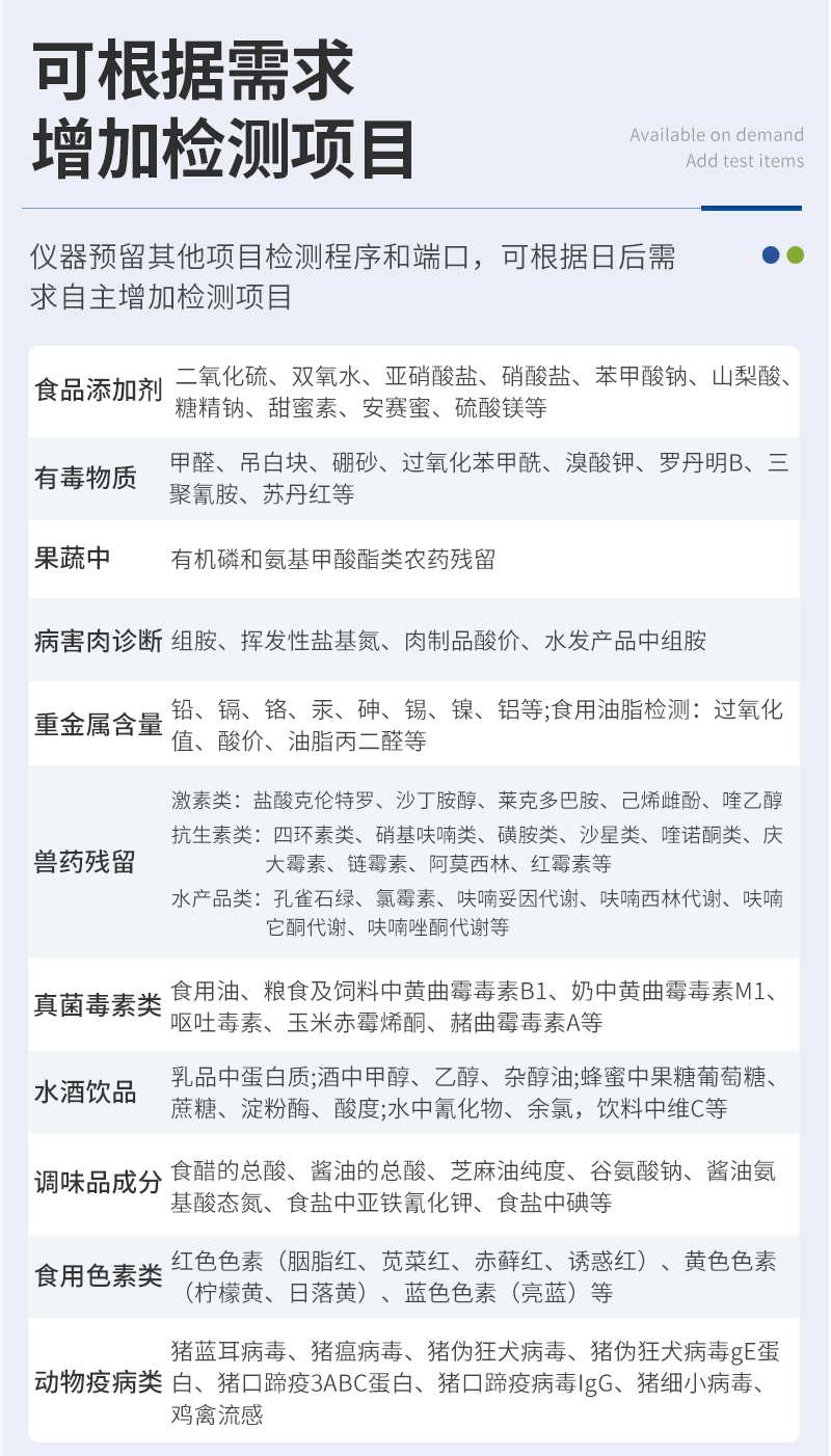 | 儀器采用手提一體化系統(tǒng)檢測技術(shù),將分光光度模塊、數(shù)字化管理模塊、無線通訊模塊高度集成于一體,可支持檢測60種食品安全檢測項(xiàng)目,同時(shí)預(yù)留升級檢測方法。 | 儀器檢測模塊標(biāo)準(zhǔn)化、智能化,檢測項(xiàng)目可隨意自由組合。檢測箱體內(nèi)置多個(gè)標(biāo)準(zhǔn)檢測單元,檢測模塊可以調(diào)整配置。 | 儀器采用全新安卓智能系統(tǒng),主控芯片采用 ARM Cortex-A7,RK3288/4核處理器,10.1寸高清液晶觸摸豎屏,更加**的UI交互界面,運(yùn)轉(zhuǎn)快捷;儀器配備無線通信模塊: 4G(APN)通訊模塊、Wifi模塊,藍(lán)牙傳輸,同時(shí)具有雙USB接口以及RJ45接口能以多種方式實(shí)現(xiàn)數(shù)據(jù)保存和數(shù)據(jù)傳輸功能。 | 顯示屏幕:儀器采用10.1英寸豎向液晶觸摸屏顯,搭配運(yùn)行安卓智能操作系統(tǒng),主控芯片采用ARM Cortex-A7,RK3288/4核處理器,主頻1.88Ghz,操作方便,性能更強(qiáng)。 | 檢測通道:≥12通道;采用精密旋轉(zhuǎn)比色池設(shè)計(jì),使用同芯片同光源校準(zhǔn)精度,解決不同光源之間的誤差值,更加準(zhǔn)確**。(1-12通道間誤差0.1%,**號:ZL202022821055.2) | 儀器光源:高精度進(jìn)口四波長冷光源,每個(gè)通道均配置 410、520、590、630nm 波長光源,標(biāo)配**的光路切換裝置,**光路切換功能可實(shí)現(xiàn)64波長,并且所有檢測項(xiàng)目可實(shí)現(xiàn)所有通道同時(shí)檢測。 | 設(shè)備可一鍵校準(zhǔn),自動(dòng)保存校準(zhǔn)數(shù)據(jù),自動(dòng)對比校驗(yàn),得到精準(zhǔn)光源,采用Android SP存儲(chǔ)數(shù)據(jù),光源數(shù)據(jù)永不丟失,方便每一次使用。 | 通訊接口:配備無線通信模塊、4G(APN)通訊模塊、藍(lán)牙傳輸,同時(shí)具有雙USB接口以及RJ45網(wǎng)線接口,可以多方式實(shí)現(xiàn)數(shù)據(jù)保存及數(shù)據(jù)傳輸。 | 存儲(chǔ)方式:支持U盤存儲(chǔ),標(biāo)準(zhǔn)USB接口,免驅(qū)動(dòng)安裝。檢測結(jié)果存儲(chǔ)容量20萬條以上,可生成Excel表格進(jìn)行拷貝,并具有登錄保護(hù)功能。 | 智能化操作系統(tǒng): | 1、操作系統(tǒng):儀器可在同一檢測界面自動(dòng)對應(yīng)相關(guān)檢測通道,一次性選擇1-12個(gè)樣品名稱,無需退出界面,節(jié)省操作時(shí)間。并可以對每個(gè)通道屬性和樣品信息單獨(dú)進(jìn)行編輯,例如送檢單位、人員,檢測人員等,打印時(shí)勾選打印顯示。 | 2、數(shù)據(jù)集成系統(tǒng):設(shè)備首頁自動(dòng)匯總分析檢測數(shù)據(jù),包含:周檢測數(shù)據(jù)、月檢測數(shù)據(jù),全部檢測總數(shù)量,均包含檢測總數(shù),合格數(shù),不合格數(shù),以及相關(guān)柱形分析圖,各項(xiàng)檢測數(shù)據(jù)一目了然,無需電腦查詢,更加快捷直觀。 | 3、數(shù)據(jù)庫系統(tǒng):十幾項(xiàng)數(shù)據(jù)庫分類管理儀器:包含項(xiàng)目類型、項(xiàng)目數(shù)據(jù)、檢測數(shù)據(jù)、歷史記錄、國標(biāo)信息、曲線信息、采樣信息、檢測信息、受檢信息、復(fù)核信息、圖表信息、光源校準(zhǔn)信息、打印樣式信息、樣品庫信息等等,數(shù)據(jù)庫之間互相協(xié)調(diào)聯(lián)動(dòng)保證數(shù)據(jù)的真實(shí)完整性。同時(shí)產(chǎn)品數(shù)據(jù)庫以及歷史檢測記錄支持一鍵檢索功能。 | 4、限量規(guī)判系統(tǒng):具有限量查詢、添加物質(zhì)合規(guī)判定系統(tǒng)。檢測出結(jié)果后,系統(tǒng)自動(dòng)調(diào)用系統(tǒng)數(shù)據(jù)庫中相關(guān)國標(biāo)進(jìn)行比對判定,客觀顯示判定結(jié)果是否合格。 | 5、項(xiàng)目預(yù)設(shè)系統(tǒng):儀器具有任務(wù)預(yù)設(shè)模塊,一鍵提前預(yù)設(shè),給出方便快捷的新檢測方案,每一個(gè)任務(wù)分別可以設(shè)置不同的樣品、批次、編號、來源、備注、抽樣信息、檢測信息、受檢信息、復(fù)核信息等更多信息。樣品送檢時(shí)一鍵調(diào)取保存信息,并可多次調(diào)取,大大提高檢測效率。 | 6、數(shù)據(jù)監(jiān)管系統(tǒng):同步對接監(jiān)管平臺(tái),數(shù)據(jù)可局域網(wǎng)和互聯(lián)網(wǎng)數(shù)據(jù)上傳,檢測結(jié)果可選擇直接傳至食品安全監(jiān)管平臺(tái)。進(jìn)行區(qū)域食品安全監(jiān)管及大數(shù)據(jù)分析處理與數(shù)據(jù)統(tǒng)計(jì),檢測區(qū)域食品安全長短期動(dòng)態(tài),達(dá)到食品安全問題預(yù)估、預(yù)警。 | 7、全新打印系統(tǒng):內(nèi)置全新打印機(jī),新創(chuàng)自定義打印方式,可按需靈活勾選控制:二維碼,抽樣信息、檢測信息,受檢信息、復(fù)核信息、抽樣日期、檢測日期等信息的打印。 | 8、A4紙版本報(bào)告打印功能(可選配):設(shè)備擁有兩種結(jié)果展示方式,可以自動(dòng)生成A4打印模板和小票打印模板兩種樣式,可通過WiFi及網(wǎng)線等方式鏈接外置打印機(jī)可進(jìn)行打印。 | 供電模式:儀器交直流兩用,直流12V供電,可連接車載電源,可配6ah大容量充電鋰電池,電量可實(shí)時(shí)顯示,方便戶外流動(dòng)測試。 | 儀器具備遠(yuǎn)程升級功能,可定向分客戶分儀器更新,開機(jī)后自動(dòng)更新,并可持續(xù)性免費(fèi)更新系統(tǒng)版本,無需像傳統(tǒng)產(chǎn)品返廠更新,節(jié)省時(shí)間及人力成本并避免了物流運(yùn)輸返廠升級導(dǎo)致設(shè)備損壞的潛