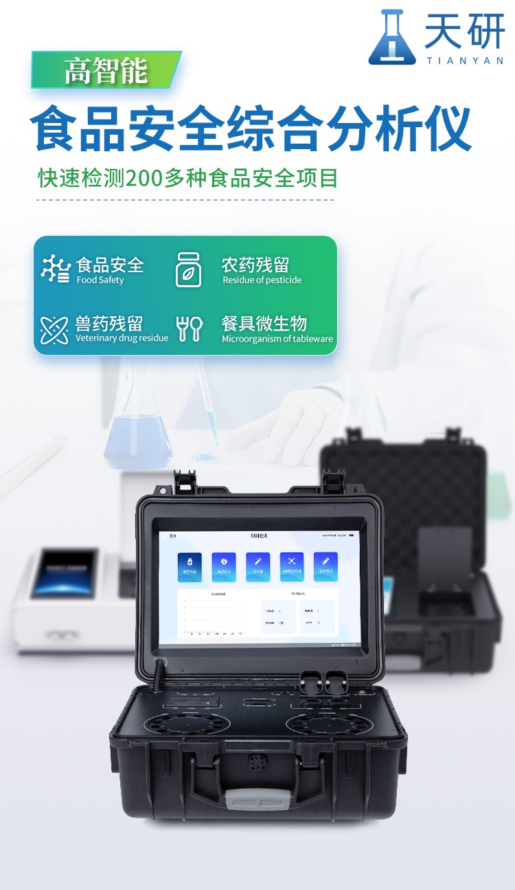 山東天研儀器有限公司生產(chǎn)的高智能食品安全檢測儀為集成化食品安全快速檢測分析設備,采用臺式一體化設計,可快速檢測200多種食品安全項目,包含非食用化學物質、濫用食品添加劑、農(nóng)藥殘留、獸藥殘留、重金屬、病害肉、營養(yǎng)強化劑、抗生素類殘留、激素類殘留、真菌毒素類殘留、化學類殘留等項目的定性定量檢測。目前廣泛應用于市場監(jiān)管局、檢測中心、衛(wèi)生監(jiān)督部門、農(nóng)業(yè)部門、院校及各單位食堂、食品肉產(chǎn)品深加工企業(yè)、商超市場、司法部門、餐飲機構、養(yǎng)殖場、屠宰場、檢驗檢疫部門等單位。