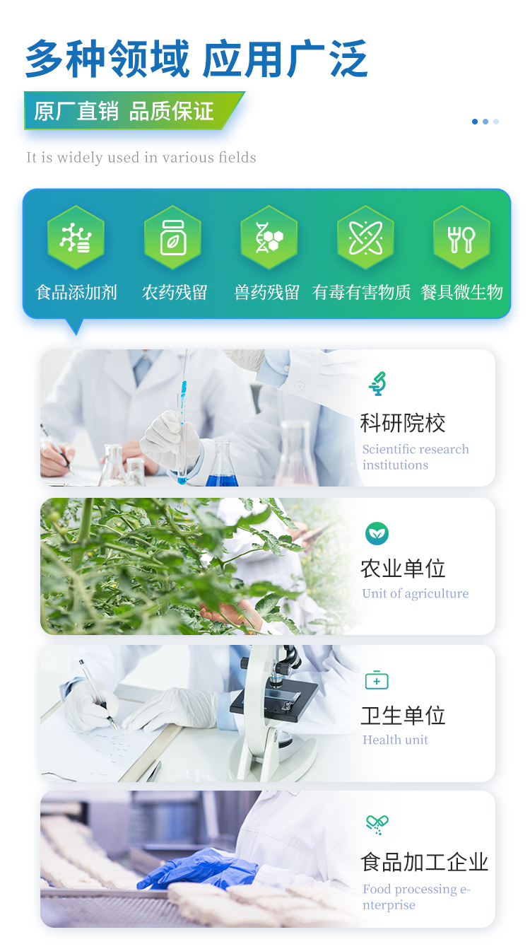 | 食品添加劑:二氧化硫、雙氧水、亞硝酸鹽、硝酸鹽、苯甲酸鈉、山梨酸鉀、糖精鈉、甜蜜素、木耳硫酸鎂等 | 有毒有害物質:甲醛、吊白塊、硼砂、過氧化苯甲酰、溴酸鉀、羅丹明B、三聚氰胺、蘇丹紅、工業(yè)堿、尿素、明礬等 | 食用油脂:過氧化值、酸價等 | 果蔬:農(nóng)藥殘留(酶抑制率法) | 病害肉:組胺、揮發(fā)性鹽基氮 | 重金屬含量: 鉛、鎘、鉻、汞、砷、錫、鎳、鋁等 | 瘦肉精激素:鹽酸克倫特羅、沙丁胺醇、萊克多巴胺、己烯雌酚等 | 抗生素殘留:四環(huán)素類、硝基呋喃類、磺胺類、β-興奮劑類、沙星類、磺胺類、喹諾酮類,甲砜霉素,氟苯尼考,金剛烷胺、替米考星、慶大霉素、林可霉素、鏈霉素、恩諾沙星、環(huán)丙沙星、頭孢啦啶、青霉素、阿莫西林等 | 水產(chǎn)品安全類:孔雀石綠、氯霉素、呋喃妥因、呋喃西林、呋喃它酮、呋喃唑酮等 | 蛋類藥物殘留:氯霉素,四環(huán)素,磺胺類,喹諾酮類,呋喃西林,呋喃它酮,呋喃妥因,呋喃唑酮,氟苯尼考,阿莫西林、頭孢氨芐、紅霉素、鏈霉素等 | 真菌毒素殘留:食用油、糧食及飼料中黃曲霉毒素B1、黃曲霉毒素總量,奶中黃曲霉毒素M1、嘔吐毒素、玉米赤霉烯酮、赭曲霉毒素A、T2毒素、伏馬毒素等 | 水酒飲品分析:酒中甲醇、乙醇、乳品及牛奶中蛋白質, | 蜂蜜成分:果糖和葡萄糖、蔗糖、淀粉酶、酸度等 | 調味品成分:食醋的總酸、醬油的總酸、芝麻油純度、谷氨酸鈉、醬油氨基酸態(tài)氮、食鹽中亞鐵氰化鉀、食鹽中碘等 | 食用色素類:紅色色素(胭脂紅、莧菜紅、莧菜紅)、黃色色素(檸檬黃、日落黃)、藍色色素(亮藍)等 | 動物疫病類:禽流感、新城疫、牛羊口蹄疫、牛羊結核病、牛羊包蟲、牛羊布病、小反芻獸、豬藍耳病毒、豬瘟病毒、豬偽狂犬病毒、豬細小、豬圓環(huán)、犬細小病毒、犬瘟熱病毒、犬狂犬病毒等 |