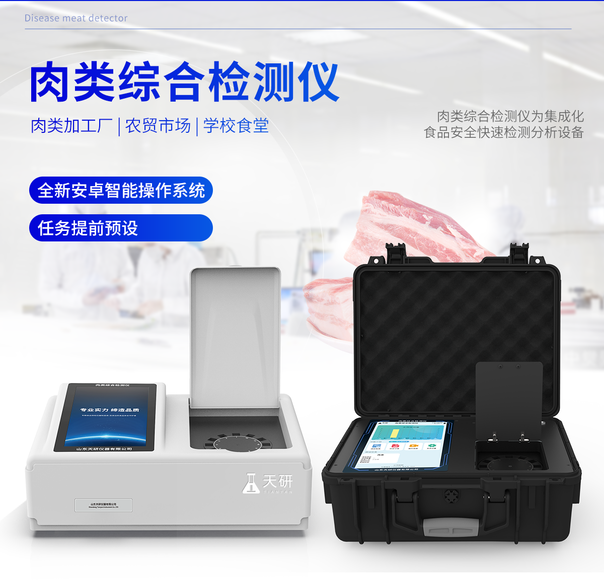 肉類綜合檢測儀可快速檢測幾十種項目,包含各種獸藥殘留:抗生素類殘留、瘦肉精激素類殘留;病害肉診斷:肉類新鮮度、肉中組胺、揮發(fā)性鹽基氮;水產(chǎn)品安全篩查等現(xiàn)場的定性定量檢測。