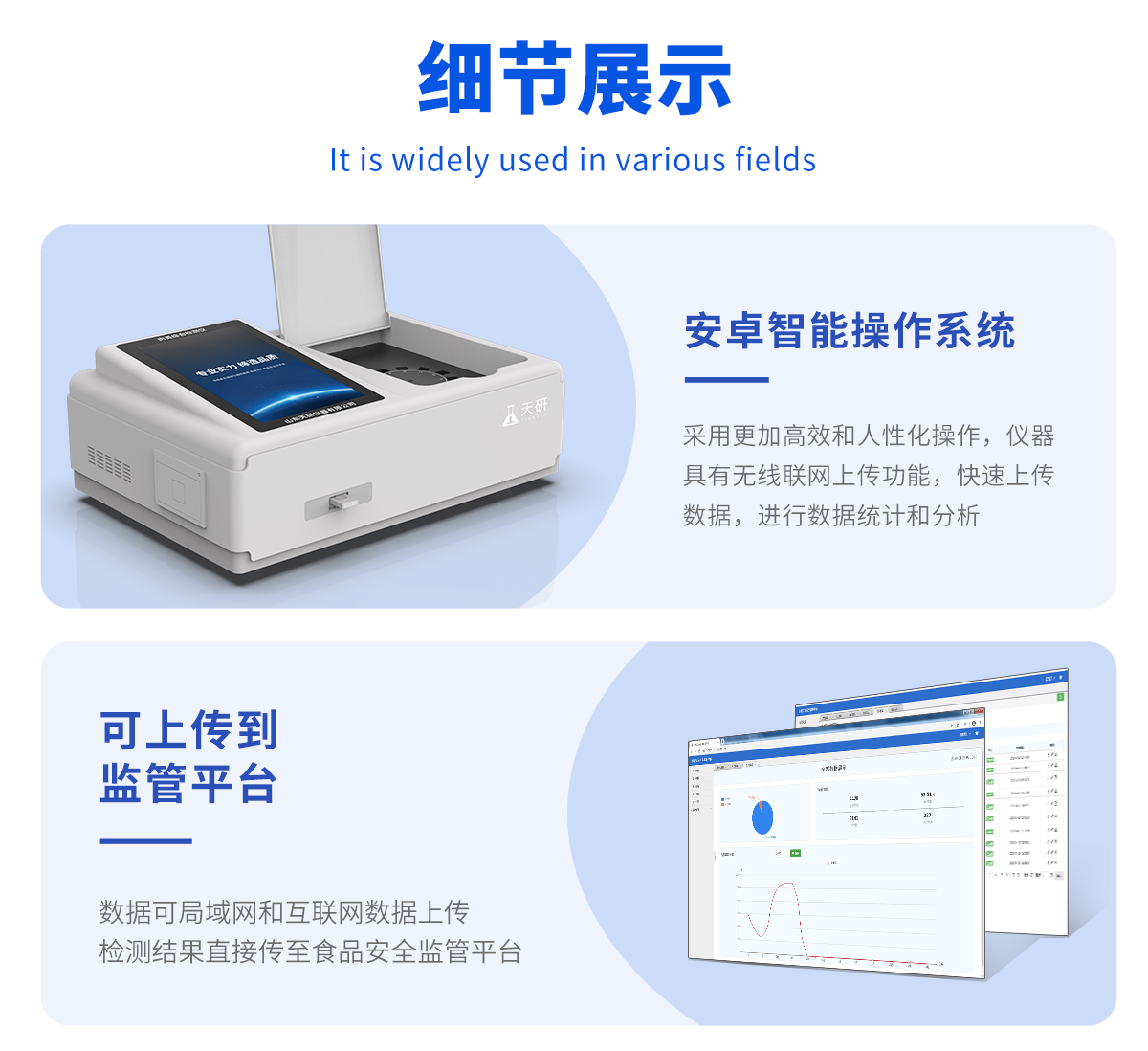 | 儀器采用臺式一體化系統(tǒng)檢測技術(shù),將分光光度模塊、膠體金檢測模塊、新型農(nóng)殘檢測模塊、數(shù)字化管理模塊、無線通訊模塊高度集成于一體,支持檢測200種食品安全檢測項目,同時預(yù)留升級檢測方法。 | 儀器檢測模塊標準化、智能化,可隨意自由組合。檢測箱體內(nèi)置多個標準檢測單元,檢測模塊可以調(diào)整配置。 | 儀器采用全新安卓智能系統(tǒng),主控芯片采用 ARM Cortex-A7,RK3288/4核處理器,10.1寸高清液晶觸摸豎屏,更加**的UI交互界面,運轉(zhuǎn)快捷;儀器配備無線通信模塊: 4G(APN)通訊模塊、Wifi模塊,藍牙傳輸,同時具有雙USB接口以及RJ45接口能以多種方式實現(xiàn)數(shù)據(jù)保存和數(shù)據(jù)傳輸功能。 | 創(chuàng)新檢測模式: | ★檢測通道:≥12通道;采用精密旋轉(zhuǎn)比色池設(shè)計,使用同芯片同光源校準精度,解決不同光源之間的誤差值。1-12通道間誤差0.1%。(**號:ZL202022821055.2) | ★儀器具有自動識別比色皿檢測功能,即:將樣品比色皿放入儀器后,點擊樣品檢測,儀器自動識別比色皿進行通道檢測。 | 進口高精光源: | 高精度進口四波長冷光源,通道配置 410、520、590、630nm 波長光源,一個光源芯片驅(qū)動一個光源,誤差極小,每臺設(shè)備單獨**校準光源,**比對,同時參照四種不同波段光源全方位覆蓋市面上99%的農(nóng)殘食品項目檢測。 | 膠體金模塊檢測方式: | 采用COMS實時成像技術(shù),可采集多個畫面,支持3個金標同時讀卡,通過不同顏色的灰度變化,一秒精準得出結(jié)果。 | 智能化操作系統(tǒng): | 便捷操作系統(tǒng):設(shè)備檢測時可在同一檢測界面自動對應(yīng)相關(guān)檢測通道一次性選擇1-12個樣品名稱,無須退出界面,節(jié)省操作時間。 | 數(shù)據(jù)集成系統(tǒng):設(shè)備首頁自動統(tǒng)計檢測數(shù)據(jù)包含:周檢測數(shù)據(jù)、月檢測數(shù)據(jù),全部檢測總數(shù)量,均包含檢測總數(shù),合格數(shù),不合格數(shù),以及相關(guān)柱形分析圖,對各項檢測數(shù)據(jù)清晰掌握,無需電腦查詢,更加快捷直觀。 | 項目預(yù)設(shè)系統(tǒng):支持添加單個及多個相同或不相同的任務(wù)預(yù)設(shè),一鍵快速調(diào)取,每一個任務(wù)分別可以設(shè)置不同的樣品、批次、編號、來源、備注、抽樣信息、檢測信息、受檢信息、復(fù)核信息等更多信息。無縫鏈接平臺和APP實時查看下發(fā)任務(wù)。 | 數(shù)據(jù)監(jiān)管系統(tǒng):同步對接監(jiān)管平臺,數(shù)據(jù)可局域網(wǎng)和互聯(lián)網(wǎng)數(shù)據(jù)上傳,檢測結(jié)果可選擇直接傳至食品安全監(jiān)管平臺。集成OSS輸出存儲服務(wù)、區(qū)分設(shè)備定向管理應(yīng)用,進行區(qū)域食品安全監(jiān)管及大數(shù)據(jù)分析處理與數(shù)據(jù)統(tǒng)計,檢測區(qū)域食品安全長短期動態(tài),達到食品安全問題預(yù)估、預(yù)警。 | 自定義打印系統(tǒng):內(nèi)置全新打印系統(tǒng),新創(chuàng)自定義打印方式,可按需靈活設(shè)置開啟或關(guān)閉:產(chǎn)品合格證(國家農(nóng)業(yè)部標準要求),二維碼,抽樣信息、檢測信息,受檢信息、復(fù)核信息、抽樣日期、檢測日期等信息的打印。 | 系統(tǒng)遠程更新功能:可定向分客戶分儀器更新系統(tǒng),按照不同客戶后期實際需求添加項目,無需機器返廠,即可遠程實時升級全新系統(tǒng),節(jié)省時間成本及避免運輸造成設(shè)備損壞。 | 儀器主機采用一體化防水、抗壓、防撞擊、防腐蝕箱體設(shè)計,同時配備交直流供電,可連接車載電源,可選配大容量充電鋰電池,滿足現(xiàn)場野外檢測需求。 | 安全證書,放心保障:儀器具有中國計量科學(xué)研究院校準證書,**認證。 |