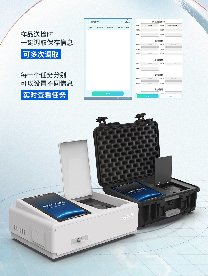 | 儀器采用手提式一體化系統(tǒng)檢測(cè)技術(shù),將分光光度模塊、膠體金檢測(cè)模塊、新型農(nóng)殘檢測(cè)模塊、數(shù)字化管理模塊、無(wú)線通訊模塊高度集成于一體,支持檢測(cè)200種食品安全檢測(cè)項(xiàng)目,同時(shí)預(yù)留升級(jí)檢測(cè)方法。 | 儀器檢測(cè)模塊標(biāo)準(zhǔn)化、智能化,檢測(cè)項(xiàng)目可隨意自由組合。檢測(cè)箱體內(nèi)置多個(gè)標(biāo)準(zhǔn)檢測(cè)單元,檢測(cè)模塊可以調(diào)整配置。 | 顯示屏幕:儀器采用10.1英寸豎向液晶觸摸屏顯,搭配運(yùn)行安卓智能操作系統(tǒng),主控芯片采用ARM Cortex-A7,RK3288/4核處理器,主頻1.88Ghz,操作方便,性能更強(qiáng)。 | 檢測(cè)通道:≥12通道;采用精密旋轉(zhuǎn)比色池設(shè)計(jì),使用同芯片同光源校準(zhǔn)精度,解決不同光源之間的誤差值,更加準(zhǔn)確**。(1-12通道間誤差0.1%,**號(hào):ZL202022821055.2) | 儀器光源:高精度進(jìn)口四波長(zhǎng)冷光源,每個(gè)通道均配置 410、520、590、630nm 波長(zhǎng)光源,標(biāo)配**的光路切換裝置,**光路切換功能可實(shí)現(xiàn)64波長(zhǎng),并且所有檢測(cè)項(xiàng)目可實(shí)現(xiàn)所有通道同時(shí)檢測(cè)。 | 設(shè)備可一鍵校準(zhǔn),自動(dòng)保存校準(zhǔn)數(shù)據(jù),自動(dòng)對(duì)比校驗(yàn),得到精準(zhǔn)光源,采用Android SP存儲(chǔ)數(shù)據(jù),光源數(shù)據(jù)永不丟失,方便每一次使用。 | 通訊接口:配備無(wú)線通信模塊、4G(APN)通訊模塊、藍(lán)牙傳輸,同時(shí)具有雙USB接口以及RJ45網(wǎng)線接口,可以多方式實(shí)現(xiàn)數(shù)據(jù)保存及數(shù)據(jù)傳輸 | 存儲(chǔ)方式:支持U盤存儲(chǔ),標(biāo)準(zhǔn)USB接口,免驅(qū)動(dòng)安裝。檢測(cè)結(jié)果存儲(chǔ)容量20萬(wàn)條以上,可生成Excel表格進(jìn)行拷貝,并具有登錄保護(hù)功能。 | 智能化操作系統(tǒng): | 1)操作系統(tǒng):儀器可在同一檢測(cè)界面自動(dòng)對(duì)應(yīng)相關(guān)檢測(cè)通道,一次性選擇1-12個(gè)樣品名稱,無(wú)需退出界面,節(jié)省操作時(shí)間。并可以對(duì)每個(gè)通道屬性和樣品信息單獨(dú)進(jìn)行編輯,例如送檢單位、人員,檢測(cè)人員等,打印時(shí)勾選打印顯示。 | 2)數(shù)據(jù)集成系統(tǒng):設(shè)備首頁(yè)自動(dòng)匯總分析檢測(cè)數(shù)據(jù),包含:周檢測(cè)數(shù)據(jù)、月檢測(cè)數(shù)據(jù),全部檢測(cè)總數(shù)量,均包含檢測(cè)總數(shù),合格數(shù),不合格數(shù),以及相關(guān)柱形分析圖,各項(xiàng)檢測(cè)數(shù)據(jù)一目了然,無(wú)需電腦查詢,更加快捷直觀。 | 3)數(shù)據(jù)庫(kù)系統(tǒng):十幾項(xiàng)數(shù)據(jù)庫(kù)分類管理儀器:包含項(xiàng)目類型、項(xiàng)目數(shù)據(jù)、檢測(cè)數(shù)據(jù)、歷史記錄、國(guó)標(biāo)信息、曲線信息、采樣信息、檢測(cè)信息、受檢信息、復(fù)核信息、圖表信息、光源校準(zhǔn)信息、打印樣式信息、樣品庫(kù)信息等等,數(shù)據(jù)庫(kù)之間互相協(xié)調(diào)聯(lián)動(dòng)保證數(shù)據(jù)的真實(shí)完整性。同時(shí)產(chǎn)品數(shù)據(jù)庫(kù)以及歷史檢測(cè)記錄支持一鍵檢索功能。 | 4)限量規(guī)判系統(tǒng):具有限量查詢、添加物質(zhì)合規(guī)判定系統(tǒng)。檢測(cè)出結(jié)果后,系統(tǒng)自動(dòng)調(diào)用系統(tǒng)數(shù)據(jù)庫(kù)中相關(guān)國(guó)標(biāo)進(jìn)行比對(duì)判定,客觀顯示判定結(jié)果是否合格。 | 5)項(xiàng)目預(yù)設(shè)系統(tǒng):儀器具有任務(wù)預(yù)設(shè)模塊,一鍵提前預(yù)設(shè),給出方便快捷的新檢測(cè)方案,每一個(gè)任務(wù)分別可以設(shè)置不同的樣品、批次、編號(hào)、來(lái)源、備注、抽樣信息、檢測(cè)信息、受檢信息、復(fù)核信息等更多信息。樣品送檢時(shí)一鍵調(diào)取保存信息,并可多次調(diào)取,大大提高檢測(cè)效率。 | 6)數(shù)據(jù)監(jiān)管系統(tǒng):同步對(duì)接監(jiān)管平臺(tái),數(shù)據(jù)可局域網(wǎng)和互聯(lián)網(wǎng)數(shù)據(jù)上傳,檢測(cè)結(jié)果可選擇直接傳至食品安全監(jiān)管平臺(tái)。進(jìn)行區(qū)域食品安全監(jiān)管及大數(shù)據(jù)分析處理與數(shù)據(jù)統(tǒng)計(jì),檢測(cè)區(qū)域食品安全長(zhǎng)短期動(dòng)態(tài),達(dá)到食品安全問(wèn)題預(yù)估、預(yù)警。 | 7)打印系統(tǒng):內(nèi)置全新打印機(jī),新創(chuàng)自定義打印方式,可按需靈活勾選控制:產(chǎn)品合格證(國(guó)家農(nóng)業(yè)部標(biāo)準(zhǔn)要求),二維碼,抽樣信息、檢測(cè)信息,受檢信息、復(fù)核信息、抽樣日期、檢測(cè)日期等信息的打印。 | 供電模式:儀器交直流兩用,直流12V供電,可連接車載電源,可配6ah大容量充電鋰電池,電量可實(shí)時(shí)顯示,方便戶外流動(dòng)測(cè)試。 | 膠體金檢測(cè)模塊:采用雙通道CMOS成像處理技術(shù)及膠體金免疫層析技術(shù),可同時(shí)讀取雙膠體金卡數(shù)據(jù),自動(dòng)采集、處理分析,將檢測(cè)結(jié)果顯示,并可根據(jù)參考限值自動(dòng)判斷檢測(cè)結(jié)果,可檢測(cè)常見(jiàn)的獸藥殘留、生物毒素、抗生素、違禁添加物等。 | 1)探測(cè)技術(shù):CMOS成像探測(cè); | 2)檢測(cè)通道:1個(gè)通道; | 3)檢測(cè)方式:消線法和比色法; | 4)顯示