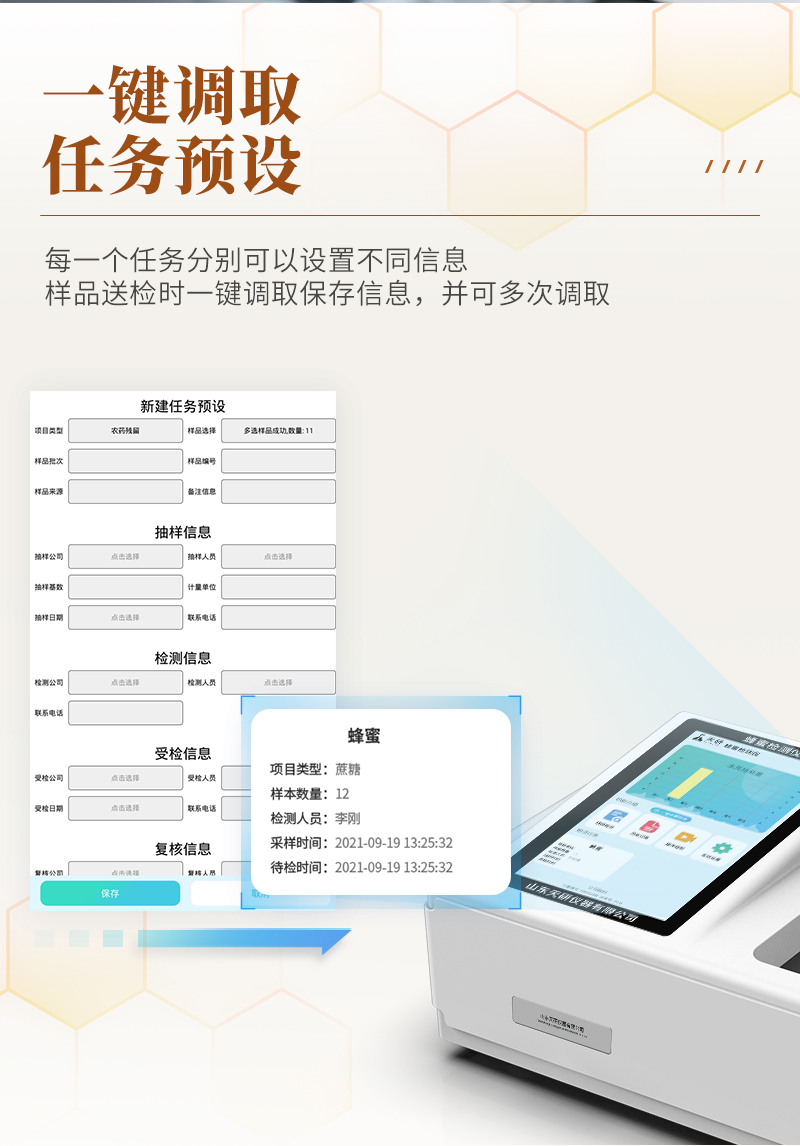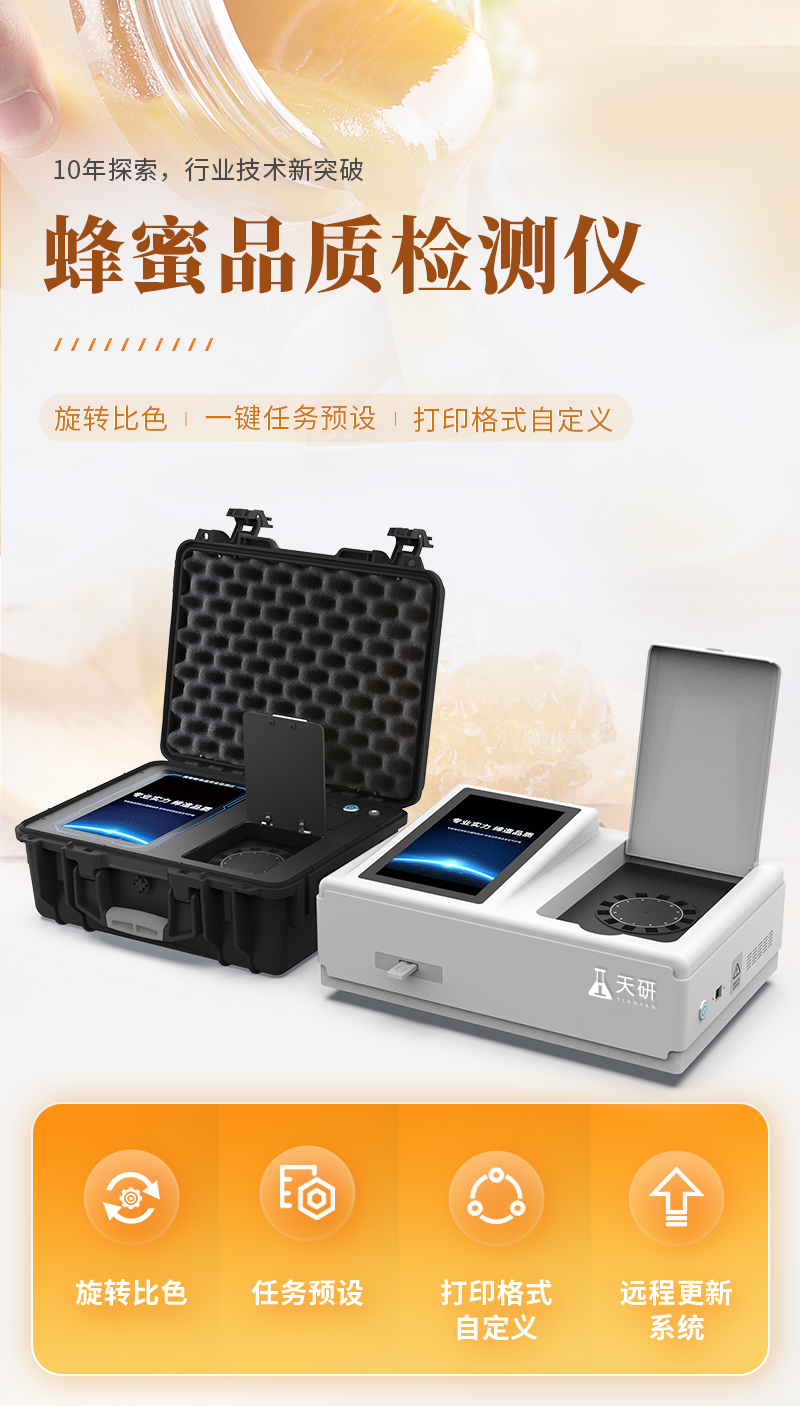 產(chǎn)品介紹: 該蜂蜜檢測(cè)儀為集成化食品安全快速檢測(cè)分析設(shè)備,廣泛應(yīng)用于食藥監(jiān)局、衛(wèi)生部門、高教院校、科研院所、農(nóng)業(yè)部門、養(yǎng)殖場(chǎng)、屠宰場(chǎng)、食品肉產(chǎn)品深加工企業(yè)、檢驗(yàn)檢疫部門等單位使用。 檢測(cè)項(xiàng)目: 檢測(cè)項(xiàng)目可從項(xiàng)目表中任選4項(xiàng),儀器預(yù)留其他項(xiàng)目程序和端口方便后期升級(jí),可根據(jù)
