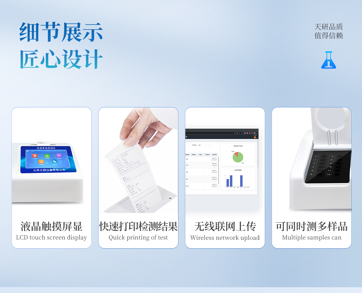 產(chǎn)品介紹:多功能食品安全檢測儀可快速檢測200多項(xiàng)目,包含非食用化學(xué)物質(zhì)、濫用食品添加劑、農(nóng)藥殘留、獸藥殘留、重金屬、病害肉、營養(yǎng)強(qiáng)化劑、抗生素類殘留、激素類殘留、真菌毒素類殘留、化學(xué)類殘留等現(xiàn)場的定性定量檢測。該多功能食品安全檢測儀為集成化食品安全快速檢測分析設(shè)備,廣泛應(yīng)用于市場監(jiān)管局、檢測中心、衛(wèi)生
