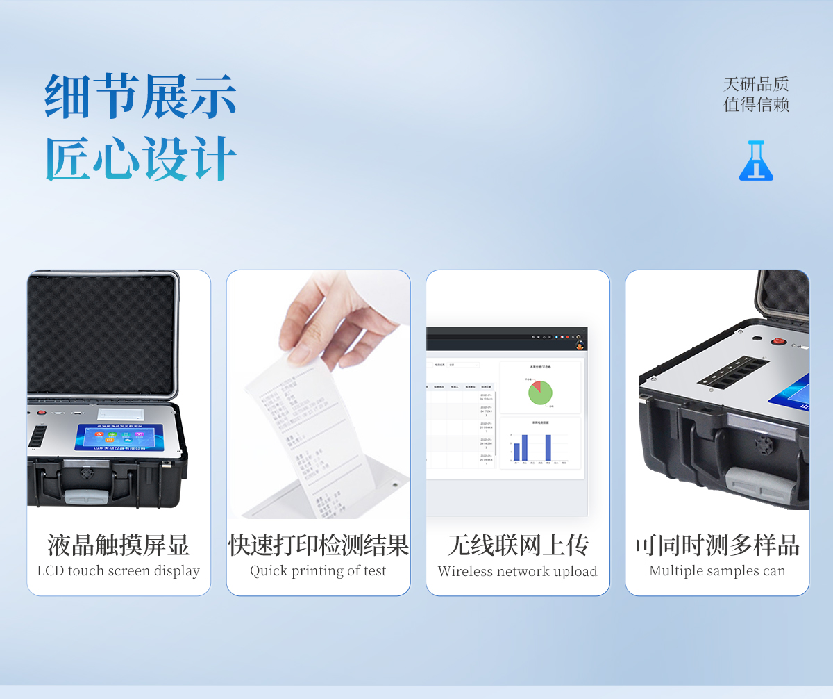 產(chǎn)品介紹: 多功能食品安全檢測儀可快速檢測200多項(xiàng)目,包含非食用化學(xué)物質(zhì)、濫用食品添加劑、農(nóng)藥殘留、獸藥殘留、重金屬、病害肉、營養(yǎng)強(qiáng)化劑、抗生素類殘留、激素類殘留、真菌毒素類殘留、化學(xué)類殘留等現(xiàn)場的定性定量檢測。該多功能食品安全檢測儀為集成化食品安全快速檢測分析設(shè)備,廣泛應(yīng)用于市場監(jiān)