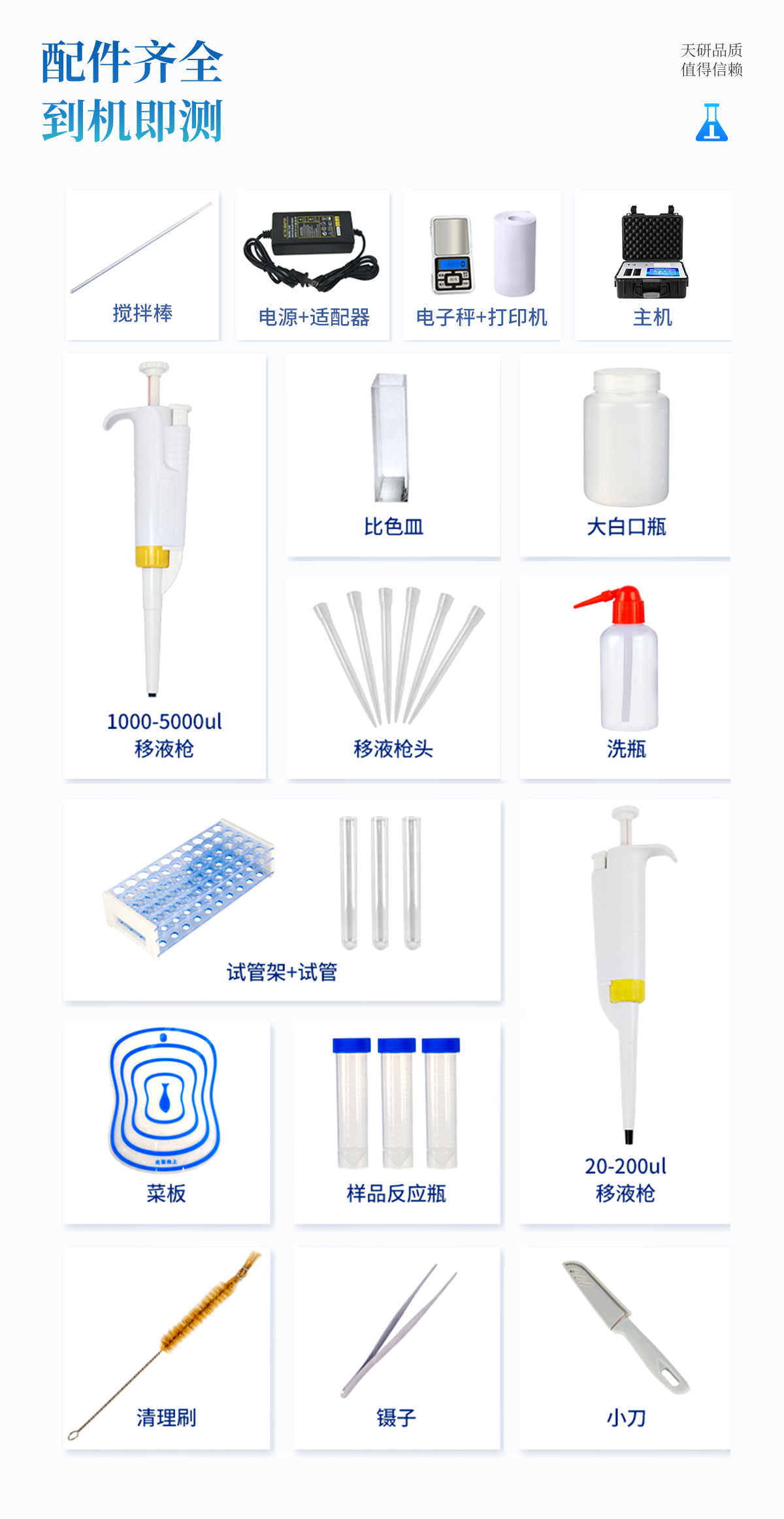 | 食品添加劑:二氧化硫、雙氧水、亞硝酸鹽、硝酸鹽、苯甲酸鈉、山梨酸、糖精鈉、甜蜜素、安賽蜜、硫酸鎂等 | 有毒有害物質(zhì):甲醛、吊白塊、硼砂、過氧化苯甲酰、溴酸鉀、羅丹明B、三聚氰胺、蘇丹紅等 | 果蔬中:有機(jī)磷和氨基甲酸酯類農(nóng)藥殘留; | 病害肉診斷:組胺、揮發(fā)性鹽基氮、肉制品酸價(jià)、水發(fā)產(chǎn)品中組胺 | 重金屬含量:鉛、鎘、鉻、汞、砷、錫、鎳、鋁等;食用油脂檢測:過氧化值、酸價(jià)、油脂丙二醛等。 | 瘦肉精激素類(獸藥):鹽酸克倫特羅、沙丁胺醇、萊克多巴胺、己烯雌酚、喹乙醇等 | 抗生素殘留類(獸藥):四環(huán)素類、硝基呋喃類、磺胺類、沙星類、喹諾酮類、慶大霉素、鏈霉素、阿莫西林、紅霉素等 | 水產(chǎn)品安全類:孔雀石綠、氯霉素、呋喃妥因代謝、呋喃西林代謝、呋喃它酮代謝、呋喃唑酮代謝等 | 真菌毒素類:食用油、糧食及飼料中黃曲霉毒素B1、奶中黃曲霉毒素M1、嘔吐毒素、玉米赤霉烯酮、赭曲霉毒素A等 | 水酒飲品分析:乳品及牛奶中蛋白質(zhì);酒中甲醇、乙醇、雜醇油;蜂蜜中果糖和葡萄糖、蔗糖、淀粉酶、酸度;水中氰化物、余氯,飲料中維C等 | 調(diào)味品成分:食醋的總酸、醬油的總酸、芝麻油純度、谷氨酸鈉、醬油氨基酸態(tài)氮、食鹽中亞鐵氰化鉀、食鹽中碘等 | 食用色素類:紅色色素(胭脂紅、莧菜紅、赤蘚紅、誘惑紅)、黃色色素(檸檬黃、日落黃)、藍(lán)色色素(亮藍(lán))等 | 動(dòng)物疫病類:豬藍(lán)耳病毒、豬瘟病毒、豬偽狂犬病毒、豬偽狂犬病毒gE蛋白、豬口蹄疫3ABC蛋白、豬口蹄疫病毒IgG、豬細(xì)小病毒、雞禽流感等 |