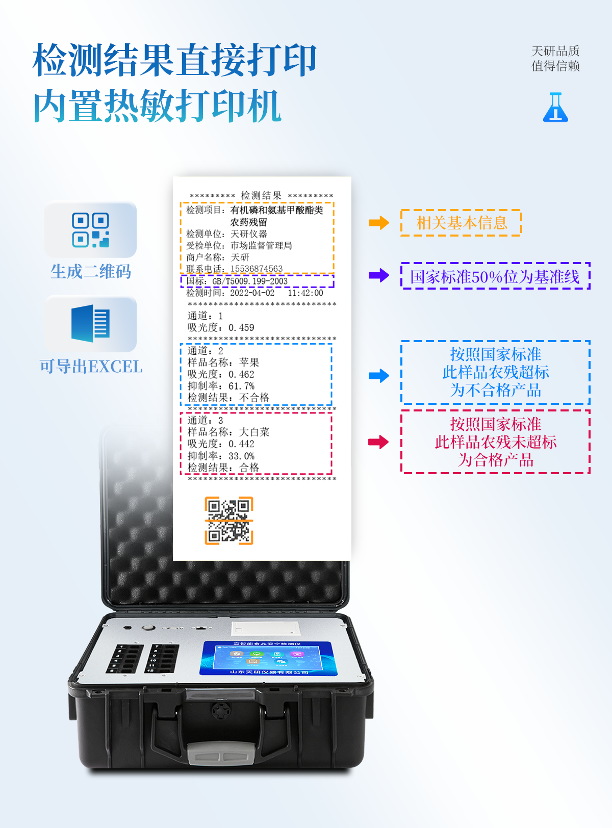 | 安卓智能操作系統(tǒng),采用更加**的UI交互界面,儀器具有wifi聯(lián)網(wǎng)上傳、4G聯(lián)網(wǎng)傳輸、GPRS無線遠(yuǎn)傳、網(wǎng)線連接功能,快速批量上傳數(shù)據(jù)。 | 智能化程度高,儀器具有自檢功能:具有開機(jī)自檢和調(diào)零功能,具有自動(dòng)檢測重復(fù)性功能。 | 新一代高速熱敏打印機(jī),檢測完成可自動(dòng)打印或批量打印檢測報(bào)告和二維碼。 | 儀器帶有監(jiān)管平臺,數(shù)據(jù)可局域網(wǎng)和互聯(lián)網(wǎng)數(shù)據(jù)上傳,檢測結(jié)果直接傳至食品安全監(jiān)管平臺。進(jìn)行區(qū)域食品安全監(jiān)管及大數(shù)據(jù)分析處理與數(shù)據(jù)統(tǒng)計(jì),檢測區(qū)域食品安全長短期動(dòng)態(tài),達(dá)到食品安全問題預(yù)估、預(yù)警 | 一體化主機(jī),包含食品安全檢測模塊、多通道農(nóng)藥殘留檢測模塊、膠體金免疫層析檢測模塊。 | 一體化便攜式快檢設(shè)備,滿足現(xiàn)場及流動(dòng)檢測使用需求,能夠在同一軟件下實(shí)現(xiàn)所有檢測項(xiàng)目的檢測,并可通過同一窗口直觀顯示檢測結(jié)果。 | 膠體金模塊檢測方式:軌道式自動(dòng)傳輸掃描,檢測完成后自動(dòng)退出檢測卡。 | CT線自動(dòng)識別,無需手動(dòng)調(diào)整。 | 內(nèi)置強(qiáng)大的數(shù)據(jù)庫,具有多品類多種類樣品菜單功能,可靈活選擇檢測樣品,不同的檢測通道可同時(shí)檢測不同的樣品項(xiàng)目。也可在儀器上直接編輯錄入樣品名稱、檢測指標(biāo)、送檢單位等信息并保存進(jìn)樣品數(shù)據(jù)庫。 | 產(chǎn)品內(nèi)置操作演示視頻,是您身邊的化驗(yàn)指導(dǎo)專家。 | 樣品處理簡單省力,整體操作快速、安全、便捷。 | 儀器具有自身保護(hù)功能,可設(shè)置用戶名及密碼,防止非工作人員操作等。 | 高靈敏度,高檢測精度,高重復(fù)性精度,掃描式高精度光學(xué)傳感器。 | 結(jié)果判定線可修改,對照值標(biāo)定值可保存,斷電不丟失數(shù)據(jù)。 | 兼容市場上所有的膠體金卡,使用耗材不受限制,極大增強(qiáng)用戶使用體驗(yàn)。 | 儀器具有重新校準(zhǔn)、鎖定、恢復(fù)出廠設(shè)置功能。 |
