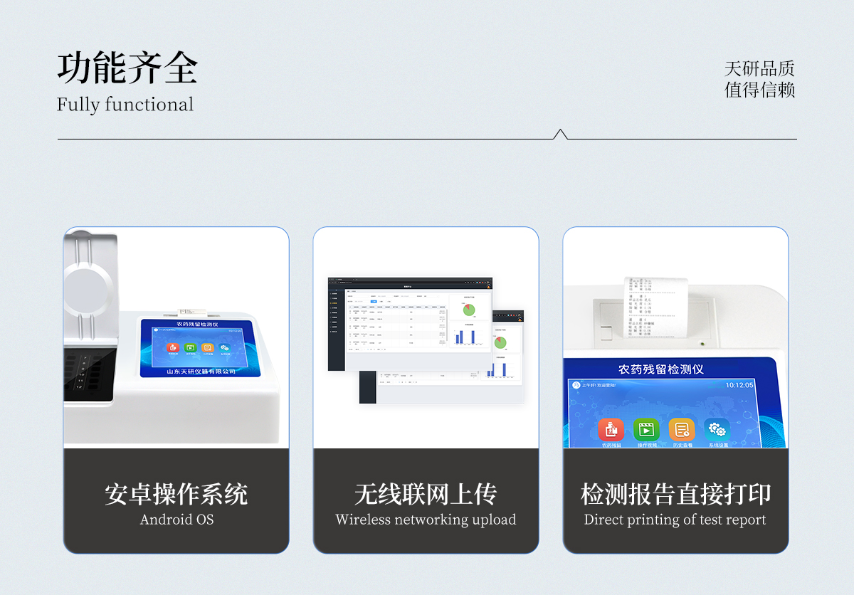 | 乙酰膽堿酯酶和丁酰膽堿酯酶試劑均可以使用,符合國家標準和農業(yè)部標準的要求。 | 自動判斷樣品是否合格,檢測結果更加直觀。 | 儀器具有100多種蔬菜名稱菜單庫,分類管理,并可按需添加或刪除蔬菜名,編輯蔬菜名稱,可直接打印出蔬菜名稱。 | 檢測通道:12個檢測通道,可以同時測試多個樣品,循環(huán)檢測,即放即檢,每個樣品由程序控制分別獨立工作,不會互相干擾。 | 智能操作系統(tǒng),采用更加人性化操作,主控采用多核處理器,主頻1.88Ghz,運轉速度更快速,穩(wěn)定性更強。 | 顯示方式:7英寸高靈敏真彩觸摸屏顯示,人性化中文操作界面,讀數直觀、簡單。 | 打印機采用串口5v打印,可選擇手動打印或者自動打印,三分鐘出打印結果,打印格式為檢測人姓名、吸光度差值、檢測時間、檢測機構、樣品名稱及結果判定。 | 光源采用進口超高亮發(fā)光二極管,具有低功耗、高精度、穩(wěn)定性強、光源可控可以關掉不使用的光源,響應速度快等優(yōu)點。 | 智能恒流穩(wěn)壓,光強自動校準,長時間連續(xù)工作光源無溫漂現象。 | 儀器具有GPRS遠傳功能,可插手機卡實現數據遠傳平臺,wifi聯網功能,可將數據快速上傳電腦,進行數據管理與統(tǒng)計。 | 采用USB2.0接口設計,方便數據的存貯和移動,并可隨時與計算機直接相連,并且可用計算機控制儀器。實現數據查詢、瀏覽、分析、統(tǒng)計、打印等。 | 智能化程度高,儀器具有自檢功能:具有開機自檢和調零功能,具有自動檢測重復性功能 | 儀器具有自身保護功能,可設置用戶名及密碼,防止非工作人員操作等。 | 采用DC12v直流供電,安全系統(tǒng)更高,并且配備6A鋰電池充電器。 | 儀器具有重新校準、鎖定、恢復出廠設置功能。 |