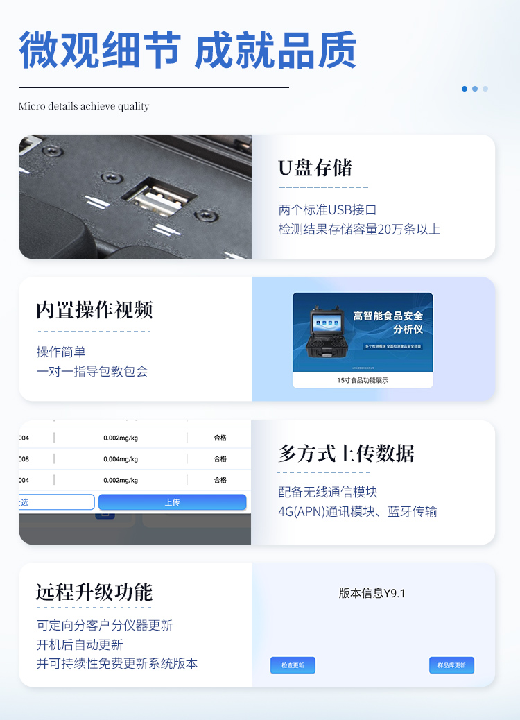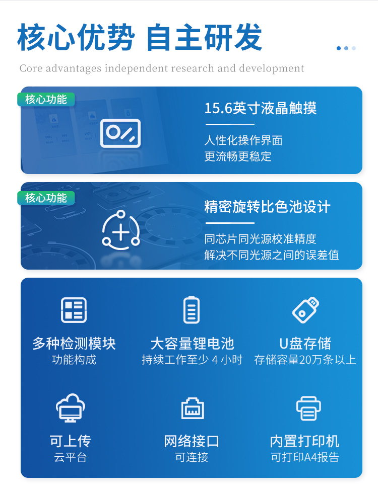 | 儀器采用手提一體化系統(tǒng)檢測(cè)技術(shù),將分光光度模塊、膠體金檢測(cè)模塊、新型農(nóng)殘檢測(cè)模塊、數(shù)字化管理模塊、無線通訊模塊高度集成于一體,支持檢測(cè)200種食品安全檢測(cè)項(xiàng)目,同時(shí)預(yù)留升級(jí)檢測(cè)方法。 | 儀器檢測(cè)模塊標(biāo)準(zhǔn)化、智能化,檢測(cè)項(xiàng)目可隨意自由組合。檢測(cè)箱體內(nèi)置多個(gè)標(biāo)準(zhǔn)檢測(cè)單元,檢測(cè)模塊可以調(diào)整配置。 | 顯示屏幕:儀器采用10.1英寸豎向液晶觸摸屏顯,搭配運(yùn)行安卓智能操作系統(tǒng),主控芯片采用ARM Cortex-A7,RK3288/4核處理器,主頻1.88Ghz,操作方便,性能更強(qiáng)。 | 檢測(cè)通道:≥12通道;采用精密旋轉(zhuǎn)比色池設(shè)計(jì),使用同芯片同光源校準(zhǔn)精度,解決不同光源之間的誤差值,更加準(zhǔn)確**。(1-12通道間誤差0.1%,**號(hào):ZL202022821055.2) | 儀器光源:高精度進(jìn)口四波長冷光源,每個(gè)通道均配置 410、520、590、630nm 波長光源,標(biāo)配**的光路切換裝置,**光路切換功能可實(shí)現(xiàn)64波長,并且所有檢測(cè)項(xiàng)目可實(shí)現(xiàn)所有通道同時(shí)檢測(cè)。 | 設(shè)備可一鍵校準(zhǔn),自動(dòng)保存校準(zhǔn)數(shù)據(jù),自動(dòng)對(duì)比校驗(yàn),得到精準(zhǔn)光源,采用Android SP存儲(chǔ)數(shù)據(jù),光源數(shù)據(jù)永不丟失,方便每一次使用。 | 通訊接口:配備無線通信模塊、4G(APN)通訊模塊、藍(lán)牙傳輸,同時(shí)具有雙USB接口以及RJ45網(wǎng)線接口,可以多方式實(shí)現(xiàn)數(shù)據(jù)保存及數(shù)據(jù)傳輸。 | 存儲(chǔ)方式:支持U盤存儲(chǔ),標(biāo)準(zhǔn)USB接口,免驅(qū)動(dòng)安裝。檢測(cè)結(jié)果存儲(chǔ)容量20萬條以上,可生成Excel表格進(jìn)行拷貝,并具有登錄保護(hù)功能。 | 智能化操作系統(tǒng):: ★操作系統(tǒng):儀器可在同一檢測(cè)界面自動(dòng)對(duì)應(yīng)相關(guān)檢測(cè)通道,一次性選擇1-12個(gè)樣品名稱,無需退出界面,節(jié)省操作時(shí)間。并可以對(duì)每個(gè)通道屬性和樣品信息單獨(dú)進(jìn)行編輯,例如送檢單位、人員,檢測(cè)人員等,打印時(shí)勾選打印顯示。 | ★數(shù)據(jù)集成系統(tǒng):設(shè)備首頁自動(dòng)匯總分析檢測(cè)數(shù)據(jù),包含:周檢測(cè)數(shù)據(jù)、月檢測(cè)數(shù)據(jù),全部檢測(cè)總數(shù)量,均包含檢測(cè)總數(shù),合格數(shù),不合格數(shù),以及相關(guān)柱形分析圖,各項(xiàng)檢測(cè)數(shù)據(jù)一目了然,無需電腦查詢,更加快捷直觀。 | ★數(shù)據(jù)庫系統(tǒng):十幾項(xiàng)數(shù)據(jù)庫分類管理儀器:包含項(xiàng)目類型、項(xiàng)目數(shù)據(jù)、檢測(cè)數(shù)據(jù)、歷史記錄、國標(biāo)信息、曲線信息、采樣信息、檢測(cè)信息、受檢信息、復(fù)核信息、圖表信息、光源校準(zhǔn)信息、打印樣式信息、樣品庫信息等等,數(shù)據(jù)庫之間互相協(xié)調(diào)聯(lián)動(dòng)保證數(shù)據(jù)的真實(shí)完整性。同時(shí)產(chǎn)品數(shù)據(jù)庫以及歷史檢測(cè)記錄支持一鍵檢索功能。 | ★限量規(guī)判系統(tǒng):具有限量查詢、添加物質(zhì)合規(guī)判定系統(tǒng)。檢測(cè)出結(jié)果后,系統(tǒng)自動(dòng)調(diào)用系統(tǒng)數(shù)據(jù)庫中相關(guān)國標(biāo)進(jìn)行比對(duì)判定,客觀顯示判定結(jié)果是否合格 | ★項(xiàng)目預(yù)設(shè)系統(tǒng):儀器具有任務(wù)預(yù)設(shè)模塊,一鍵提前預(yù)設(shè),給出方便快捷的新檢測(cè)方案,每一個(gè)任務(wù)分別可以設(shè)置不同的樣品、批次、編號(hào)、來源、備注、抽樣信息、檢測(cè)信息、受檢信息、復(fù)核信息等更多信息。樣品送檢時(shí)一鍵調(diào)取保存信息,并可多次調(diào)取,大大提高檢測(cè)效率。 | ★數(shù)據(jù)監(jiān)管系統(tǒng):同步對(duì)接監(jiān)管平臺(tái),數(shù)據(jù)可局域網(wǎng)和互聯(lián)網(wǎng)數(shù)據(jù)上傳,檢測(cè)結(jié)果可選擇直接傳至食品安全監(jiān)管平臺(tái)。進(jìn)行區(qū)域食品安全監(jiān)管及大數(shù)據(jù)分析處理與數(shù)據(jù)統(tǒng)計(jì),檢測(cè)區(qū)域食品安全長短期動(dòng)態(tài),達(dá)到食品安全問題預(yù)估、預(yù)警。 | ★打印系統(tǒng):內(nèi)置全新打印機(jī),新創(chuàng)自定義打印方式,可按需靈活勾選控制:產(chǎn)品合格證(國家農(nóng)業(yè)部標(biāo)準(zhǔn)要求),二維碼,抽樣信息、檢測(cè)信息,受檢信息、復(fù)核信息、抽樣日期、檢測(cè)日期等信息的打印。 | 供電模式:儀器交直流兩用,直流12V供電,可連接車載電源,可配6ah大容量充電鋰電池,電量可實(shí)時(shí)顯示,方便戶外流動(dòng)測(cè)試。 | 膠體金檢測(cè)模塊:采用雙通道CMOS成像處理技術(shù)及膠體金免疫層析技術(shù),可同時(shí)讀取雙膠體金卡數(shù)據(jù),自動(dòng)采集、處理分析,將檢測(cè)結(jié)果顯示,并可根據(jù)參考限值自動(dòng)判斷檢測(cè)結(jié)果,可檢測(cè)常見的獸藥殘留、生物毒素、抗生素、違禁添加物等。 | ★探測(cè)技術(shù):CMOS成像探測(cè); | ★檢測(cè)通道:1個(gè)通道; | ★檢測(cè)方式:消線法和比色法; | ★顯示模式:陰性或陽性; | 曲線形式:軌道式掃描方式,顯示金標(biāo)卡圖像,實(shí)時(shí)生成、識(shí