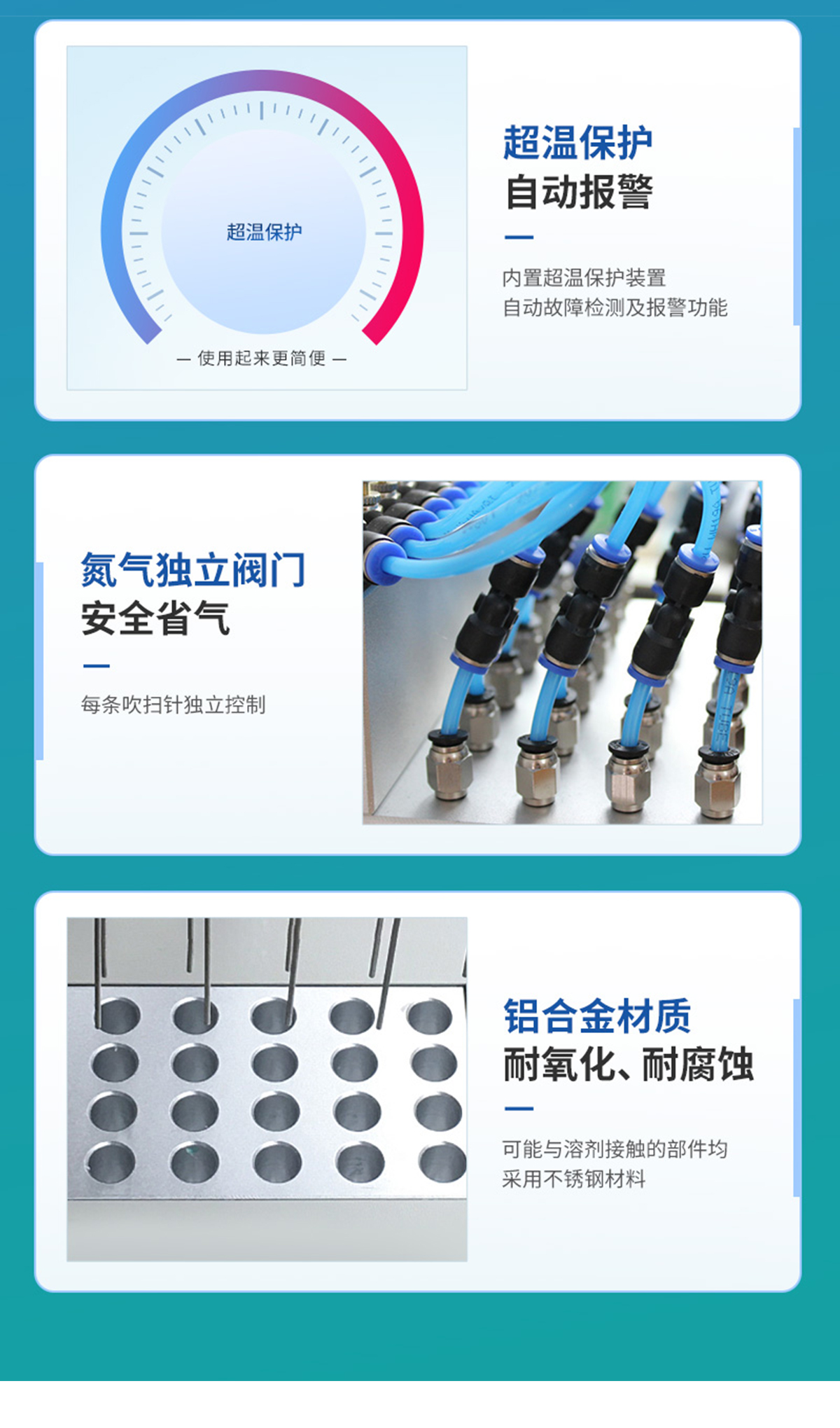12位 圓形水浴氮氣吹干儀 氮氣吹掃裝置360度旋轉(zhuǎn)自由升降 產(chǎn)品說明: 圓形水浴氮吹儀利用吹掃捕集技術(shù),同時可對樣品進(jìn)行控溫加熱,通過氮氣等惰性氣體快速、可控、連續(xù)地吹到樣品表面來達(dá)到樣品溶液快速無氧濃縮。該方法具有省時、便捷、準(zhǔn)確的特點。廣泛用于食品安全、醫(yī)藥、農(nóng)藥殘留檢測、臨床