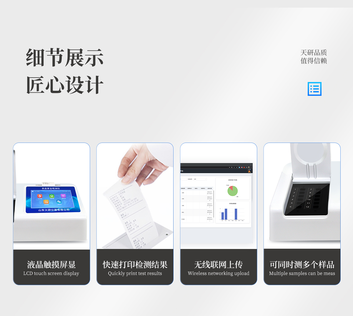 | 儀器采用臺式一體化系統(tǒng)檢測技術(shù),將分光光度模塊、新型農(nóng)殘檢測模塊、數(shù)字化管理模塊、無線通訊模塊高度集成于一體,支持檢測200種食品安全檢測項(xiàng)目,同時(shí)預(yù)留升級檢測方法。 | 儀器檢測模塊標(biāo)準(zhǔn)化、智能化,可隨意自由組合。檢測箱體內(nèi)置多個(gè)標(biāo)準(zhǔn)檢測單元,檢測模塊可以調(diào)整配置。 | 儀器采用全新安卓智能系統(tǒng),主控芯片采用 ARM Cortex-A7,RK3288/4核處理器,10.1寸高清液晶觸摸豎屏,更加**的UI交互界面,運(yùn)轉(zhuǎn)快捷;儀器配備無線通信模塊: 4G(APN)通訊模塊、Wifi模塊,藍(lán)牙傳輸,同時(shí)具有雙USB接口以及RJ45接口能以多種方式實(shí)現(xiàn)數(shù)據(jù)保存和數(shù)據(jù)傳輸功能。 | 創(chuàng)新檢測模式: | ★檢測通道:≥12通道;采用精密旋轉(zhuǎn)比色池設(shè)計(jì),使用同芯片同光源校準(zhǔn)精度,解決不同光源之間的誤差值。1-12通道間誤差0.1%。(**號:ZL202022821055.2) | ★儀器具有自動識別比色皿檢測功能,即:將樣品比色皿放入儀器后,點(diǎn)擊樣品檢測,儀器自動識別比色皿進(jìn)行通道檢測。 | 進(jìn)口高精光源: | 高精度進(jìn)口四波長冷光源,通道配置 410、520、590、630nm 波長光源,一個(gè)光源芯片驅(qū)動一個(gè)光源,誤差極小,每臺設(shè)備單獨(dú)**校準(zhǔn)光源,**比對,同時(shí)參照四種不同波段光源全方位覆蓋市面上99%的農(nóng)殘食品項(xiàng)目檢測。 | 智能化操作系統(tǒng): | 便捷操作系統(tǒng):設(shè)備檢測時(shí)可在同一檢測界面自動對應(yīng)相關(guān)檢測通道一次性選擇1-12個(gè)樣品名稱,無須退出界面,節(jié)省操作時(shí)間。 | 數(shù)據(jù)集成系統(tǒng):設(shè)備首頁自動統(tǒng)計(jì)檢測數(shù)據(jù)包含:周檢測數(shù)據(jù)、月檢測數(shù)據(jù),全部檢測總數(shù)量,均包含檢測總數(shù),合格數(shù),不合格數(shù),以及相關(guān)柱形分析圖,對各項(xiàng)檢測數(shù)據(jù)清晰掌握,無需電腦查詢,更加快捷直觀。 | 項(xiàng)目預(yù)設(shè)系統(tǒng):支持添加單個(gè)及多個(gè)相同或不相同的任務(wù)預(yù)設(shè),一鍵快速調(diào)取,每一個(gè)任務(wù)分別可以設(shè)置不同的樣品、批次、編號、來源、備注、抽樣信息、檢測信息、受檢信息、復(fù)核信息等更多信息。無縫鏈接平臺和APP實(shí)時(shí)查看下發(fā)任務(wù)。 | 數(shù)據(jù)監(jiān)管系統(tǒng):同步對接監(jiān)管平臺,數(shù)據(jù)可局域網(wǎng)和互聯(lián)網(wǎng)數(shù)據(jù)上傳,檢測結(jié)果可選擇直接傳至食品安全監(jiān)管平臺。集成OSS輸出存儲服務(wù)、區(qū)分設(shè)備定向管理應(yīng)用,進(jìn)行區(qū)域食品安全監(jiān)管及大數(shù)據(jù)分析處理與數(shù)據(jù)統(tǒng)計(jì),檢測區(qū)域食品安全長短期動態(tài),達(dá)到食品安全問題預(yù)估、預(yù)警。 | 自定義打印系統(tǒng):內(nèi)置全新打印系統(tǒng),新創(chuàng)自定義打印方式,可按需靈活設(shè)置開啟或關(guān)閉:產(chǎn)品合格證(國家農(nóng)業(yè)部標(biāo)準(zhǔn)要求),二維碼,抽樣信息、檢測信息,受檢信息、復(fù)核信息、抽樣日期、檢測日期等信息的打印。 | 系統(tǒng)遠(yuǎn)程更新功能:可定向分客戶分儀器更新系統(tǒng),按照不同客戶后期實(shí)際需求添加項(xiàng)目,無需機(jī)器返廠,即可遠(yuǎn)程實(shí)時(shí)升級全新系統(tǒng),節(jié)省時(shí)間成本及避免運(yùn)輸造成設(shè)備損壞。 | 儀器主機(jī)采用一體化防水、抗壓、防撞擊、防腐蝕箱體設(shè)計(jì),同時(shí)配備交直流供電,可連接車載電源,可選配大容量充電鋰電池,滿足現(xiàn)場野外檢測需求。 | 安全證書,放心保障:儀器具有中國計(jì)量科學(xué)研究院校準(zhǔn)證書,**認(rèn)證。 |