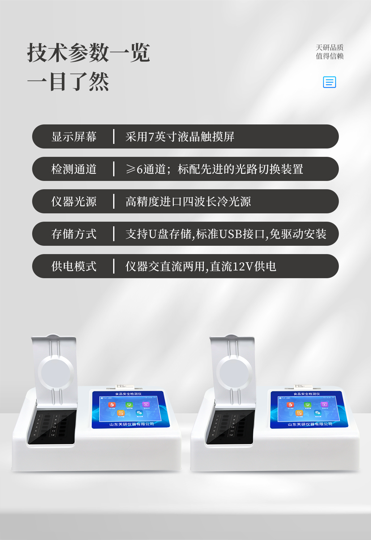 | 安卓智能操作系統(tǒng),采用更加**UI交互界面,儀器具有wifi聯(lián)網(wǎng)上傳、4G聯(lián)網(wǎng)傳輸、GPRS無線遠(yuǎn)傳、網(wǎng)線連接功能,快速批量上傳數(shù)據(jù)。 | 智能化程度高,儀器具有自檢功能:具有開機(jī)自檢和調(diào)零功能,具有自動(dòng)檢測(cè)重復(fù)性功能。 | 新一代高速熱敏打印機(jī),檢測(cè)完成可自動(dòng)打印或批量打印檢測(cè)報(bào)告和二維碼。 | 儀器帶有監(jiān)管平臺(tái),數(shù)據(jù)可局域網(wǎng)和互聯(lián)網(wǎng)數(shù)據(jù)上傳,檢測(cè)結(jié)果直接傳至食品安全監(jiān)管平臺(tái)。進(jìn)行區(qū)域食品安全監(jiān)管及大數(shù)據(jù)分析處理與數(shù)據(jù)統(tǒng)計(jì),檢測(cè)區(qū)域食品安全長(zhǎng)短期動(dòng)態(tài),達(dá)到食品安全問題預(yù)估、預(yù)警 | 一體化主機(jī),包含光電比色檢測(cè)模塊、膠體金免疫層析檢測(cè)模塊。 | 一體化便攜式快檢設(shè)備,滿足現(xiàn)場(chǎng)及流動(dòng)檢測(cè)使用需求,能夠在同一軟件下實(shí)現(xiàn)所有檢測(cè)項(xiàng)目的檢測(cè),并可通過同一窗口直觀顯示檢測(cè)結(jié)果。 | 膠體金模塊檢測(cè)方式:軌道式自動(dòng)傳輸掃描,檢測(cè)完成后自動(dòng)退出檢測(cè)卡。 | CT線自動(dòng)識(shí)別,無需手動(dòng)調(diào)整。 | 儀器具有多品類多種類樣品菜單庫,可靈活選擇檢測(cè)樣品,不同的檢測(cè)通道可同時(shí)檢測(cè)不同的樣品項(xiàng)目。也可在儀器上直接編輯錄入樣品名稱、檢測(cè)指標(biāo)、送檢單位等信息并保存進(jìn)樣品數(shù)據(jù)庫。 | 儀器內(nèi)置操作視頻,是您身邊的化驗(yàn)指導(dǎo)專家。 | 樣品處理簡(jiǎn)單省力,整體操作快速、安全、便捷。 | 儀器具有自身保護(hù)功能,可設(shè)置用戶名及密碼,防止非工作人員操作等。 | 高靈敏度,高檢測(cè)精度,高重復(fù)性精度,掃描式高精度光學(xué)傳感器。 | 儀器具有重新校準(zhǔn)、鎖定、恢復(fù)出廠設(shè)置功能。 | 結(jié)果判定線可修改,對(duì)照值標(biāo)定值可保存,斷電不丟失數(shù)據(jù)。 | 兼容市場(chǎng)上所有的膠體金卡,使用耗材不受限制,極大增強(qiáng)用戶使用體驗(yàn)。 |