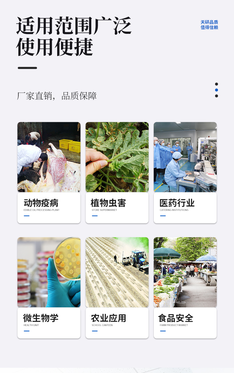 | 瘦肉精激素類(獸藥):鹽酸克倫特羅、沙丁胺醇、萊克多巴胺、己烯雌酚、喹乙醇等 | 抗生素殘留類(獸藥):四環(huán)素類、硝基呋喃類、磺胺類、沙星類、喹諾酮類、慶大霉素、鏈霉素、阿莫西林、紅霉素等 | 水產(chǎn)品安全類:孔雀石綠、氯霉素、呋喃妥因代謝、呋喃西林代謝、呋喃它酮代謝、呋喃唑酮代謝等 | 以及病害肉及肉類新鮮度的擴(kuò)展檢測(cè)。 |