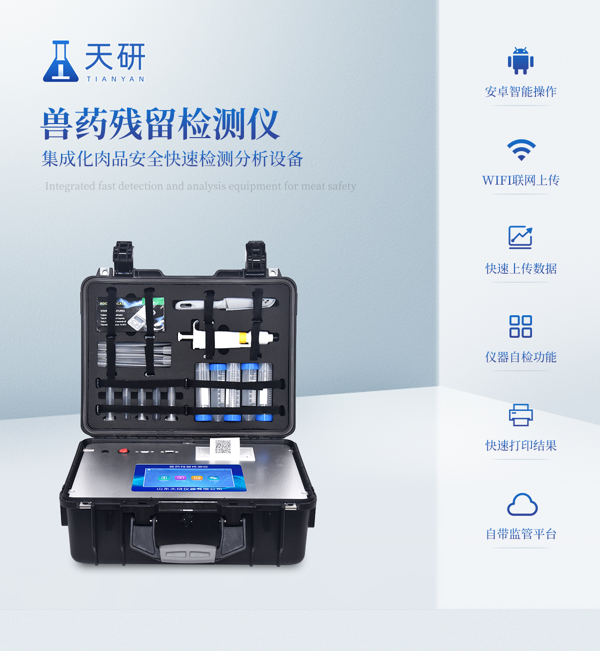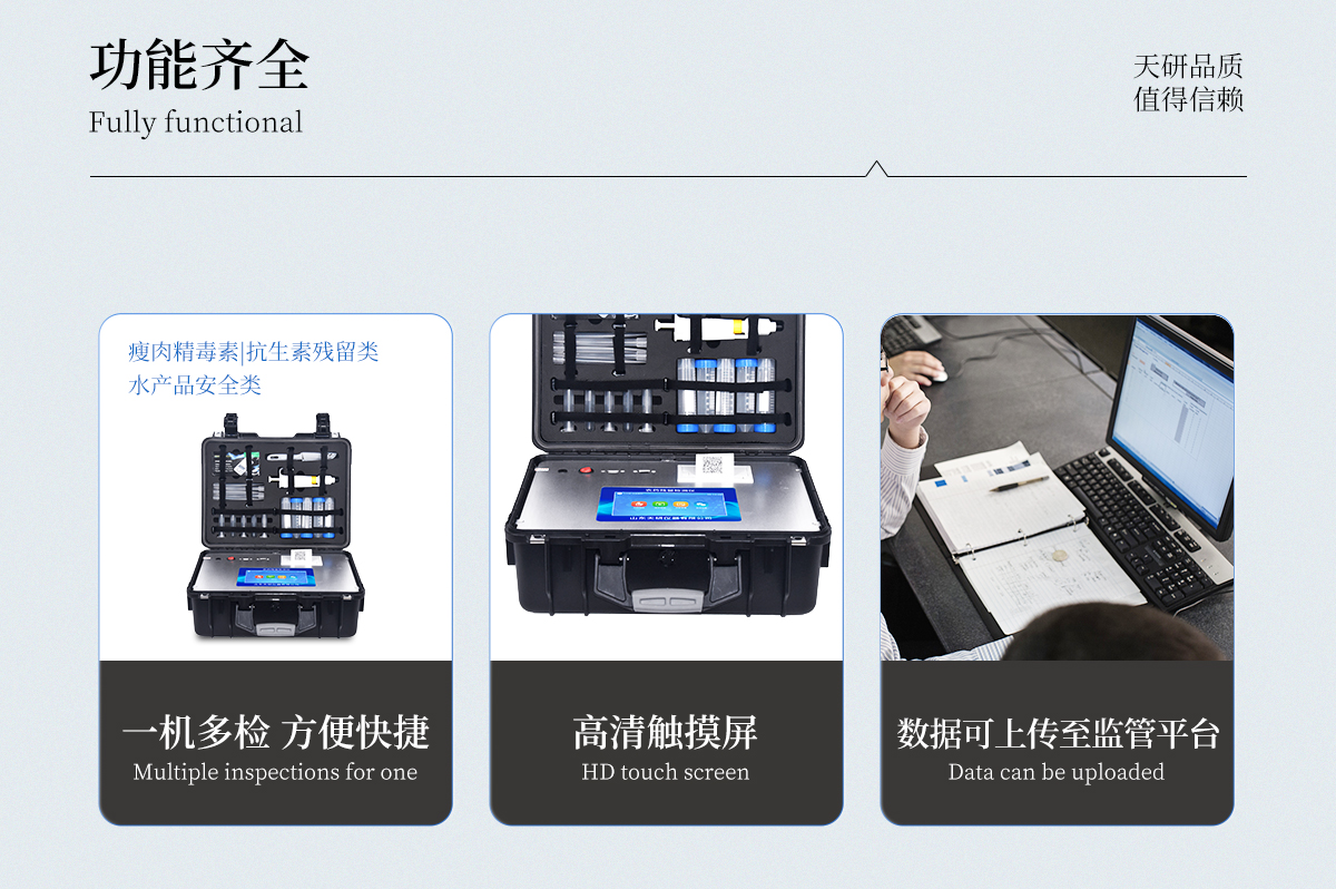 | 安卓智能操作系統(tǒng),采用更加**和人性化操作,儀器具有網(wǎng)線連接、wifi聯(lián)網(wǎng)上傳、4G無線遠傳功能,快速上傳數(shù)據(jù)。 | 智能化程度高,儀器具有自檢功能:具有開機自檢和調零功能,具有自動檢測重復性功能。 | 新一代高速熱敏打印機,檢測完成可自動打印檢測報告和二維碼。 | 儀器帶有監(jiān)管平臺。數(shù)據(jù)可局域網(wǎng)和互聯(lián)網(wǎng)數(shù)據(jù)上傳,檢測結果直接傳至食品安全監(jiān)管平臺。進行區(qū)域食品安全監(jiān)管及大數(shù)據(jù)分析處理與數(shù)據(jù)統(tǒng)計,檢測區(qū)域食品安全長短期動態(tài),達到食品安全問題預估、預警。 | 一體化便攜式快檢設備,滿足現(xiàn)場及流動檢測使用需求,能夠在同一軟件下實現(xiàn)所有檢測項目的檢測,并可通過同一窗口直觀顯示檢測結果。 | 膠體金模塊檢測方式:軌道式自動傳輸掃描,檢測完成后自動退出檢測卡。 | CT線自動識別,無需手動調整。 | 儀器具有品類多種類樣品菜單庫,可靈活選擇檢測樣品,不同的檢測通道可同時檢測不同的樣品項目。 | 樣品處理簡單省力,整體操作快速、安全、便捷。 | 儀器具有自身保護功能,可設置用戶名及密碼,防止非工作人員操作等。 | 高靈敏度,高檢測精度,高重復性精度,掃描式高精度光學傳感器。 | 內(nèi)置強大的數(shù)據(jù)庫,可在儀器上直接選擇樣品名稱、檢測指標、送檢單位等信息,也可在儀器上直接編輯錄入樣品名稱、檢測指標、送檢單位等信息并保存進樣品數(shù)據(jù)庫。 | 儀器具有重新校準、鎖定、恢復出廠設置功能。 | 支持U盤存儲。 結果判定線可修改,對照值標定值可保存,斷電不丟失數(shù)據(jù)。 | 兼容市場上所有的膠體金卡,使用耗材不受限制,極大增強用戶使用體驗。 |