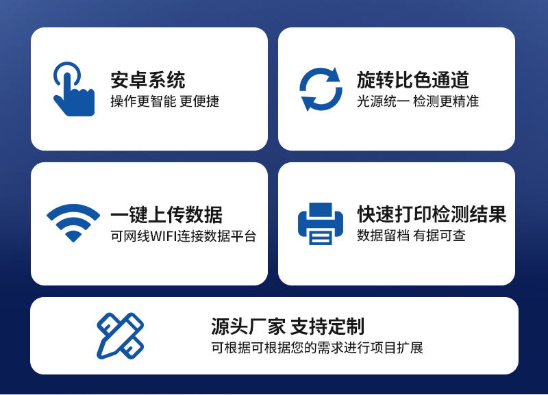 | 儀器采用臺式一體化系統(tǒng)檢測技術,新型農(nóng)殘檢測模塊、數(shù)字化管理模塊、無線通訊模塊高度集成于一體,同時預留升級檢測方法。 | 儀器檢測模塊標準化、智能化,可隨意自由組合。檢測箱體內(nèi)置多個標準檢測單元,檢測模塊可以調(diào)整配置。 | 儀器采用全新安卓智能系統(tǒng),主控芯片采用 ARM Cortex-A7,RK3288/4核處理器,10.1寸高清液晶觸摸豎屏,更加**的UI交互界面,運轉快捷;儀器配備無線通信模塊: 4G(APN)通訊模塊、Wifi模塊,藍牙傳輸,同時具有雙USB接口以及RJ45接口能以多種方式實現(xiàn)數(shù)據(jù)保存和數(shù)據(jù)傳輸功能。 | 創(chuàng)新檢測模式:檢測通道:≥24通道;采用精密旋轉比色池設計,使用同芯片同光源校準精度,解決不同光源之間的誤差值。1-12通道間誤差0.1%。(**號:ZL202022821055.2) 儀器具有自動識別比色皿檢測功能,即:將樣品比色皿放入儀器后,點擊樣品檢測,儀器自動識別比色皿進行通道檢測。 | 進口高精光源:高精度進口四波長冷光源,通道配置 410、520、590、630nm 波長光源,一個光源芯片驅動一個光源,誤差極小,每臺設備單獨**校準光源,**比對,同時參照四種不同波段光源全方位覆蓋市面上99%的農(nóng)殘食品項目檢測,可按照實際需求進行食品項目檢測升級。 | 高精光源系統(tǒng): ①儀器光源采用進口超高亮發(fā)光二極管,光源亮度可以自動調(diào)節(jié)與校準 ②智能恒流穩(wěn)壓,光強自動校準,長時間連續(xù)工作光源無溫漂現(xiàn)象。 | 智能操作分析系統(tǒng): | 便捷操作系統(tǒng):設備檢測時可在同一檢測界面自動對應相關檢測通道一次性選擇1-24個樣品名稱,無須退出界面,節(jié)省操作時間。 | 數(shù)據(jù)集成系統(tǒng):設備首頁自動統(tǒng)計檢測數(shù)據(jù)包含:周檢測數(shù)據(jù)、月檢測數(shù)據(jù),全部檢測總數(shù)量,均包含檢測總數(shù),合格數(shù),不合格數(shù),以及相關柱形分析圖,對各項檢測數(shù)據(jù)清晰掌握,無需電腦查詢,更加快捷直觀。 | 項目預設系統(tǒng):支持添加單個及多個相同或不相同的任務預設,一鍵快速調(diào)取,每一個任務分別可以設置不同的樣品、批次、編號、來源、備注、抽樣信息、檢測信息、受檢信息、復核信息等更多信息。 | 數(shù)據(jù)監(jiān)管系統(tǒng):同步對接監(jiān)管平臺,數(shù)據(jù)可局域網(wǎng)和互聯(lián)網(wǎng)數(shù)據(jù)上傳,檢測結果可選擇直接傳至食品安全監(jiān)管平臺。集成OSS輸出存儲服務、區(qū)分設備定向管理應用,進行區(qū)域食品安全監(jiān)管及大數(shù)據(jù)分析處理與數(shù)據(jù)統(tǒng)計,檢測區(qū)域食品安全長短期動態(tài),達到食品安全問題預估、預警。 | 自定義打印系統(tǒng):內(nèi)置新創(chuàng)自定義打印系統(tǒng),可按需靈活設置開啟或關閉:產(chǎn)品合格證(國家農(nóng)業(yè)部標準),二維碼,抽樣信息、檢測信息,受檢信息、復核信息、抽樣日期、檢測日期等信息的打印。 | A4版本報告打印功能:設備可自動生成A4版報告,外接打印機即可打印 | 系統(tǒng)遠程更新功能:可定向分客戶分儀器更新系統(tǒng),按照不同客戶后期實際需求添加項目,無需設備返廠,即可遠程實時升級全新系統(tǒng),節(jié)省時間成本及避免運輸造成設備損壞。 | 安全證書,放心保障:儀器具有中國計量科學研究院校準證書,**認證。 |