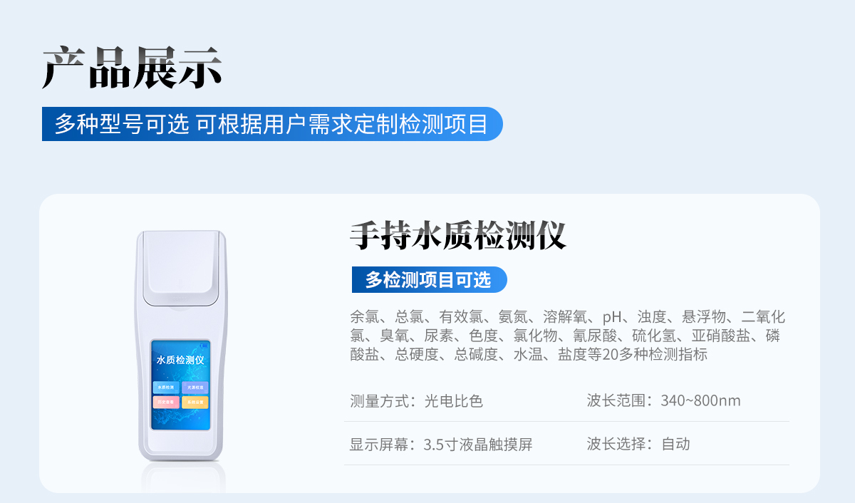 適用于純凈水廠、自來水廠、生活污水處理廠、工業(yè)污水、水產(chǎn)養(yǎng)殖、河流監(jiān)測、游泳場館、水源保護、生產(chǎn)監(jiān)測、科研實驗等。
