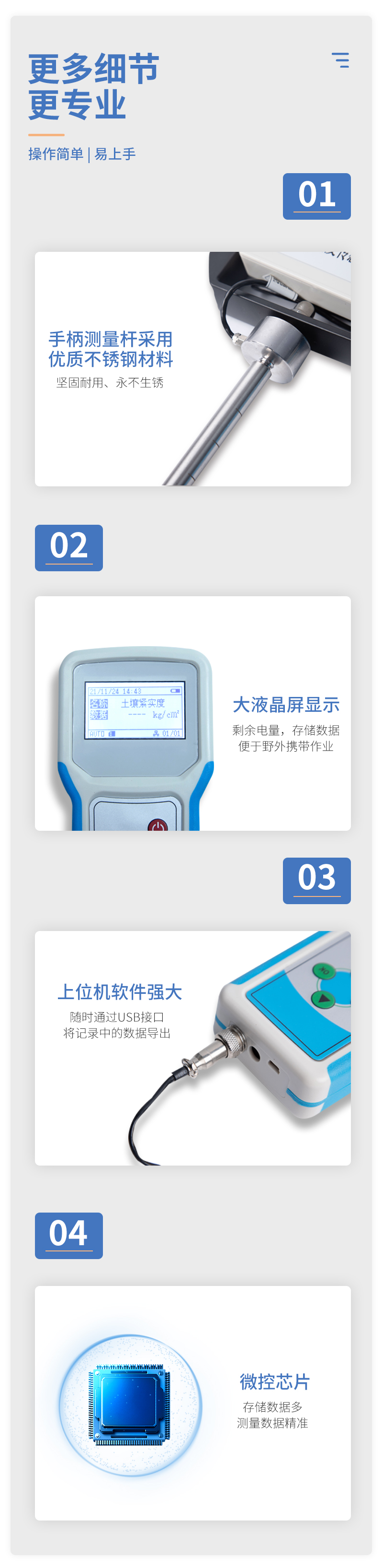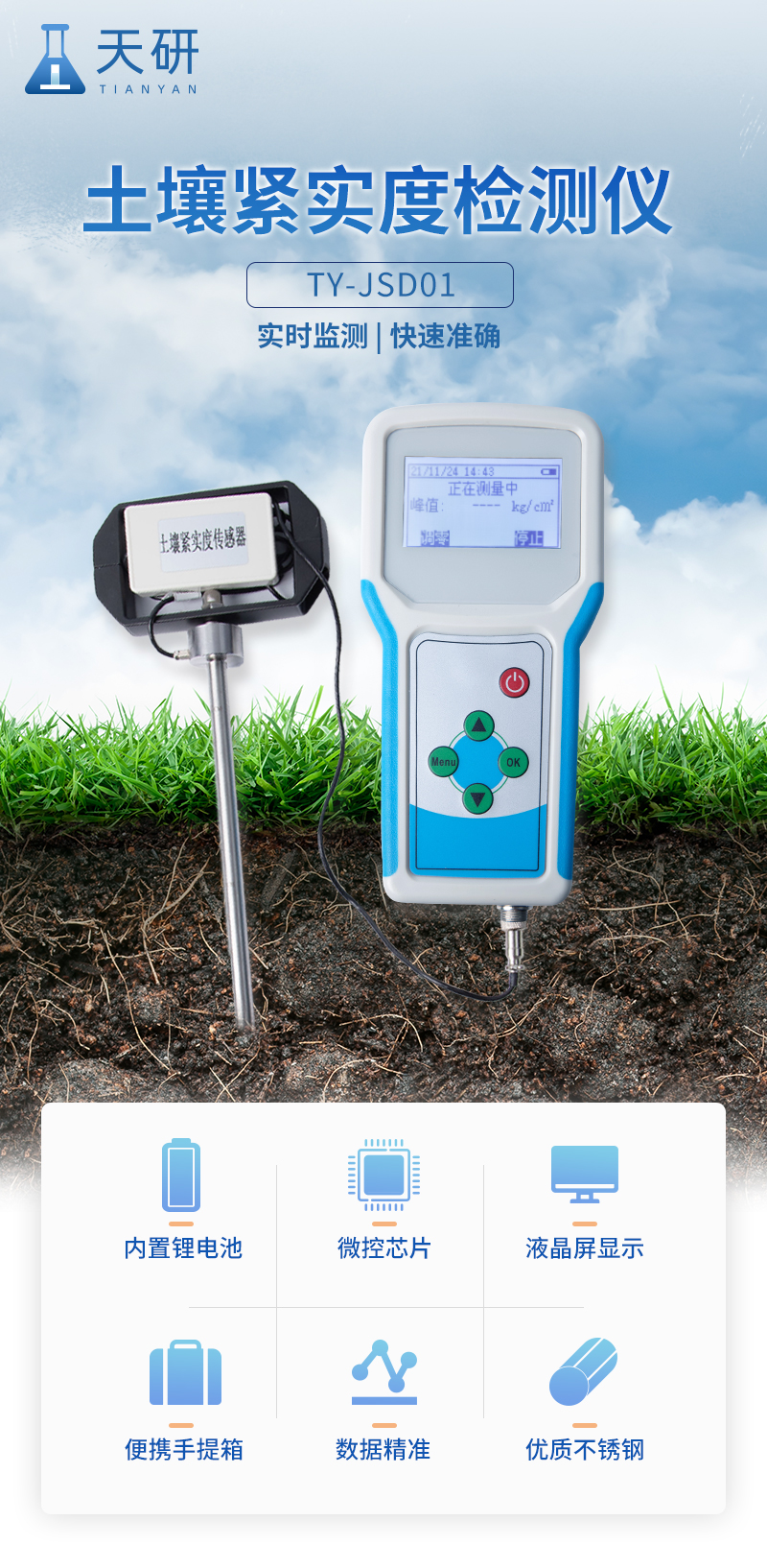本設(shè)備是一種由手持式采集儀和緊實(shí)度傳感器所組成的一套土壤墑情監(jiān)測系統(tǒng)。同時具備操作簡便,攜帶方便,檢測迅速可靠等優(yōu)點(diǎn),在領(lǐng)域中可謂獨(dú)樹一幟。手持式采集儀可根據(jù)用戶需要出廠配置GPS、GPRS數(shù)據(jù)上傳等功能,設(shè)備中的數(shù)據(jù)也可以通過USB數(shù)據(jù)線連接電腦,并將歷史數(shù)據(jù)導(dǎo)出到電腦中進(jìn)行數(shù)據(jù)分析。