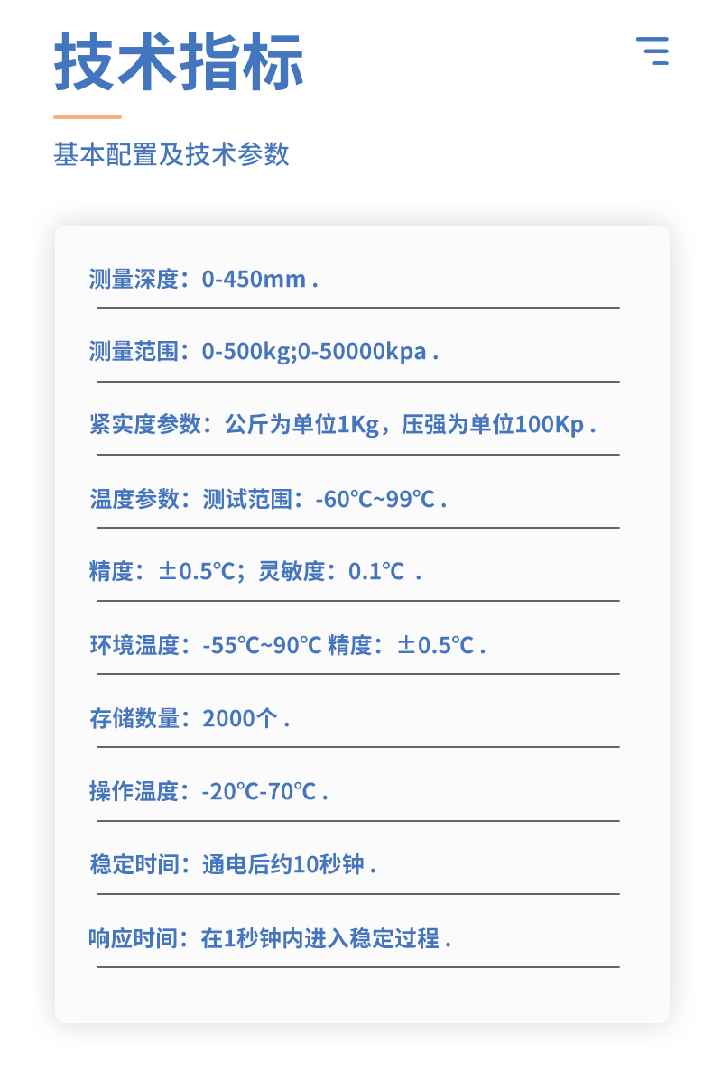 | 顯示屏:2.4英寸彩色TFT液晶 | 接口:電源接頭:5.5*2.5/2.1;USB接口:連接電腦;航空插頭:RS485 | 存儲:大容量FLASH存儲器;可存儲10萬條數(shù)據(jù);自動存儲:1S~180S可調(diào) | 定位:GPS | GSM上傳:GPRS/2G/4G | 電池:12V 2500mah鋰電池;工作時間:10H;充電時間:3H | 導(dǎo)出:USB線連接電腦上位機(jī),導(dǎo)出Excel表格 | 單位:kg/cm2;LB;N/cm2;Kpa | 土壤緊實(shí)度傳感器: | 量程:0~100kg | 靈敏度:2.0±0.1mv/V | 綜合精度:0.1%F?S | 重復(fù)性:±0.05%F?S | 工作溫度:-20~﹢70℃ | 探針材質(zhì):不銹鋼 | 輸入阻抗:735 ±35Ω | 輸出阻抗:700±3Ω | 非線性:±0.05 %F?S | 密封等級:IP66 | 激勵電壓:5~12 VDC | 線纜:φ3×2000mm |
