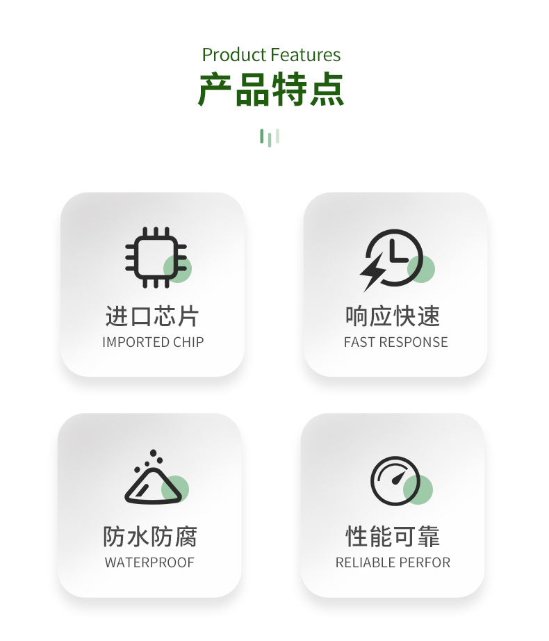| (1)土壤含水率、電導(dǎo)率以及溫度三參數(shù)合一。 | (2)也可用于水肥一體溶液、以及其他營養(yǎng)液與基質(zhì)的電導(dǎo)率。 | (3)電極采用特殊處理的合金材料,可承受較強(qiáng)的外力沖擊,不易損壞。 | (4)完全密封,耐酸堿腐蝕,可埋入土壤或直接投入水中進(jìn)行長期動態(tài)檢測。 | (5)精度高,響應(yīng)快,互換性好,探針插入式設(shè)計(jì)保證測量**,性能可靠。 | (6)完善的保護(hù)電路與多種信號輸出接口可選。 |