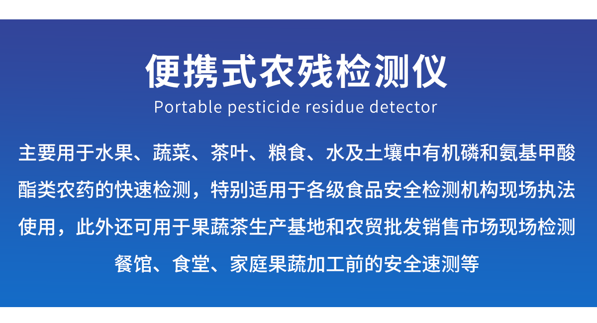 主要用于水果、蔬菜、茶葉、糧食、水及土壤中有機(jī)磷和氨基甲酸酯類農(nóng)藥的快速檢測(cè),特別適用于各級(jí)食品安全檢測(cè)機(jī)構(gòu)現(xiàn)場(chǎng)執(zhí)法使用,此外還可用于果蔬茶生產(chǎn)基地和農(nóng)貿(mào)批發(fā)銷售市場(chǎng)現(xiàn)場(chǎng)檢測(cè),餐館、食堂、家庭果蔬加工前的安全速測(cè)等