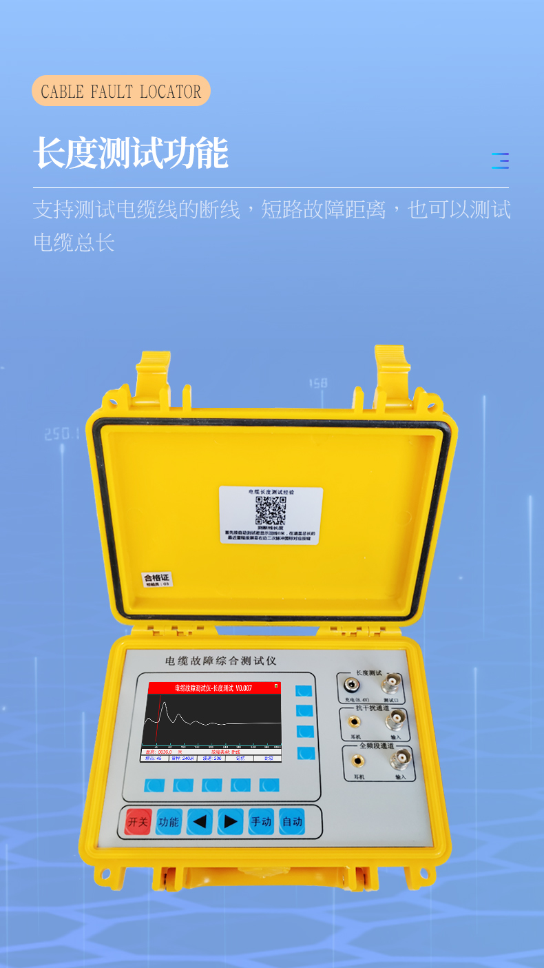 產(chǎn)品概述: 本測試儀主要用于10KV等級(可拓展至50kv)以內(nèi)的高低壓地埋電力電纜的斷線、短路、對地漏電故障( 對地絕緣電阻在0.5兆歐以內(nèi))的定位及地埋電纜深度、路徑走向的探測 適用于路燈電纜維護、農(nóng)田水澆地電纜故障查修、小區(qū)物業(yè)及園林綠化帶地埋鎧甲鐵皮電力電纜、野外動力電纜、高速公