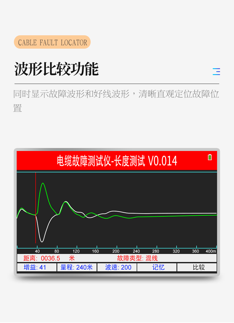 | 1.480*800大屏幕真彩手機細膩屏在陽光下也能清晰可辨。 | 2.自帶數(shù)據(jù)接口,支持客戶遠程升級。 | 3.采用ARM CPU配合FPGA技術,可快速準確判斷故障波形。 | 4.波形比較功能,特別適用于線路某點氧化造成后端電壓 | 低故障的測試定位。 | 5.簡潔的對應功能按鍵易學易會直觀方便。 | 6.高能量鋰電池,使用時間可達6-8小時。 | 7.信號器自帶萬用表功能方便測試電壓電阻及絕緣。 |