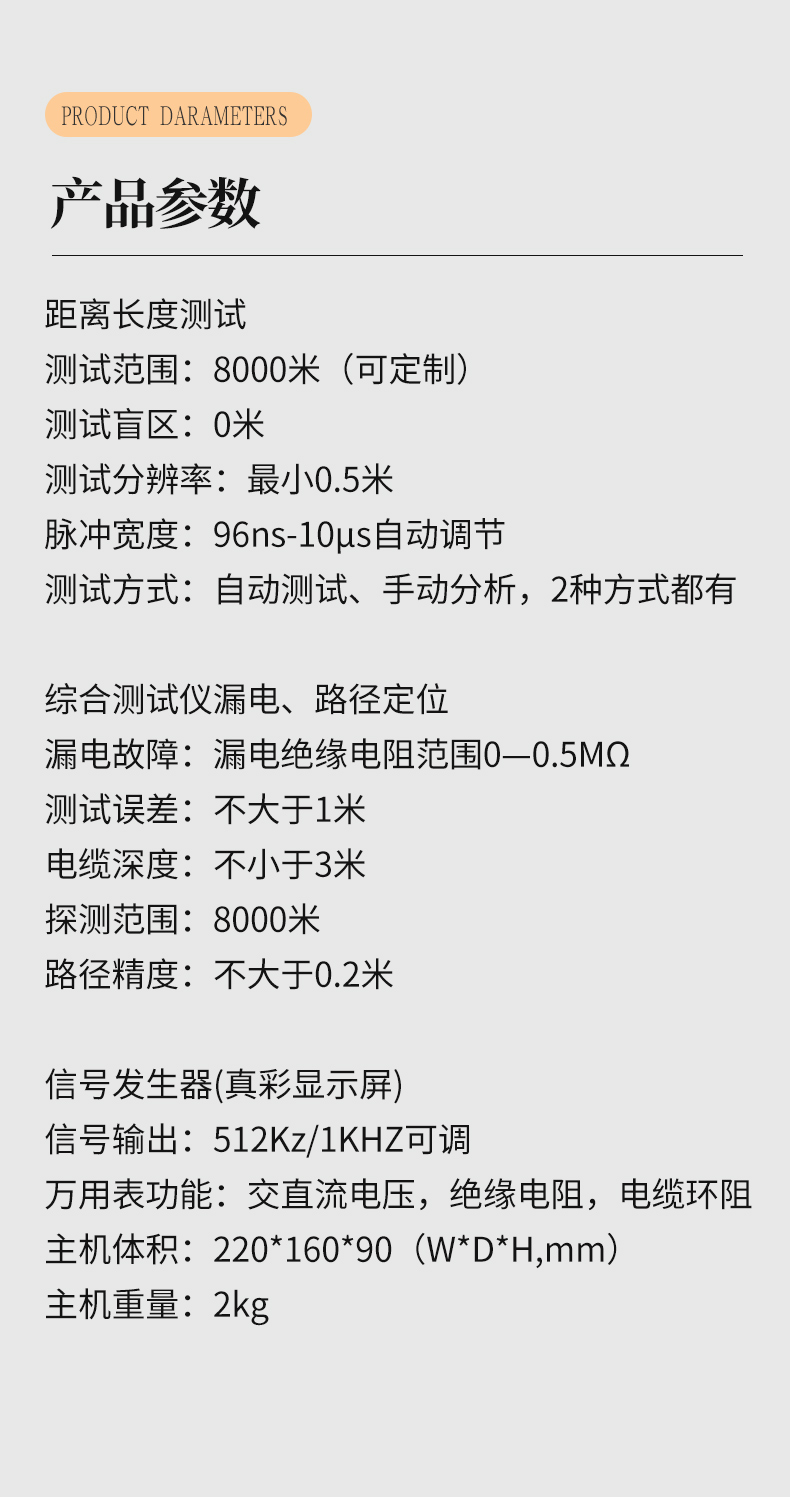 | 綜合測試儀距離長度測試: | 測試范圍: 8000米(可定制) | 測試盲區(qū): 0米 | 測試分辨率:*小0.5米 | 脈沖寬度: 96ns-10μs自動調(diào)節(jié) | 測試方式:自動測試、手動分析,2種方式都有 | 綜合測試儀漏電、路徑定位: | 漏電故障:漏電絕緣電阻范圍0-0.5MΩ | 測試誤差:不大于1米 | 電纜深度:不小于3米 | 探測范圍: 8000米 | 路徑精度:不大于0.2米. | 信號發(fā)生器(真彩顯示屏) : | 信號輸出:1KHZ可調(diào) | 萬用表功能:交直流電壓、絕緣電阻、電纜環(huán)阻 | 主機體積: 220*1 60*90 (W*D*H, mm) | 主機重量: 2kg |
