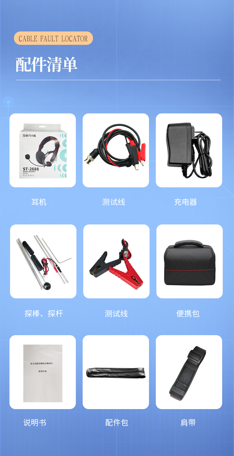 | 測試儀主機........... 1臺 | 信號發(fā)生器........... 1臺 | 測試耳機.............. 1個 | 專用充電器........... 2個 | 路徑探頭...............1付 | 漏電探桿.............. 1付 | 長度測試線(信號器連接線..與長度測試通用)......1條 | 接地釬.................. 1個 | 儀器包.................. 2個 | 說明書.................. 1個 | 合格證保修卡.........1組 |