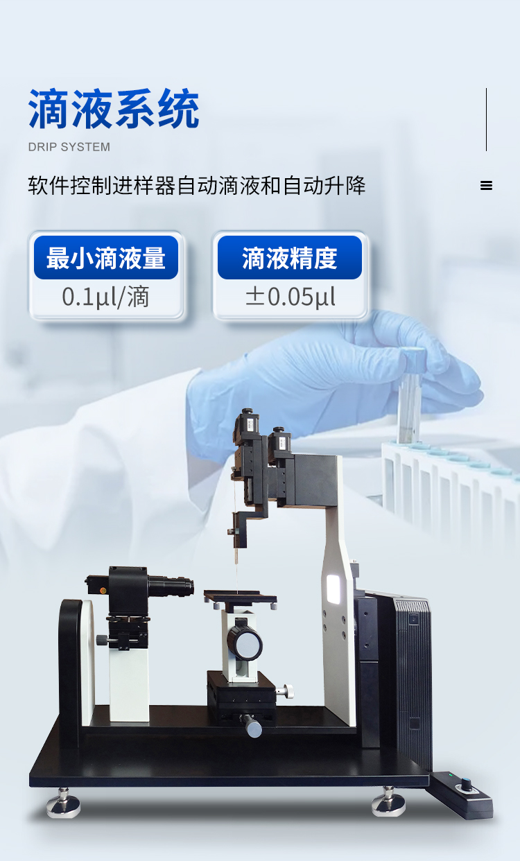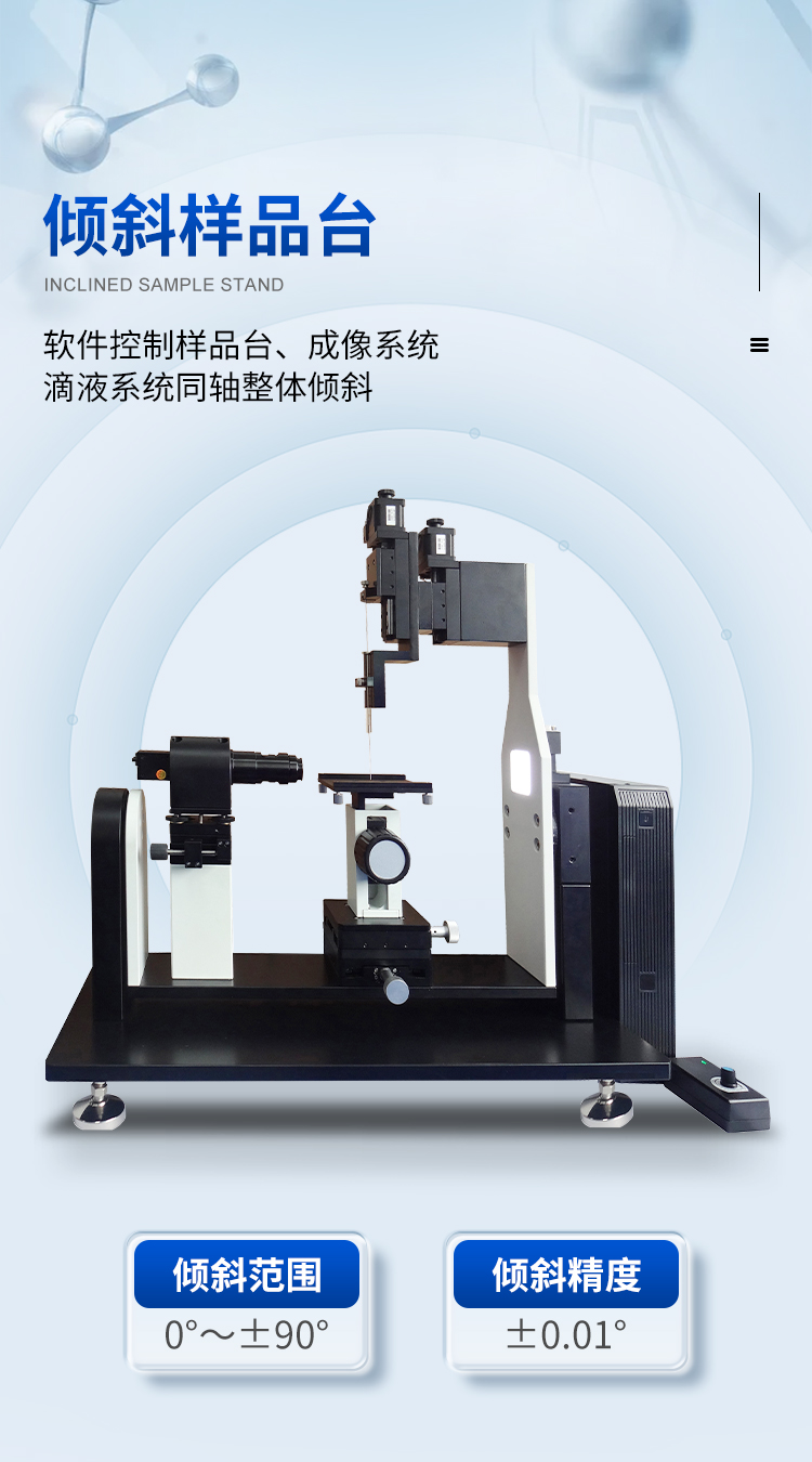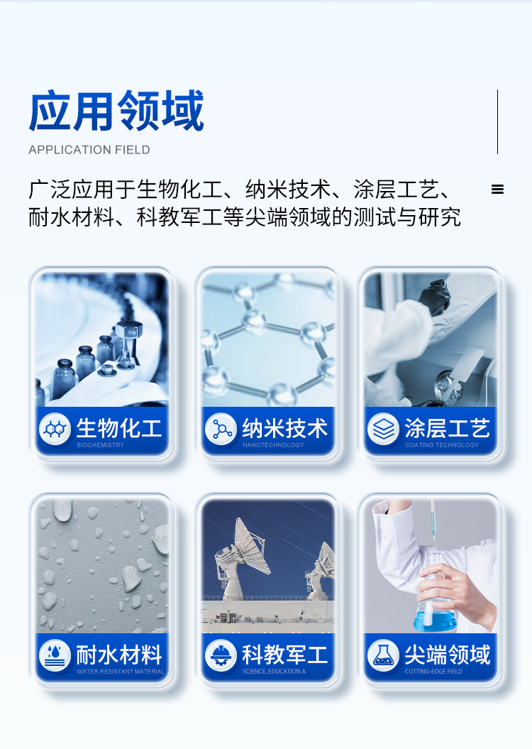 本機(jī)除了利用停滴法測試靜態(tài)接觸角外,更側(cè)重于利用傾斜板法測試和分析動(dòng)態(tài)接觸角(包括前進(jìn)接觸角、后退接觸角和滾動(dòng)角);同時(shí)也可以測試液體表面張力、估算固體表面能和分析潤濕性。廣泛應(yīng)用于生物化工、納米技術(shù)、涂層工藝、耐水材料、科教軍工等尖端領(lǐng)域的測試與研究。