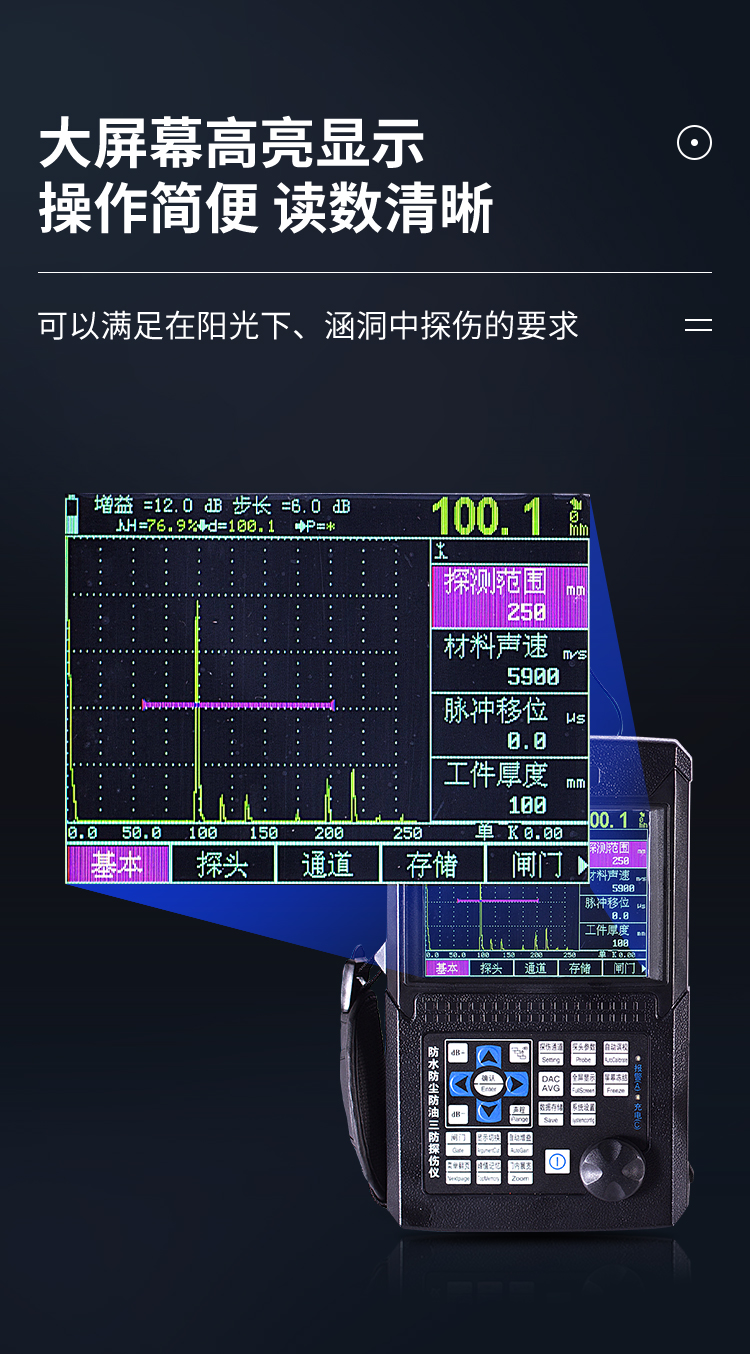 | 按鍵簡(jiǎn)潔,操作簡(jiǎn)單; | 大屏幕高亮顯示,可以滿足在陽光下、涵洞中探傷的要求。 |
