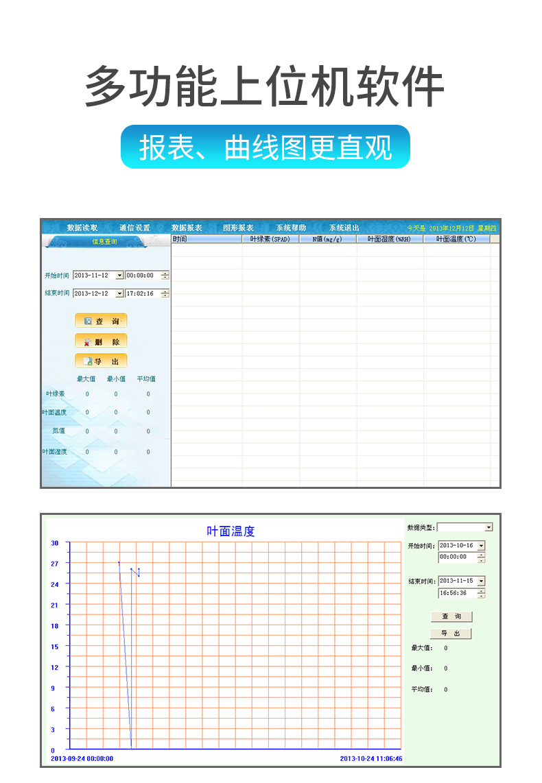 | 快速無損植物活體檢測(cè),不影響植物成長(zhǎng)。 | 一次操作可同時(shí)測(cè)定所有參數(shù),實(shí)時(shí)顯示。 | 氮,葉綠素,葉溫三種參數(shù)同一屏幕同時(shí)顯示,且可同時(shí)儲(chǔ)存 | 歷史數(shù)據(jù)查看,即可順序查看。 | 測(cè)量數(shù)據(jù)可連接計(jì)算機(jī)將測(cè)量數(shù)據(jù)導(dǎo)出,便于植物養(yǎng)分的管理和分析。 | 歷史數(shù)據(jù)查看,即可順序查看,也可跳轉(zhuǎn)查看。 | 意外斷電后已保存在主機(jī)里的數(shù)據(jù)不丟失。 | 對(duì)于歷史數(shù)據(jù)可以一鍵式全部刪除。 | 可連接計(jì)算機(jī)將測(cè)量數(shù)據(jù)導(dǎo)出,便于植物養(yǎng)分的管理和分析。 | 使用鋰電池供電,帶背光功能。 | 每種參數(shù)的報(bào)表、曲線圖均可選擇時(shí)段查詢查看。 | 可將存儲(chǔ)記錄的數(shù)據(jù)以EXCEL格式備份保存,方便以后調(diào)用。 | 可將存儲(chǔ)記錄的數(shù)據(jù)曲線圖以BMP圖片格式備份保存,方便以后調(diào)用。 |