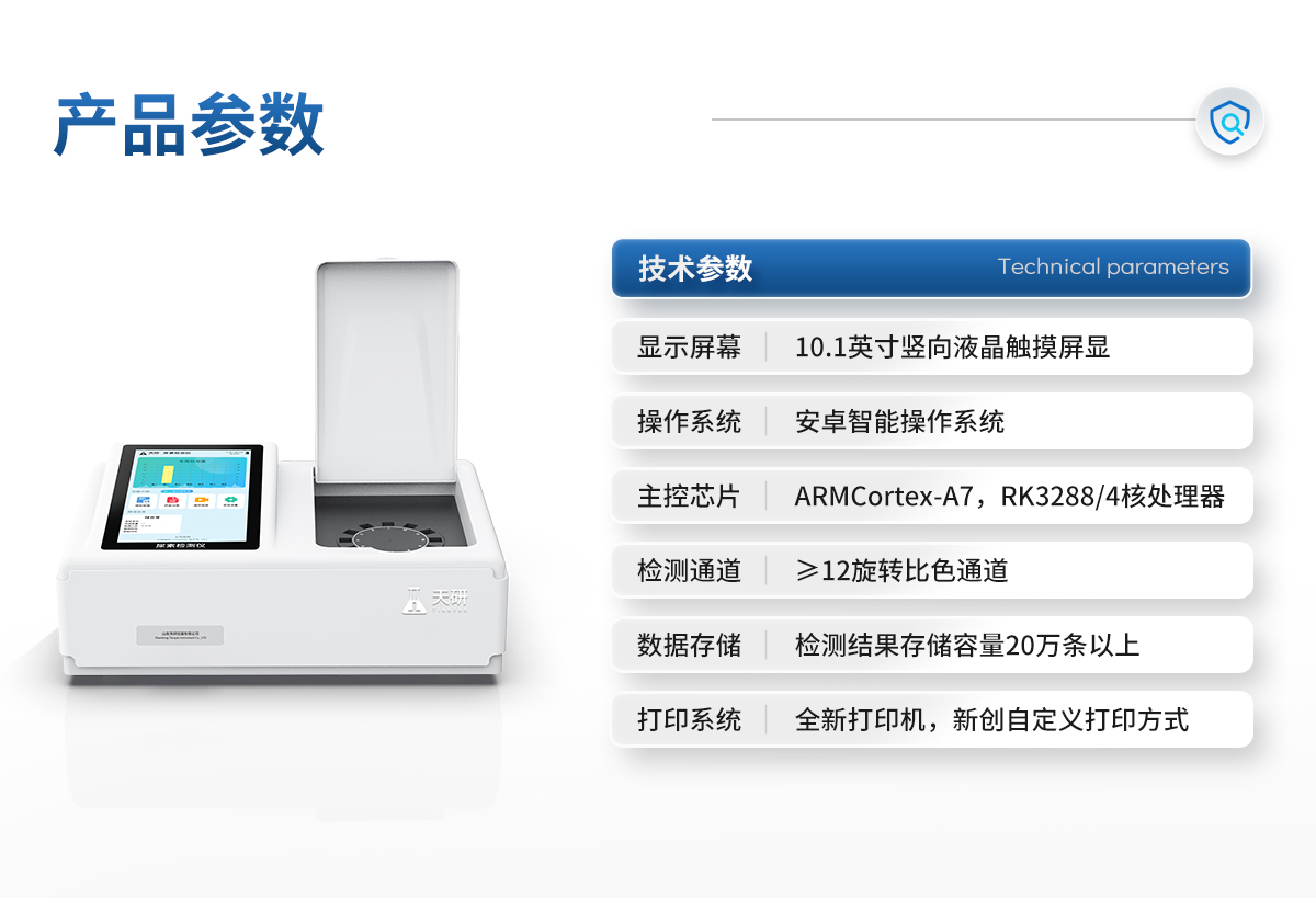 | 儀器采用臺(tái)式一體化系統(tǒng)檢測(cè)技術(shù),將分光光度模塊、數(shù)字化管理模塊、無(wú)線通訊模塊高度集成于一體,可支持檢測(cè)60種食品安全檢測(cè)項(xiàng)目,同時(shí)預(yù)留升級(jí)檢測(cè)方法。 | 儀器檢測(cè)模塊標(biāo)準(zhǔn)化、智能化,檢測(cè)項(xiàng)目可隨意自由組合。檢測(cè)箱體內(nèi)置多個(gè)標(biāo)準(zhǔn)檢測(cè)單元,檢測(cè)模塊可以調(diào)整配置。 | 顯示屏幕:儀器采用10.1英寸豎向液晶觸摸屏顯,搭配運(yùn)行安卓智能操作系統(tǒng),主控芯片采用ARM Cortex-A7,RK3288/4核處理器,主頻1.88Ghz,操作方便,性能更強(qiáng)。 | 檢測(cè)通道:≥12通道;采用精密旋轉(zhuǎn)比色池設(shè)計(jì),使用同芯片同光源校準(zhǔn)精度,解決不同光源之間的誤差值,更加準(zhǔn)確**。(1-12通道間誤差0.1%,**號(hào):ZL202022821055.2) | 儀器光源:高精度進(jìn)口四波長(zhǎng)冷光源,每個(gè)通道均配置 410、520、590、630nm 波長(zhǎng)光源,標(biāo)配**的光路切換裝置,**光路切換功能可實(shí)現(xiàn)64波長(zhǎng),并且所有檢測(cè)項(xiàng)目可實(shí)現(xiàn)所有通道同時(shí)檢測(cè)。 | 設(shè)備可一鍵校準(zhǔn),自動(dòng)保存校準(zhǔn)數(shù)據(jù),自動(dòng)對(duì)比校驗(yàn),得到精準(zhǔn)光源,采用Android SP存儲(chǔ)數(shù)據(jù),光源數(shù)據(jù)永不丟失,方便每一次使用。 | 通訊接口:配備無(wú)線通信模塊、4G(APN)通訊模塊、藍(lán)牙傳輸,同時(shí)具有雙USB接口以及RJ45網(wǎng)線接口,可以多方式實(shí)現(xiàn)數(shù)據(jù)保存及數(shù)據(jù)傳輸。 | 存儲(chǔ)方式:支持U盤(pán)存儲(chǔ),標(biāo)準(zhǔn)USB接口,免驅(qū)動(dòng)安裝。檢測(cè)結(jié)果存儲(chǔ)容量20萬(wàn)條以上,可生成Excel表格進(jìn)行拷貝,并具有登錄保護(hù)功能。 | 智能化操作系統(tǒng): | 便捷操作系統(tǒng):設(shè)備檢測(cè)時(shí)可在同一檢測(cè)界面自動(dòng)對(duì)應(yīng)相關(guān)檢測(cè)通道一次性選擇1-12個(gè)樣品名稱,無(wú)須退出界面,節(jié)省操作時(shí)間。 | 數(shù)據(jù)集成系統(tǒng):設(shè)備首頁(yè)自動(dòng)統(tǒng)計(jì)檢測(cè)數(shù)據(jù)包含:周檢測(cè)數(shù)據(jù)、月檢測(cè)數(shù)據(jù),全部檢測(cè)總數(shù)量,均包含檢測(cè)總數(shù),合格數(shù),不合格數(shù),以及相關(guān)柱形分析圖,對(duì)各項(xiàng)檢測(cè)數(shù)據(jù)清晰掌握,無(wú)需電腦查詢,更加快捷直觀。 | 數(shù)據(jù)庫(kù)系統(tǒng):十幾項(xiàng)數(shù)據(jù)庫(kù)分類管理儀器:包含項(xiàng)目類型、項(xiàng)目數(shù)據(jù)、檢測(cè)數(shù)據(jù)、歷史記錄、國(guó)標(biāo)信息、曲線信息、采樣信息、檢測(cè)信息、受檢信息、復(fù)核信息、圖表信息、光源校準(zhǔn)信息、打印樣式信息、樣品庫(kù)信息等等,數(shù)據(jù)庫(kù)之間互相協(xié)調(diào)聯(lián)動(dòng)保證數(shù)據(jù)的真實(shí)完整性。同時(shí)產(chǎn)品數(shù)據(jù)庫(kù)以及歷史檢測(cè)記錄支持一鍵檢索功能。 | 限量規(guī)判系統(tǒng):具有限量查詢、添加物質(zhì)合規(guī)判定系統(tǒng)。檢測(cè)出結(jié)果后,系統(tǒng)自動(dòng)調(diào)用系統(tǒng)數(shù)據(jù)庫(kù)中相關(guān)國(guó)標(biāo)進(jìn)行比對(duì)判定,客觀顯示判定結(jié)果是否合格。 | 項(xiàng)目預(yù)設(shè)系統(tǒng):儀器具有任務(wù)預(yù)設(shè)模塊,一鍵提前預(yù)設(shè),給出方便快捷的新檢測(cè)方案,每一個(gè)任務(wù)分別可以設(shè)置不同的樣品、批次、編號(hào)、來(lái)源、備注、抽樣信息、檢測(cè)信息、受檢信息、復(fù)核信息等更多信息。樣品送檢時(shí)一鍵調(diào)取保存信息,并可多次調(diào)取,大大提高檢測(cè)效率。 | 數(shù)據(jù)監(jiān)管系統(tǒng):同步對(duì)接監(jiān)管平臺(tái),數(shù)據(jù)可局域網(wǎng)和互聯(lián)網(wǎng)數(shù)據(jù)上傳,檢測(cè)結(jié)果可選擇直接傳至食品安全監(jiān)管平臺(tái)。進(jìn)行區(qū)域食品安全監(jiān)管及大數(shù)據(jù)分析處理與數(shù)據(jù)統(tǒng)計(jì),檢測(cè)區(qū)域食品安全長(zhǎng)短期動(dòng)態(tài),達(dá)到食品安全問(wèn)題預(yù)估、預(yù)警。 | 全新打印系統(tǒng):內(nèi)置全新打印機(jī),新創(chuàng)自定義打印方式,可按需靈活勾選控制:二維碼,抽樣信息、檢測(cè)信息,受檢信息、復(fù)核信息、抽樣日期、檢測(cè)日期等信息的打印。 | A4紙版本報(bào)告打印功能(可選配):設(shè)備擁有兩種結(jié)果展示方式,可以自動(dòng)生成A4打印模板和小票打印模板兩種樣式,可通過(guò)WiFi及網(wǎng)線等方式鏈接外置打印機(jī)可進(jìn)行打印。 | 供電模式:儀器交直流兩用,直流12V供電,可連接車載電源,可配6ah大容量充電鋰電池,電量可實(shí)時(shí)顯示,方便戶外流動(dòng)測(cè)試。 | 儀器具備遠(yuǎn)程升級(jí)功能,可定向分客戶分儀器更新,開(kāi)機(jī)后自動(dòng)更新,并可持續(xù)性免費(fèi)更新系統(tǒng)版本,無(wú)需像傳統(tǒng)產(chǎn)品返廠更新,節(jié)省時(shí)間及人力成本并避免了物流運(yùn)輸返廠升級(jí)導(dǎo)致設(shè)備損壞的潛在風(fēng)險(xiǎn)。 |
