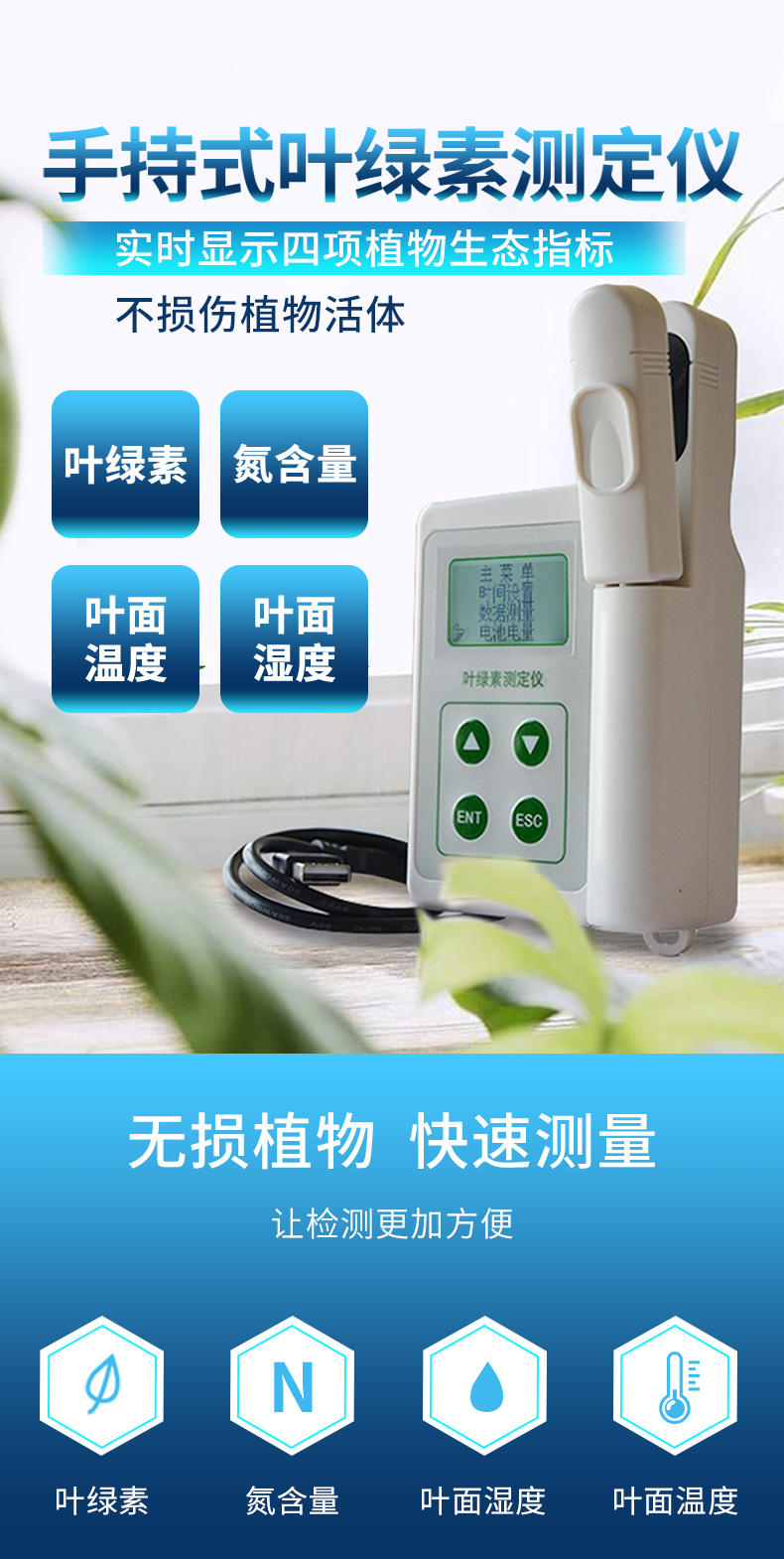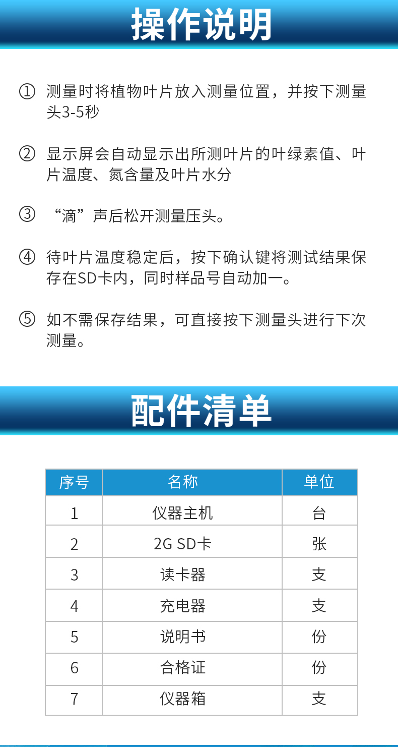 | 測(cè)量對(duì)象:陸地植物葉片 | 測(cè)量原理: 650nm和940nm兩種波長(zhǎng)下光密度差 | 測(cè)量范圍 0.0-99.9 SPAD | 測(cè)量面積 2mm*3mm | 測(cè)量精度 ±1.0 SPAD單位以內(nèi) (室溫下,SPAD值介乎0-50) | 重復(fù)性 ±0.3 SPAD單位以內(nèi) (SPAD值介乎0-50,保持測(cè)量位置不變) | 測(cè)量時(shí)間間隔 小于2秒 | 測(cè)量面積:2mm*2mm | 測(cè)量時(shí)間間隔:小于3秒 | 內(nèi)存 內(nèi)存16GB,可計(jì)算/顯示平均值,以及刪除異常值 | 樣品厚度** 1 mm | 樣品插入深度 10 mm | 電源 4.2V可充電鋰電池 | 電池容量 2000mah | 重量 250g | 外形尺寸 140×85×45mm(長(zhǎng)×寬×高) | 操作溫度/濕度范圍:0 - 50°C,相對(duì)濕度85% | 儲(chǔ)存溫度/濕度范圍:20 - 55°C,相對(duì)濕度85% | 標(biāo)準(zhǔn)配置:主機(jī), 充電器,USB數(shù)據(jù)線,便攜鋁箱,說明書等 |