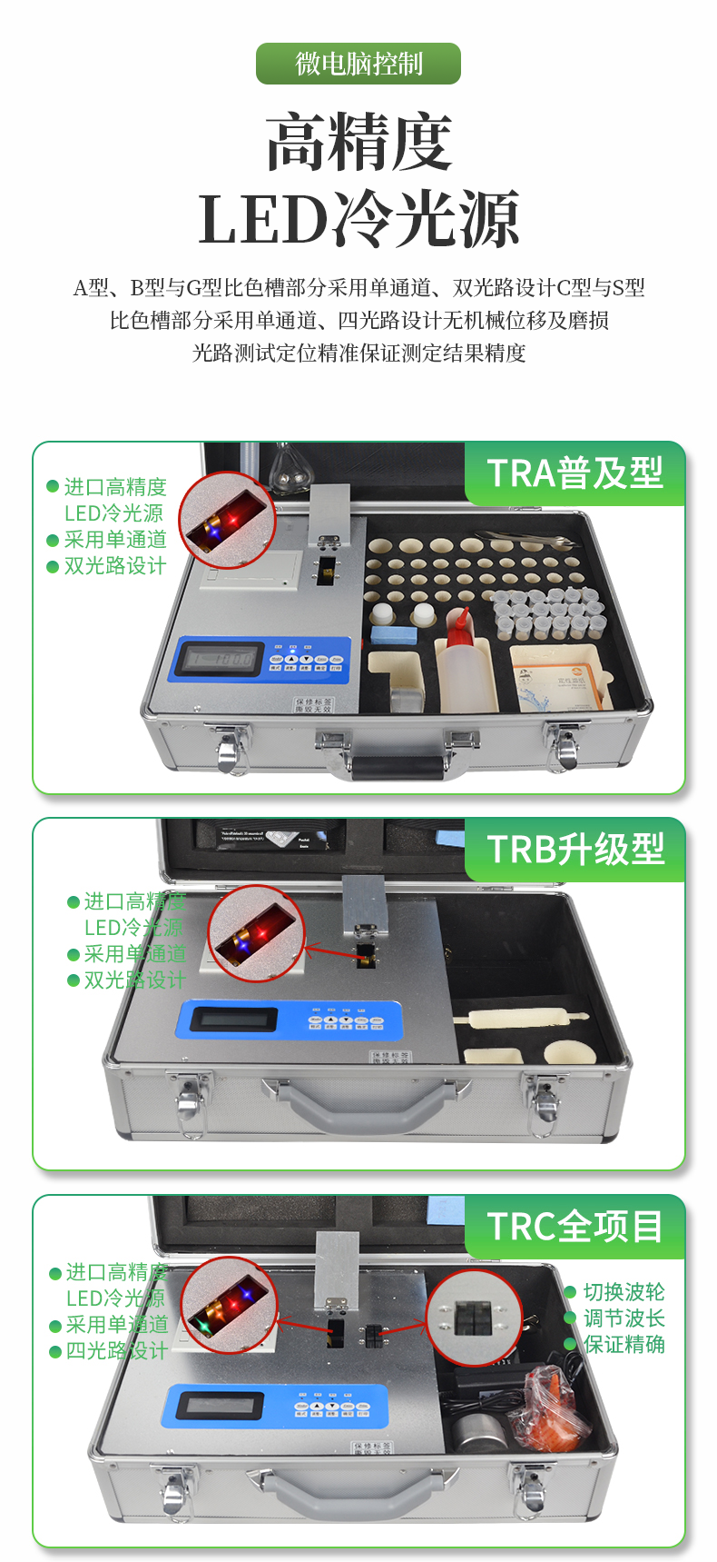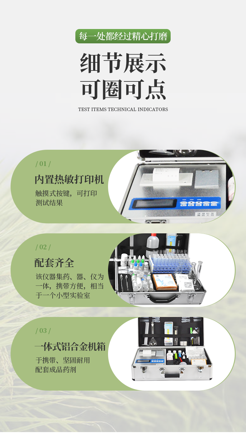 | 1、《機(jī)箱/藥劑一體式鋁合金機(jī)箱》設(shè)計(jì),便于攜帶、堅(jiān)固耐用,配套成品藥劑。 | 2、微電腦控制,數(shù)字化線路、程序化設(shè)計(jì),液晶顯示,交直流兩用,可野外流動測試,**程度降低操作者的失誤和勞動強(qiáng)度。 | 3、分辨率:0.001,觸摸式按鍵,內(nèi)置熱敏打印機(jī),可打印測試結(jié)果。 | 4、可檢測土壤及化肥、有機(jī)肥、植株中的速效氮、有效磷、速效鉀、全氮、全磷、全鉀、有機(jī)質(zhì)含量,土壤酸堿度,含鹽量,以及土壤鈣、鎂、硫、硼、氯、硅等6種中微量元素。 | 5、采用高亮度 LED 燈作為光源, 硅半導(dǎo)體作為信號接收系統(tǒng), 壽命長達(dá)10萬小時級別。光源穩(wěn)定,一致性好。 | 6、比色槽部分采用單通道、雙光路設(shè)計(jì),無機(jī)械位移及磨損,光路測試定位**,保證測定結(jié)果精度。 |
