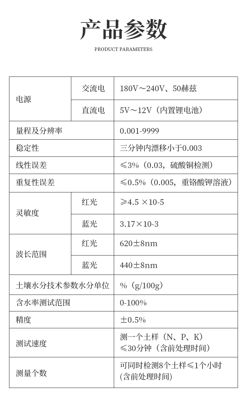 | 1.電源:交流電:180V~240V、50赫茲;直流電:12V+5V(可接車載電源) | 2.量程及分辨率:0.001-9999 | 3.穩(wěn)定性:三分鐘內(nèi)漂移小于0.003 | 4.線性誤差:≤3%(0.03,硫酸銅檢測) | 5.重復(fù)性誤差:≤0.5%(0.005,重鉻酸鉀溶液) | 6.靈敏度:紅光≥4.5 ×10-5 藍(lán)光≥3.17×10-3 | 7.波長范圍:紅光620±8nm 藍(lán)光440±8nm | 8.土壤水分技術(shù)參數(shù)水分單位:﹪(g/100g)含水率測試范圍:0-100﹪ 精度:±0.5﹪ | 9.土壤中速效N、P、K三種養(yǎng)分一次性同時浸提測定、科學(xué)推薦施肥量 | 10. 肥料中氮(N)、磷(P)、鉀(K)等養(yǎng)分同時、快速、準(zhǔn)確檢測 | 11.測試速度:測一個土樣(N、P、K)≤30分鐘(含前處理時間) | 12 .可同時檢測8個土樣≤1個小時(含前處理時間) | 13. 數(shù)據(jù)打印:內(nèi)置高檔一鍵式熱敏打印機(jī)(國內(nèi)首家**設(shè)計(jì)) (**號:ZL 2018 2 1777724.7) |