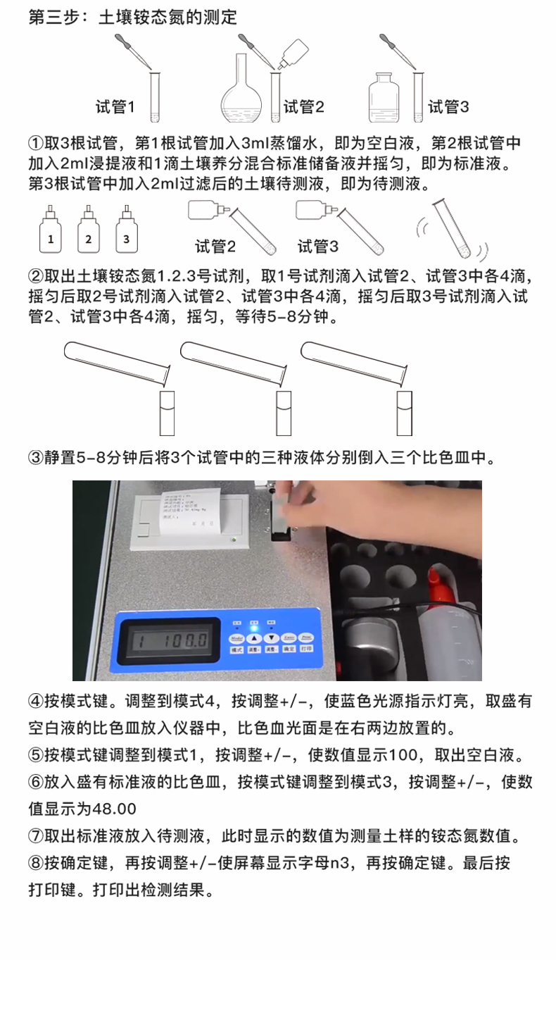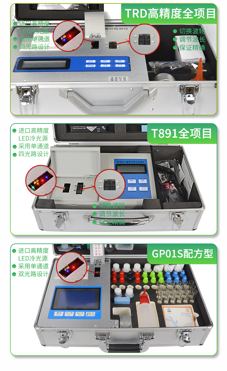 | 配套齊全:該儀器集藥、器、儀為一體,攜帶方便,相當(dāng)于一個小型實(shí)驗(yàn)室。適于農(nóng)業(yè)服務(wù)部門或農(nóng)資經(jīng)銷商、肥料廠商測土施肥和鑒別肥料真假。 | 操作簡便、速度快捷,成品藥劑開瓶即用,無須配置。 | 性能可靠:工作穩(wěn)定性優(yōu)于國家標(biāo)準(zhǔn)JJG179-90指標(biāo)的6倍,重復(fù)性達(dá)到光柵型分光光度計(jì)指標(biāo)水平。 |