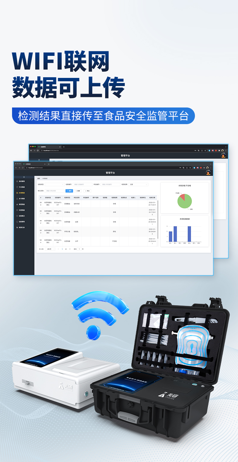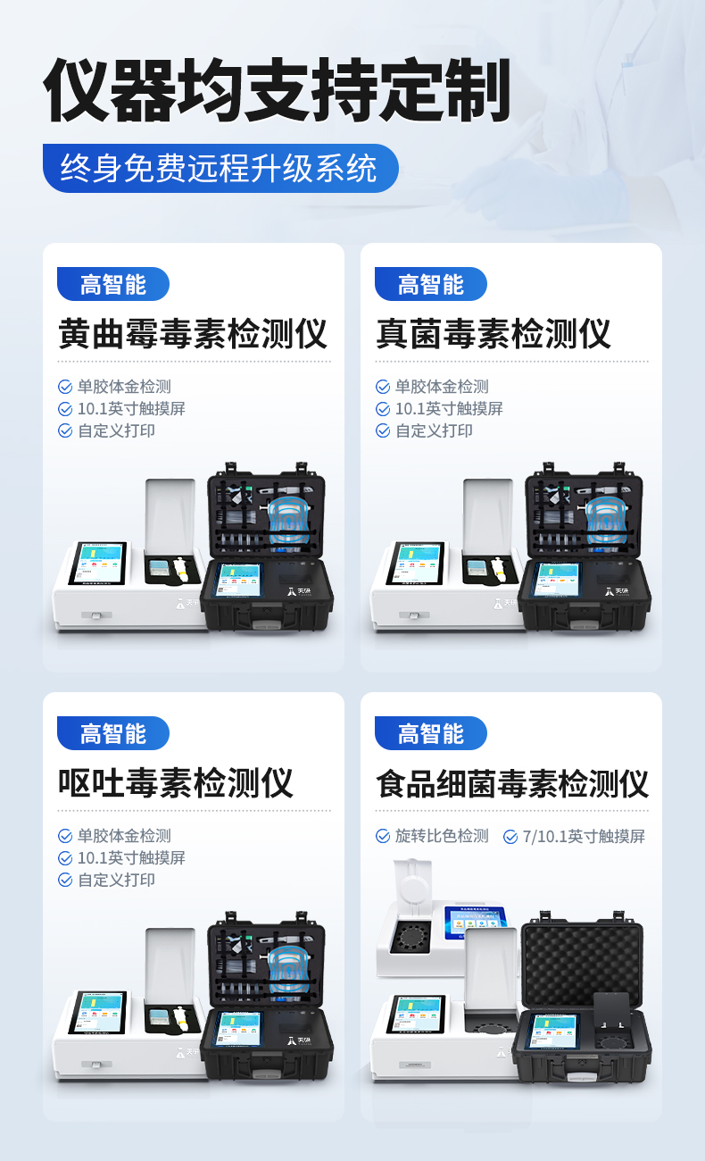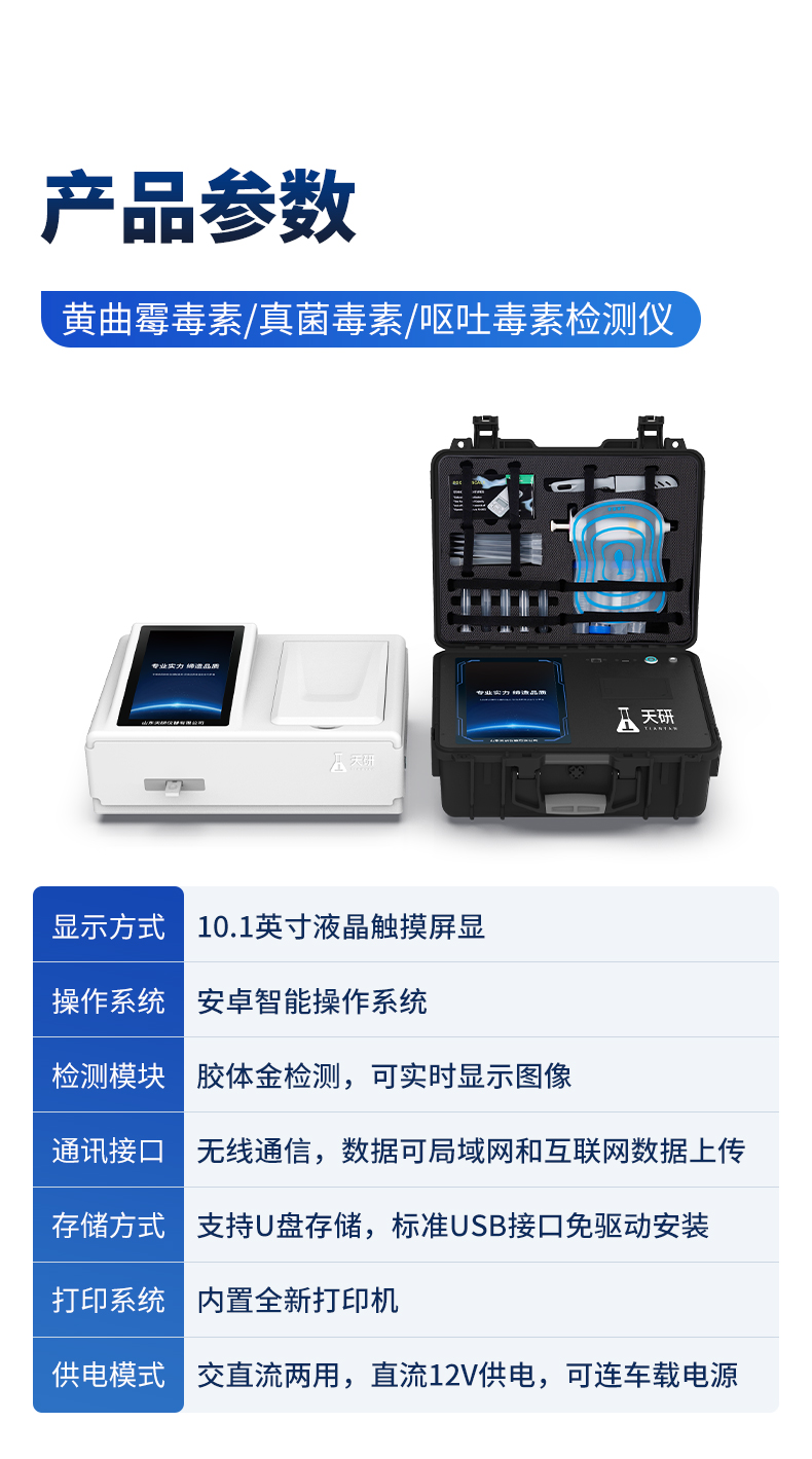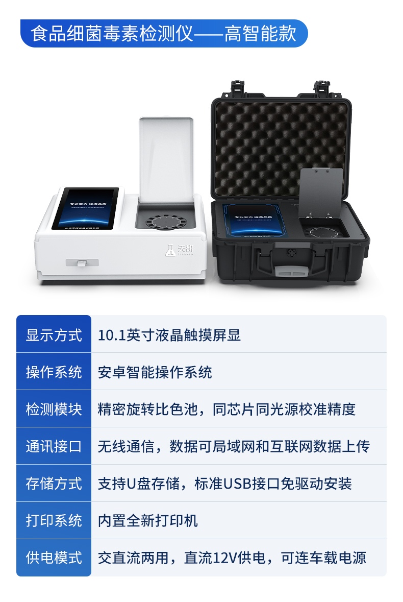 | 1、儀器采用10.1英寸液晶觸摸屏顯,搭配運行安卓智能操作系統(tǒng),主控芯片采用ARM Cortex-A7,RK3288/4核處理器,主頻1.88Ghz,運轉(zhuǎn)速度更快速,性能更強。 | 2、儀器功能包括:膠體金檢測模塊、數(shù)字化管理模塊、無線通訊模塊等,可以滿足同一軟件下實現(xiàn)所有檢測項目的檢測,并在同一窗口展示檢測結(jié)果。 | 3.一體化臺式快檢設(shè)備,采用交直流兩用供電方式,可連接車載電源,配備6ah大容量充電鋰電池,可以滿足現(xiàn)場及流動檢測使用的需求。儀器尺寸:43×35×20cm, 主機凈重:5.1kg | 4、系統(tǒng)自帶數(shù)據(jù)集成模塊,設(shè)備首頁自動統(tǒng)計檢測數(shù)據(jù)包含:周檢測數(shù)據(jù)、月檢測數(shù)據(jù),全部檢測總數(shù)量,均包含檢測總數(shù),合格數(shù),不合格數(shù),以及相關(guān)柱形分析圖,對各項檢測數(shù)據(jù)清晰掌握,無需電腦查詢,更加快捷直觀。 | 5、儀器具有任務(wù)預設(shè)模塊,可在樣品送檢前提前預設(shè)樣品名稱、檢測指標、送檢單位等信息,樣品送檢時一鍵調(diào)取保存信息,檢測更加方便快捷。 | 6、膠體金檢測模塊: | 直插式自動掃描方式,可實時顯示金標卡實時圖像,系統(tǒng)自動分析并呈現(xiàn)出CT曲線圖,CT線自動識別,無需手動調(diào)整,完成檢測后自動退出檢測卡。 | 結(jié)果判定線可修改,對照值標定值可保存,斷電不丟失數(shù)據(jù)。 | 兼容市場上其他膠體金卡,使用耗材不受限制,極大增強用戶使用體驗。 | 7、儀器檢測系統(tǒng)擁有龐大數(shù)據(jù)庫,并且構(gòu)建了完善的檢索、修訂功能。食品庫涵蓋多種樣品名稱,可按需添加或刪除、編輯樣品名稱;產(chǎn)品數(shù)據(jù)庫以及歷史檢測記錄支持一鍵檢索功能。 | 8、系統(tǒng)打印自定義化,打印格式多樣化,產(chǎn)品合格證(國家標準要求),二維碼,抽樣信息、檢測信息,受檢信息、復核信息、抽樣日期、檢測日期等信息結(jié)果,可按需求自行設(shè)置打印內(nèi)容。 | 9、A4紙版本報告打印功能(可選配):設(shè)備擁有兩種結(jié)果展示方式,可以自動生成A4打印模板和小票打印模板兩種樣式,可通過WiFi及網(wǎng)線等方式鏈接外置打印機可進行打印 | 10、儀器具有 wifi 聯(lián)網(wǎng)上傳、RJ45網(wǎng)線連接功能,可以快速上傳數(shù)據(jù)。同步對接監(jiān)管平臺,數(shù)據(jù)可局域網(wǎng)和互聯(lián)網(wǎng)數(shù)據(jù)上傳,檢測結(jié)果直接傳至食品安全監(jiān)管平臺。進行區(qū)域食品安全監(jiān)管及大數(shù)據(jù)分析處理與數(shù)據(jù)統(tǒng)計,檢測區(qū)域食品安全長短期動態(tài),達到食品安全問題預估、預警。 | 11、設(shè)備支持U盤存儲,標準USB接口,免驅(qū)動安裝。檢測結(jié)果存儲容量20萬條以上,可生成Excel表格,進行一鍵拷貝,并具有登錄保護功能,可設(shè)置用戶名及密碼,規(guī)范不同人員操作權(quán)限,防止非工作人員操作,并且可以進行重新校準、鎖定、恢復出廠設(shè)置功能。儀器固件可升級,后期檢測項目可擴充。 | 12、儀器具備遠程升級功能,可定向分客戶分儀器更新,開機后自動更新,并可持續(xù)性免費更新系統(tǒng)版本,無需像傳統(tǒng)產(chǎn)品返廠更新,節(jié)省時間及人力成本并避免了物流運輸返廠升級導致設(shè)備損壞的潛在風險。 |