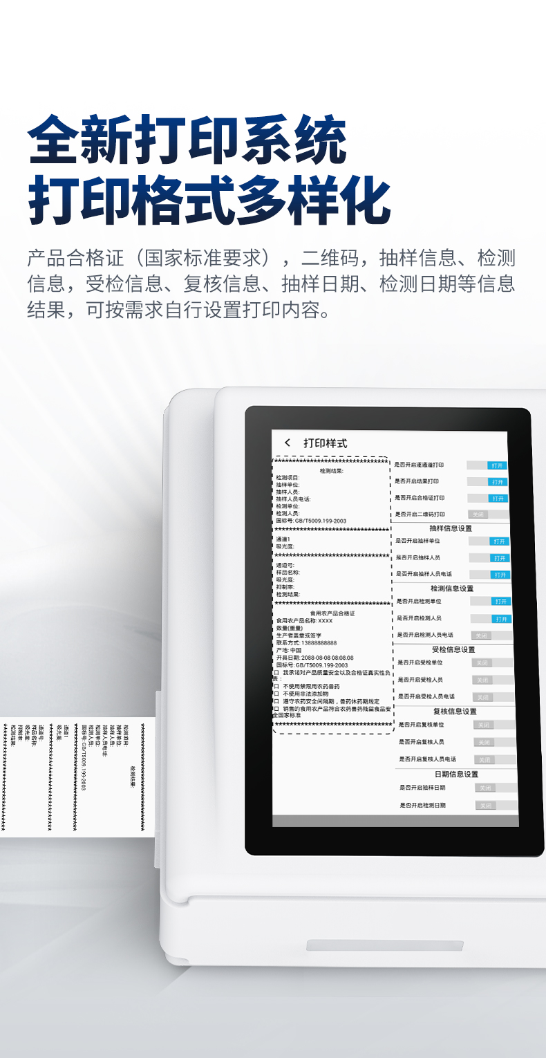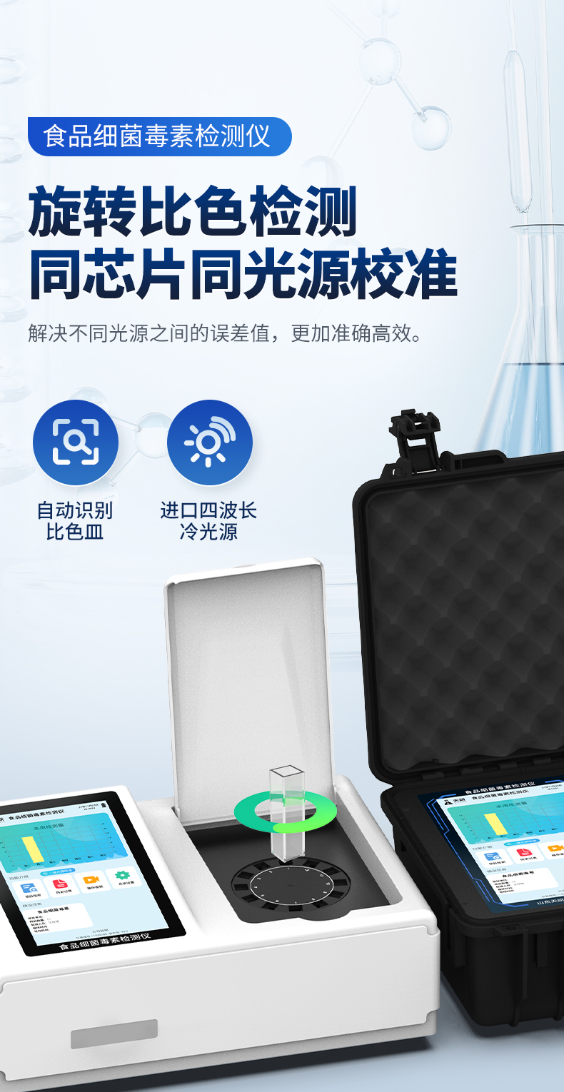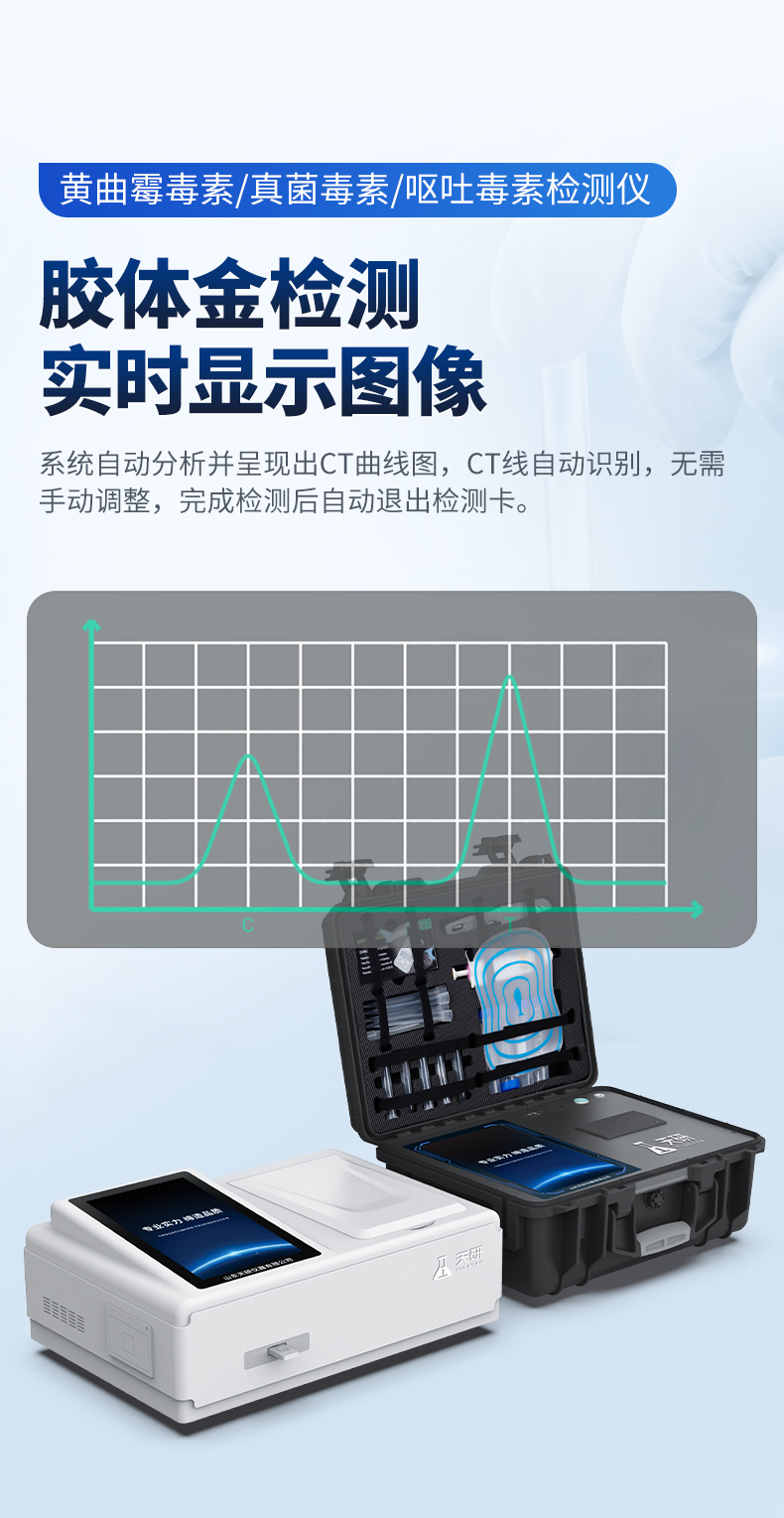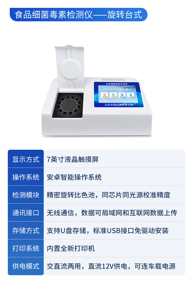 | 1、儀器采用10.1英寸液晶觸摸屏顯,搭配運行安卓智能操作系統(tǒng),主控芯片采用ARM Cortex-A7,RK3288/4核處理器,主頻1.88Ghz,運轉(zhuǎn)速度更快速,性能更強。 | 2、儀器功能包括:膠體金檢測模塊、數(shù)字化管理模塊、無線通訊模塊等,可以滿足同一軟件下實現(xiàn)所有檢測項目的檢測,并在同一窗口展示檢測結(jié)果。 | 3.一體化臺式快檢設(shè)備,采用交直流兩用供電方式,可連接車載電源,配備6ah大容量充電鋰電池,可以滿足現(xiàn)場及流動檢測使用的需求。儀器尺寸:43×35×20cm, 主機凈重:5.1kg | 4、系統(tǒng)自帶數(shù)據(jù)集成模塊,設(shè)備首頁自動統(tǒng)計檢測數(shù)據(jù)包含:周檢測數(shù)據(jù)、月檢測數(shù)據(jù),全部檢測總數(shù)量,均包含檢測總數(shù),合格數(shù),不合格數(shù),以及相關(guān)柱形分析圖,對各項檢測數(shù)據(jù)清晰掌握,無需電腦查詢,更加快捷直觀。 | 5、儀器具有任務(wù)預設(shè)模塊,可在樣品送檢前提前預設(shè)樣品名稱、檢測指標、送檢單位等信息,樣品送檢時一鍵調(diào)取保存信息,檢測更加方便快捷。 | 6、膠體金檢測模塊: | 直插式自動掃描方式,可實時顯示金標卡實時圖像,系統(tǒng)自動分析并呈現(xiàn)出CT曲線圖,CT線自動識別,無需手動調(diào)整,完成檢測后自動退出檢測卡。 | 結(jié)果判定線可修改,對照值標定值可保存,斷電不丟失數(shù)據(jù)。 | 兼容市場上其他膠體金卡,使用耗材不受限制,極大增強用戶使用體驗。 | 7、儀器檢測系統(tǒng)擁有龐大數(shù)據(jù)庫,并且構(gòu)建了完善的檢索、修訂功能。食品庫涵蓋多種樣品名稱,可按需添加或刪除、編輯樣品名稱;產(chǎn)品數(shù)據(jù)庫以及歷史檢測記錄支持一鍵檢索功能。 | 8、系統(tǒng)打印自定義化,打印格式多樣化,產(chǎn)品合格證(國家標準要求),二維碼,抽樣信息、檢測信息,受檢信息、復核信息、抽樣日期、檢測日期等信息結(jié)果,可按需求自行設(shè)置打印內(nèi)容。 | 9、A4紙版本報告打印功能(可選配):設(shè)備擁有兩種結(jié)果展示方式,可以自動生成A4打印模板和小票打印模板兩種樣式,可通過WiFi及網(wǎng)線等方式鏈接外置打印機可進行打印 | 10、儀器具有 wifi 聯(lián)網(wǎng)上傳、RJ45網(wǎng)線連接功能,可以快速上傳數(shù)據(jù)。同步對接監(jiān)管平臺,數(shù)據(jù)可局域網(wǎng)和互聯(lián)網(wǎng)數(shù)據(jù)上傳,檢測結(jié)果直接傳至食品安全監(jiān)管平臺。進行區(qū)域食品安全監(jiān)管及大數(shù)據(jù)分析處理與數(shù)據(jù)統(tǒng)計,檢測區(qū)域食品安全長短期動態(tài),達到食品安全問題預估、預警。 | 11、設(shè)備支持U盤存儲,標準USB接口,免驅(qū)動安裝。檢測結(jié)果存儲容量20萬條以上,可生成Excel表格,進行一鍵拷貝,并具有登錄保護功能,可設(shè)置用戶名及密碼,規(guī)范不同人員操作權(quán)限,防止非工作人員操作,并且可以進行重新校準、鎖定、恢復出廠設(shè)置功能。儀器固件可升級,后期檢測項目可擴充。 | 12、儀器具備遠程升級功能,可定向分客戶分儀器更新,開機后自動更新,并可持續(xù)性免費更新系統(tǒng)版本,無需像傳統(tǒng)產(chǎn)品返廠更新,節(jié)省時間及人力成本并避免了物流運輸返廠升級導致設(shè)備損壞的潛在風險。 |