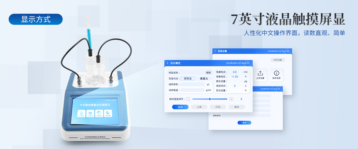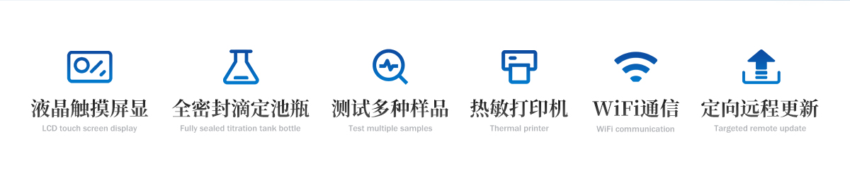 | 1.儀器主控芯片采用ARM Cortex-A7,RK3288/4核處理器,主頻1.88Ghz,運(yùn)轉(zhuǎn)速度更快速,穩(wěn)定性更強(qiáng)。 | 2.顯示方式:7英寸液晶觸摸屏顯示,人性化中文操作界面,讀數(shù)直觀、簡(jiǎn)單。 | 3.儀器采用全密封滴定池瓶,避免試劑與人接觸,杜絕環(huán)境濕度對(duì)檢測(cè)的影響;檢測(cè)過(guò)程中儀器自動(dòng)控制,攪拌、測(cè)定60秒左右完成,可直接顯示測(cè)定結(jié)果,無(wú)需人員頻繁操作。 | 4.儀器內(nèi)置操作視頻,可直接觀看學(xué)習(xí)操作方法。 | 5.儀器可以測(cè)試多種樣品,循環(huán)檢測(cè),即放即檢。 | 6.儀器可對(duì)樣品信息自由編輯,包括:樣品名稱、樣品編號(hào)、檢測(cè)單位、檢測(cè)人員、聯(lián)系方式、受檢單位等。 | 7.儀器可對(duì)檢測(cè)樣品測(cè)定信息進(jìn)行設(shè)置,例如:電解電流、電解電壓、微量水分含量、測(cè)定時(shí)間、百分含量、進(jìn)樣體積、試樣密度、毛重和皮重等。 | 8.水分檢測(cè)方式可根據(jù)實(shí)際需求選擇體積法或重量法。 | 9.內(nèi)置熱敏打印機(jī),可直接打印檢測(cè)結(jié)果,并可根據(jù)需求靈活設(shè)置打印內(nèi)容(二維碼,樣品編號(hào)、檢測(cè)單位、檢測(cè)人員、聯(lián)系電話、受檢單位、檢測(cè)日期等)。 | 10.樣品檢測(cè)結(jié)果可通過(guò)二維碼掃碼查看。 | 11.檢測(cè)數(shù)據(jù)可通過(guò)歷史記錄進(jìn)行檢索,通過(guò)設(shè)置檢測(cè)日期、樣品編號(hào)、檢測(cè)單位、檢測(cè)人員、樣品名稱、受檢單位等信息查找對(duì)應(yīng)數(shù)據(jù)。 | 12.儀器配備標(biāo)準(zhǔn)USB接口,免驅(qū)動(dòng)安裝。檢測(cè)結(jié)果存儲(chǔ)容量20萬(wàn)條以上,可生成Excel表格進(jìn)行拷貝。 | 13.儀器配備WiFi通信模塊,可上傳數(shù)據(jù)至云平臺(tái),實(shí)現(xiàn)電腦端數(shù)據(jù)查詢、瀏覽、分析、統(tǒng)計(jì)等。 | 14.儀器可定向遠(yuǎn)程更新,進(jìn)行升級(jí)維護(hù),無(wú)需返廠更新,節(jié)省時(shí)間及人力成本,避免了物流運(yùn)輸導(dǎo)致設(shè)備損壞的潛在風(fēng)險(xiǎn)。 |
