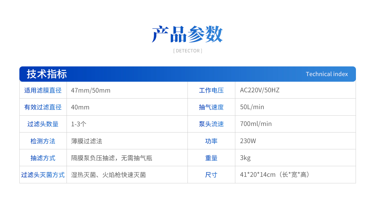 | 1、適用濾膜直徑:47mm/50mm 2、有效過濾直徑:40mm 3、過濾頭數(shù)量:1-3個; 4、檢測方法:薄膜過濾法 5、抽濾方式:隔膜泵負壓抽濾,無需抽氣瓶 6、過濾頭滅菌方式:濕熱滅菌、火焰槍快速滅菌 7、尺寸:41*20*14cm(長*寬*高) 8、重量:3kg 9、功率:230W 10、工作電壓:AC220V/50HZ 11、噪音小于30dB 12、物理按鈕開關 13、可選擇單頭、三頭結構,選型豐富 14、抽氣速度:50L/min 15、泵頭流速:700ml/min |
