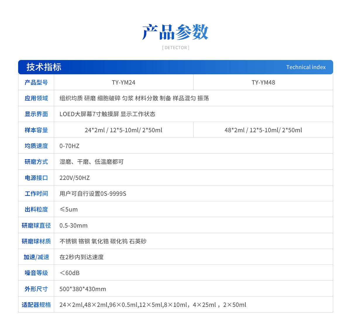 顯示界面:LOED大屏幕7寸觸摸屏 顯示工作狀態(tài) 樣本容量:24*2ml / 12*5-10ml/ 2*50ml 均質速度:0-70HZ 研磨方式:濕磨 干磨 低溫磨都可 電源接口:220V/50HZ 工作時間:用戶可自行設置0S-9999S 出料粒度:≤5um 研磨球直徑:0.5-30mm 研磨球材質:不銹鋼 鉻鋼 氧化鋯 碳化鎢 石英砂 加速減速:加速/減速 在2秒內到達速度 噪音等級:<60dB 外形尺寸:500*380*430mm 適配器規(guī)格:24×2ml,48×2ml,96×0.5ml,12×5ml,8×10ml,4×25ml ,2×50ml |